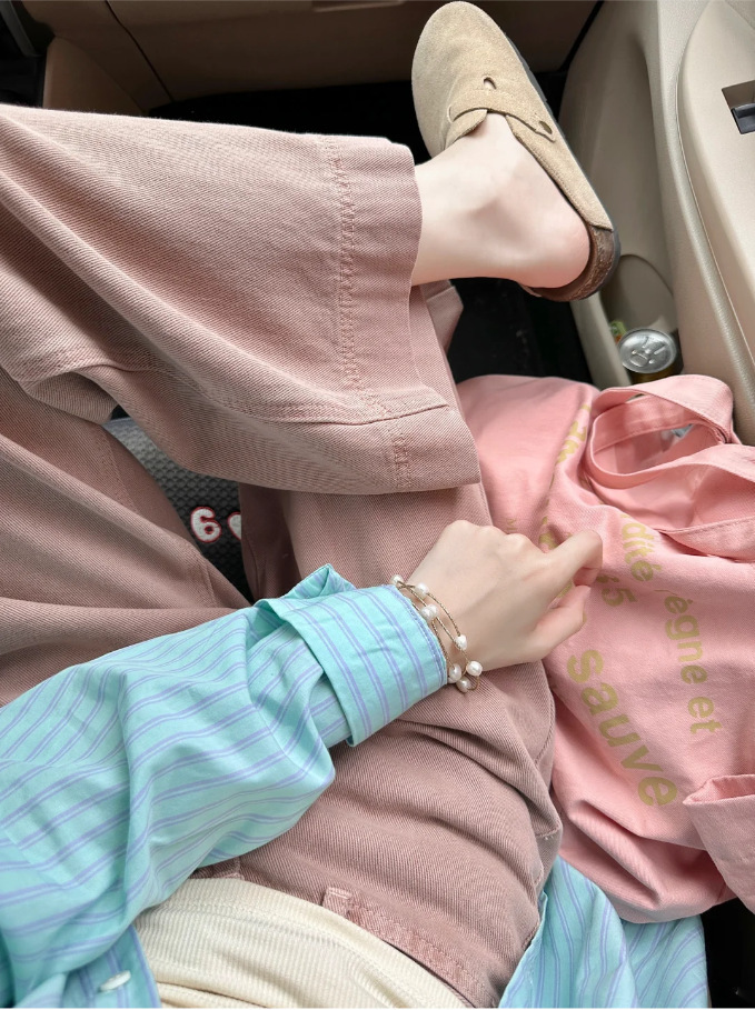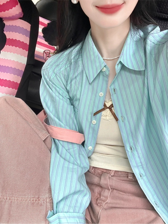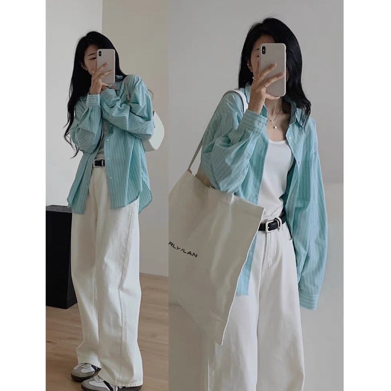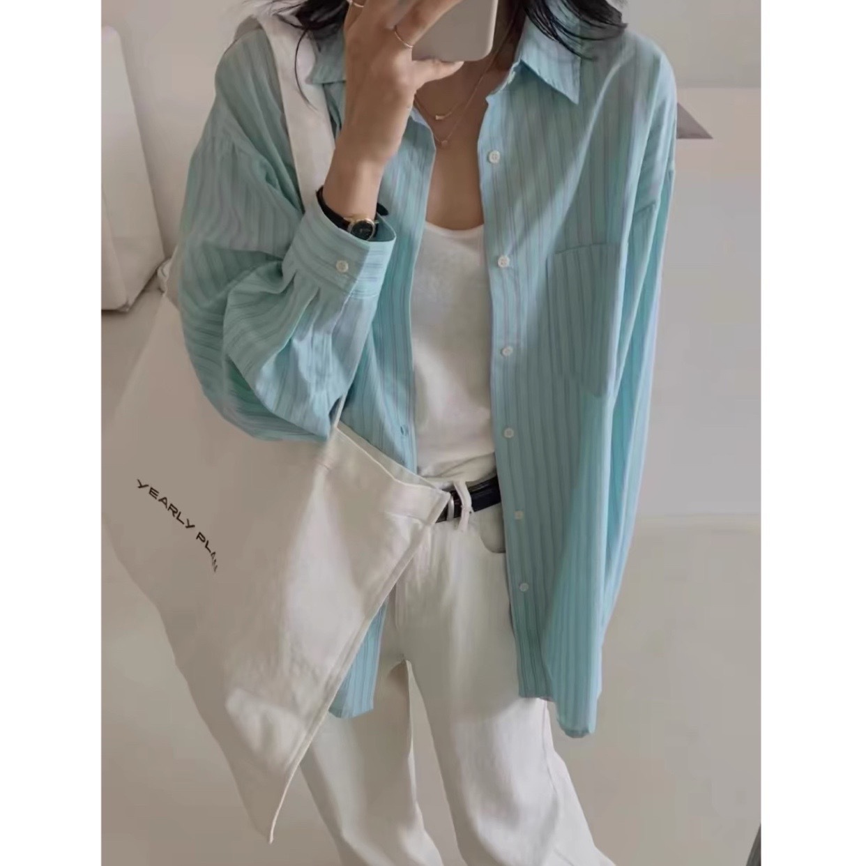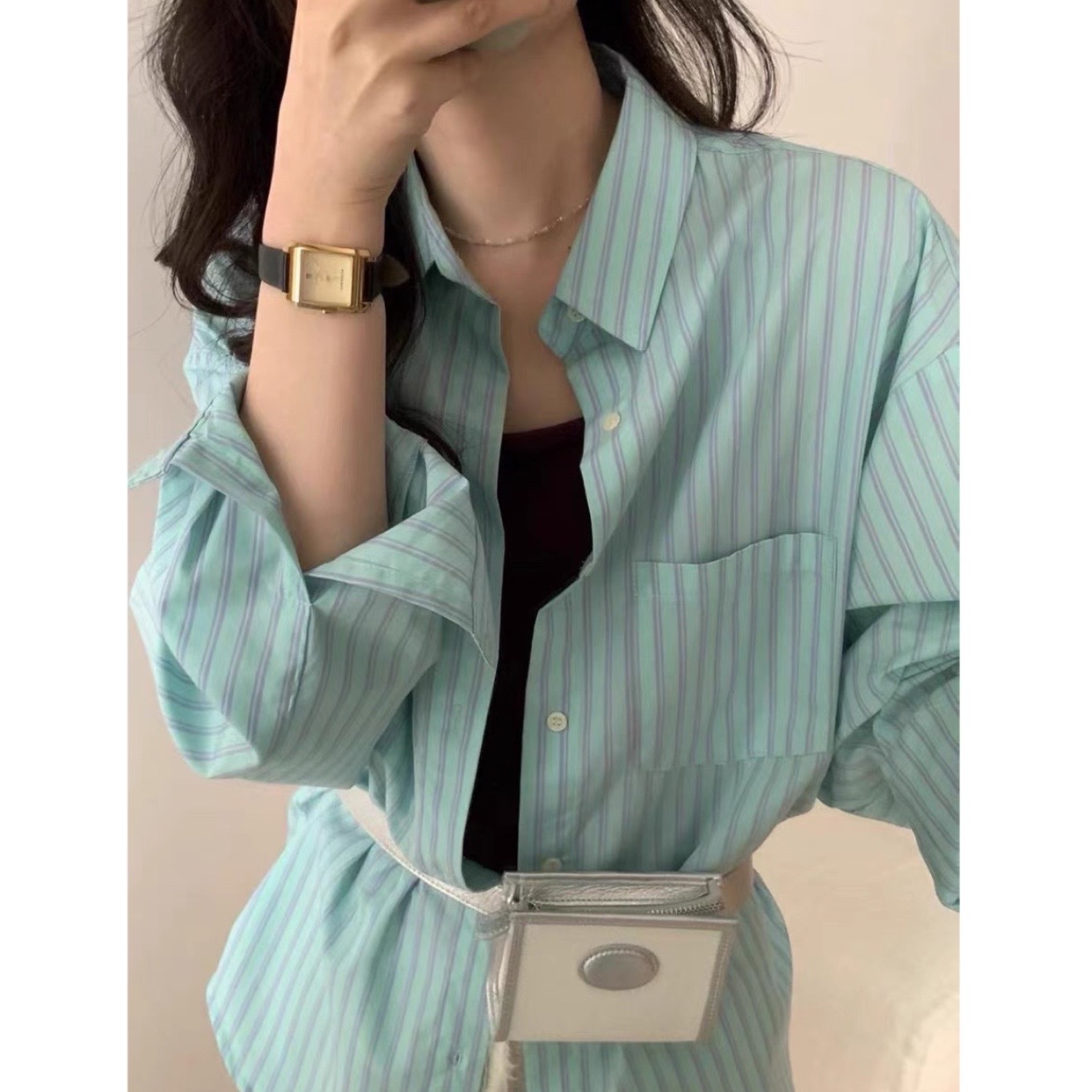 민트 블루 그린 스트라이프 셔츠 여성 봄, 여름 새로운 디자인 틈새 셔츠 레이어드 캐주얼 재킷스토어 가기