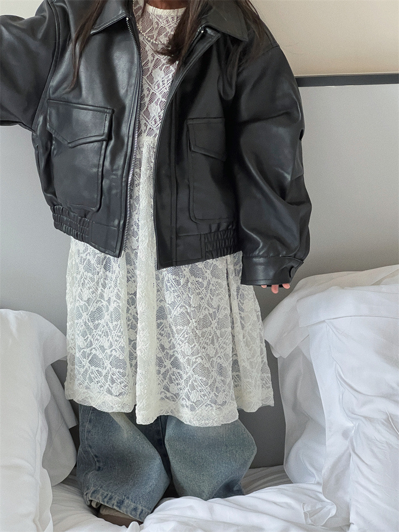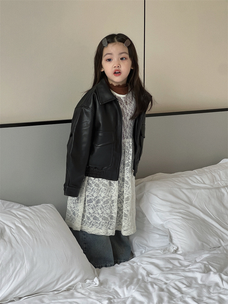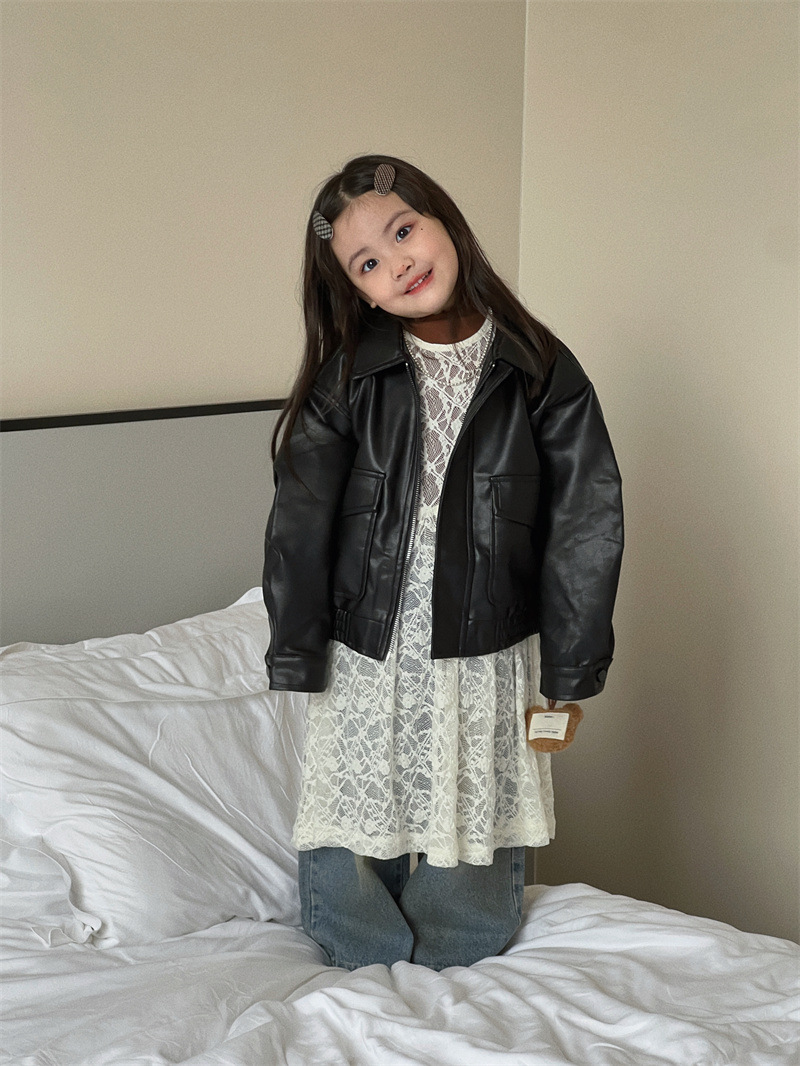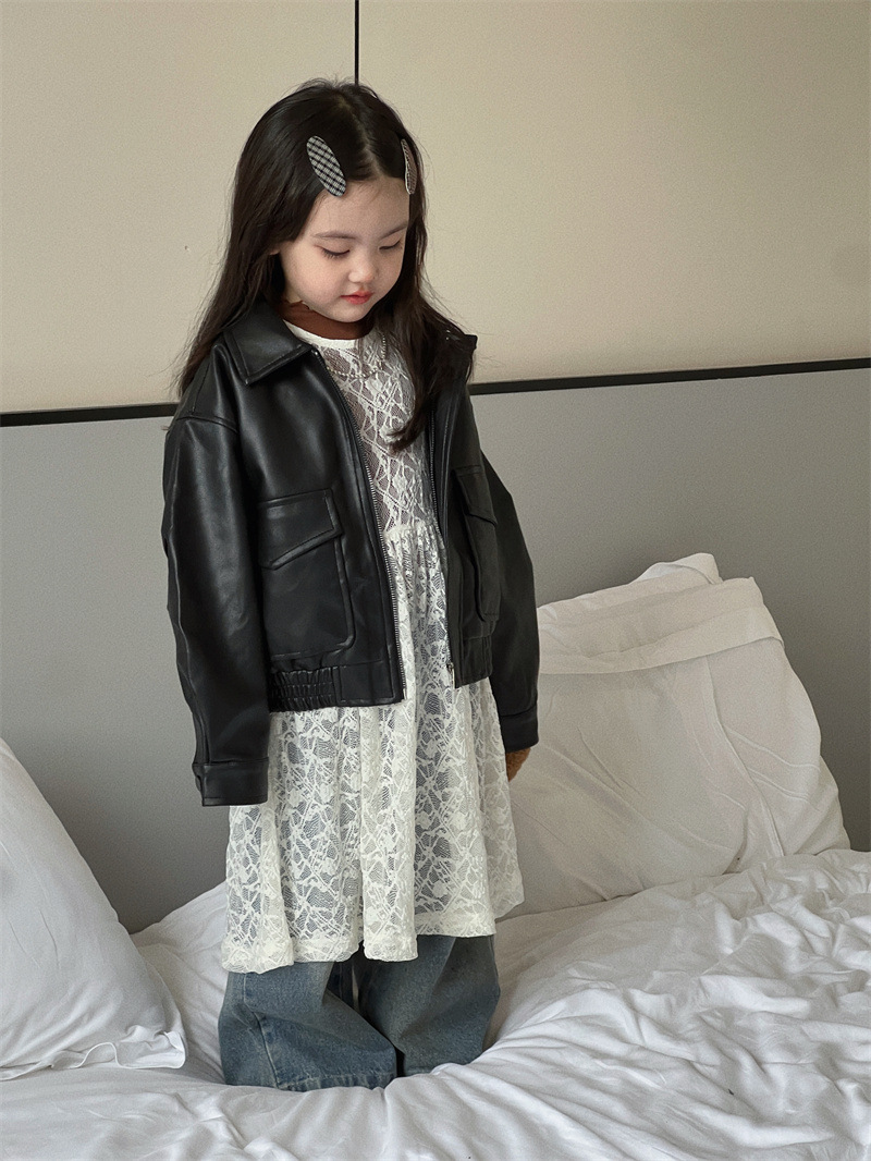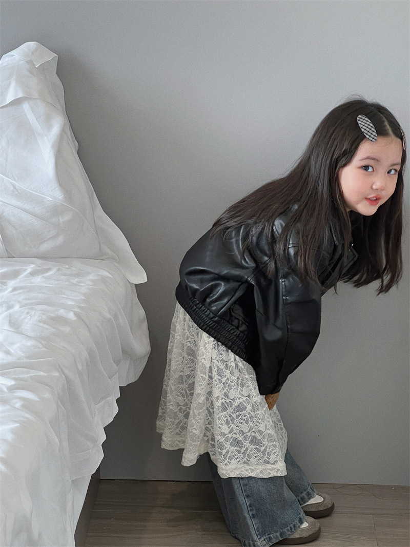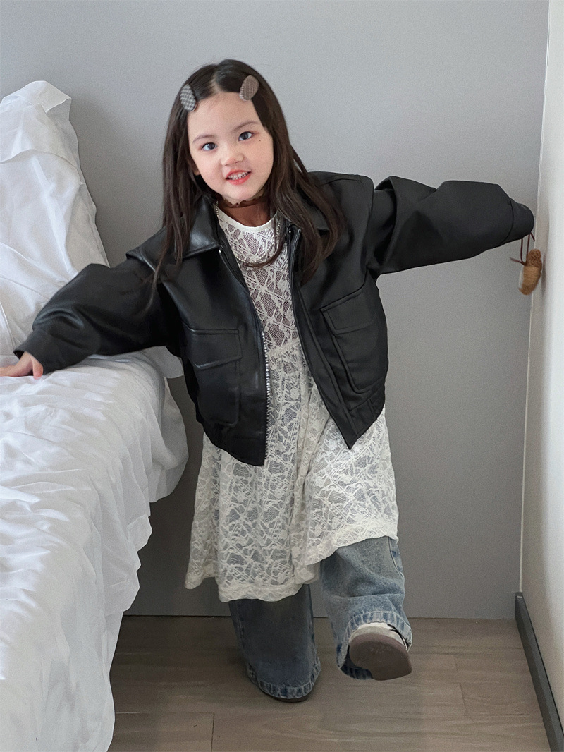 2024 가을 새로운 한국 아동복 소녀 pu 가죽 아기 패션 오토바이 가죽 코트스토어 가기