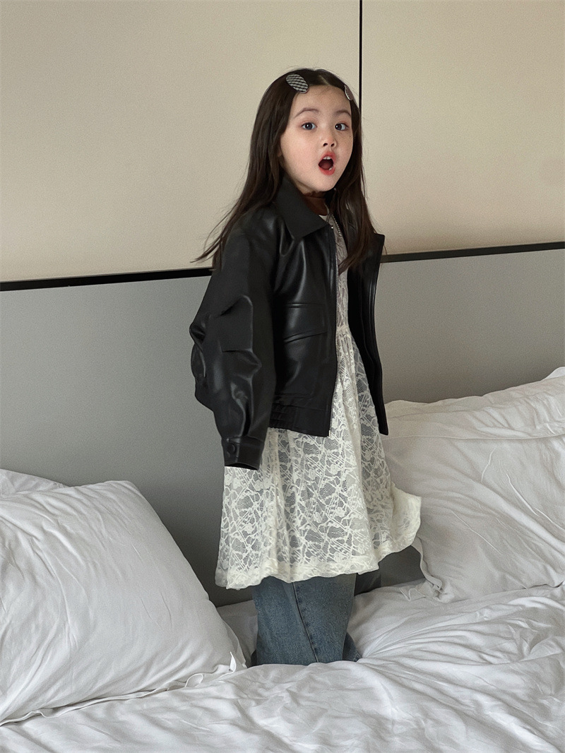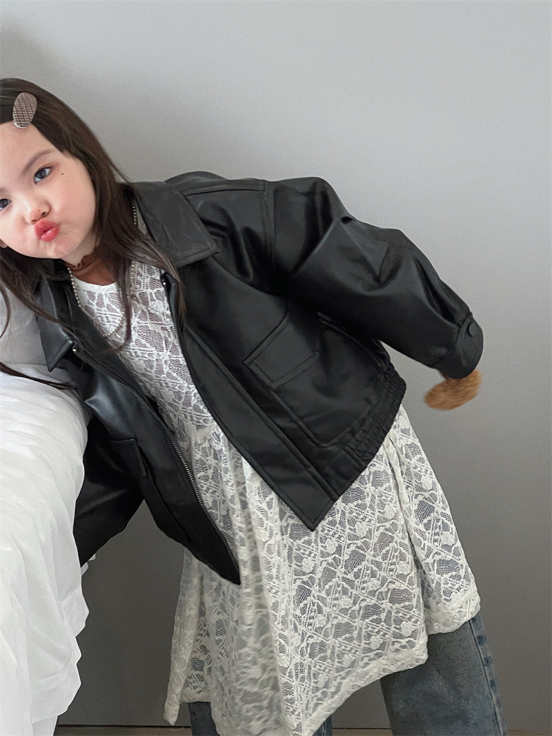 2024 가을 새로운 한국 아동복 소녀 pu 가죽 아기 패션 오토바이 가죽 코트