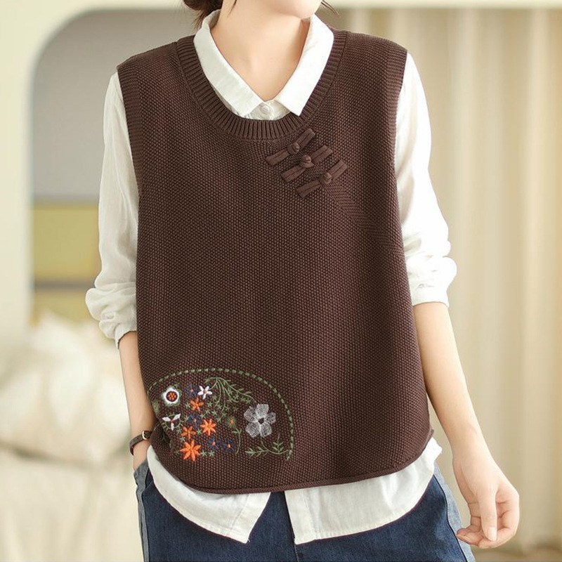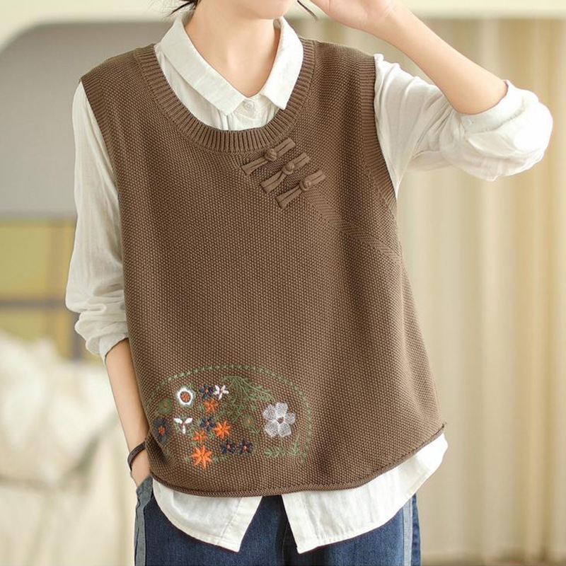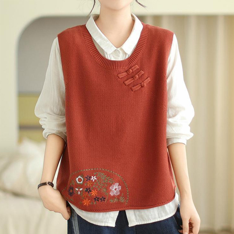 2025 가을 니트 조끼 솔리드 컬러 민소매 풀오버 여성 복고풍 자수 라운드 넥 버튼 어깨 탑