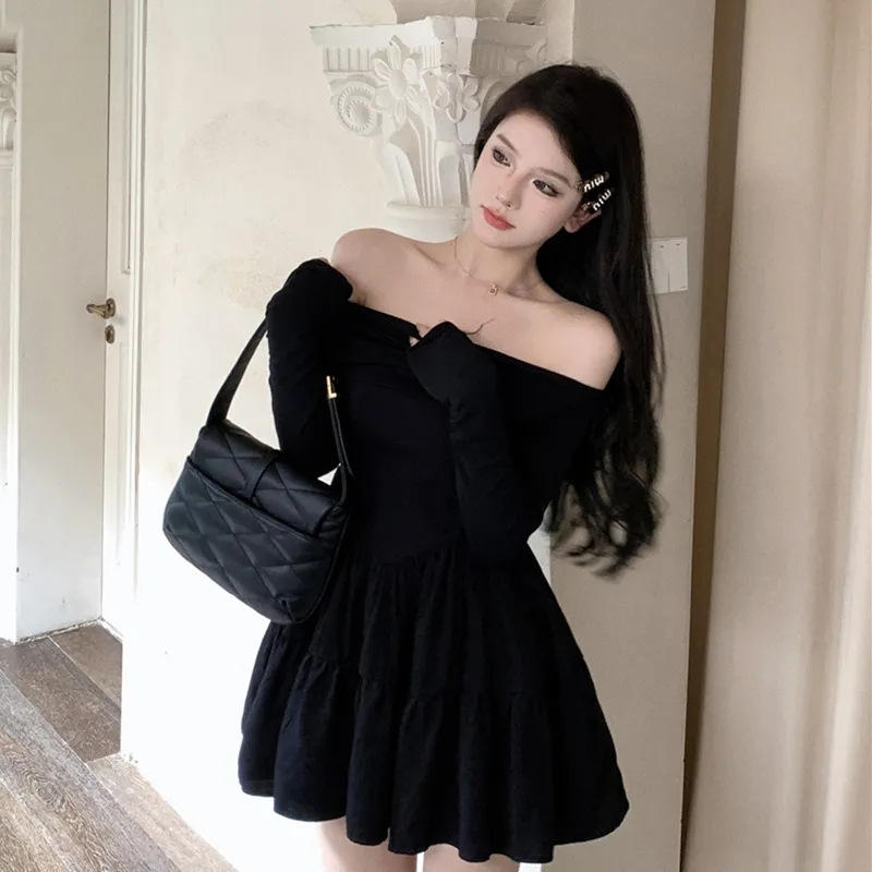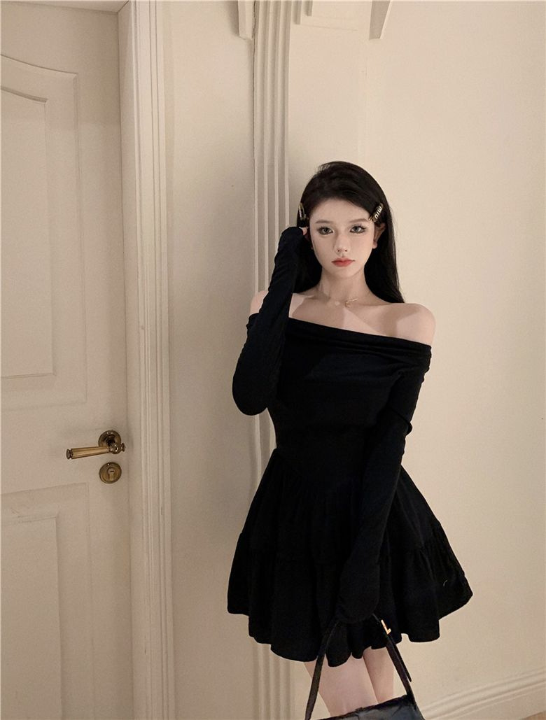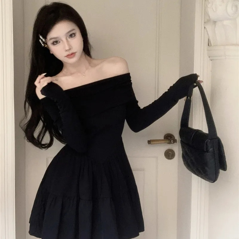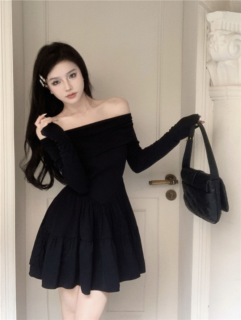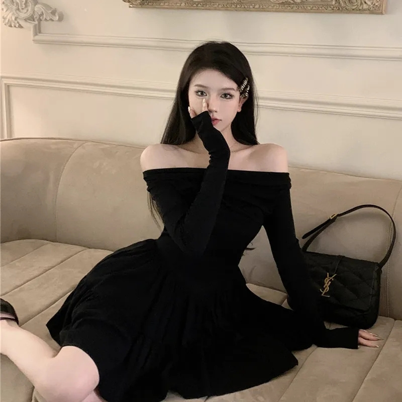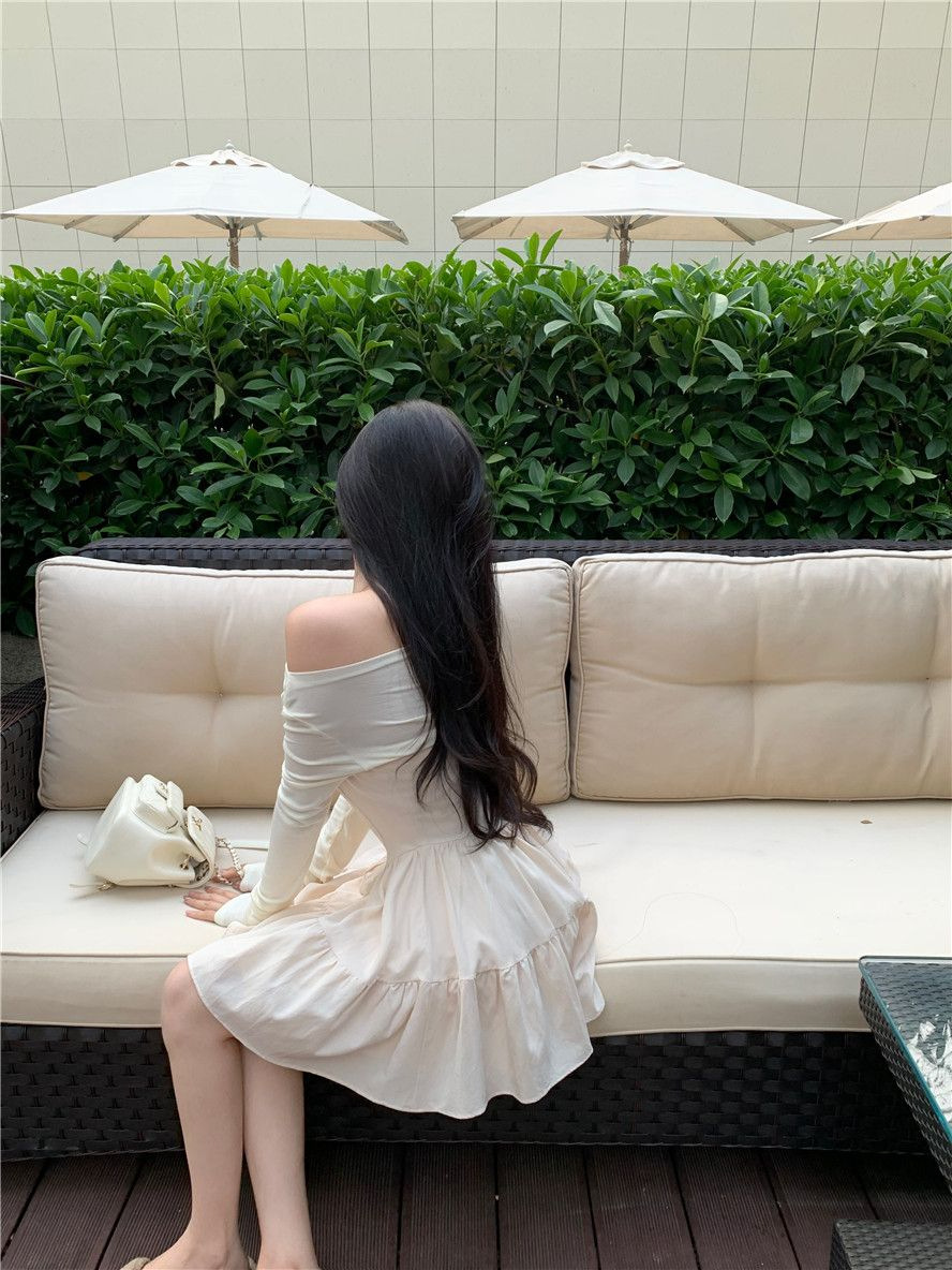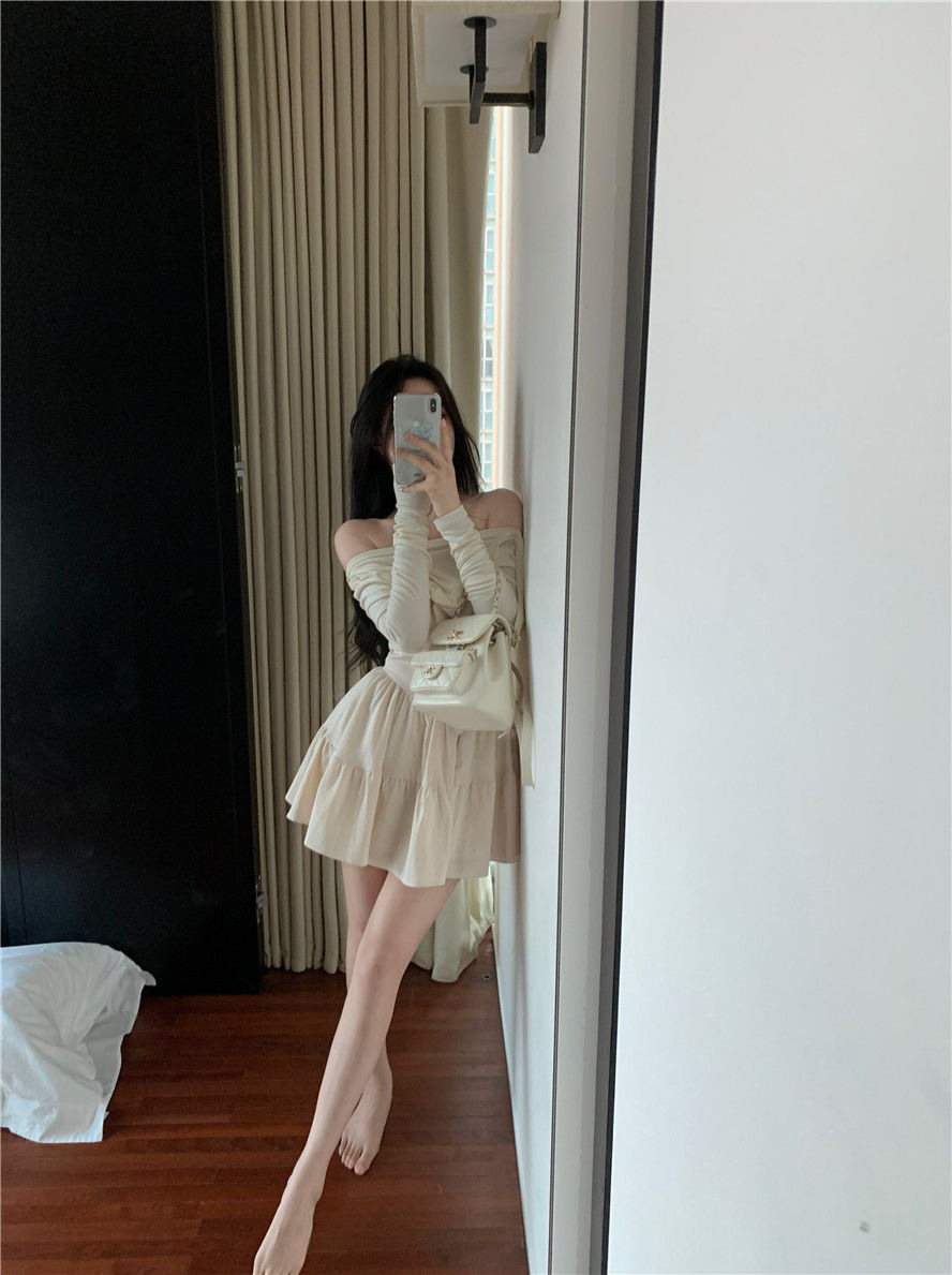 프랑스 스타일 우아한 한 단어 칼라 A 라인 짧은 치마 긴 소매 원피스 여성 가을 착용 달콤한 스파이스 소녀 슬림핏 웨이스트 살구색 스커트스토어 가기