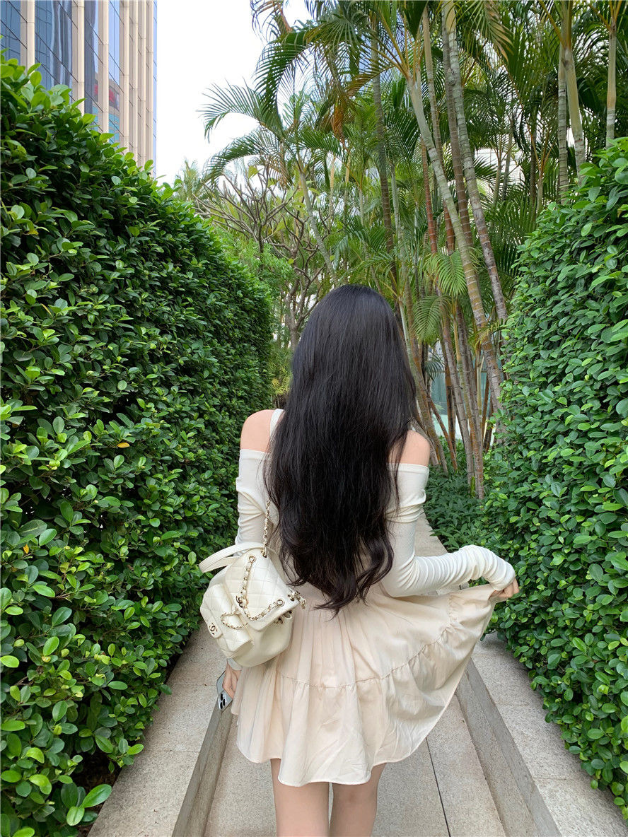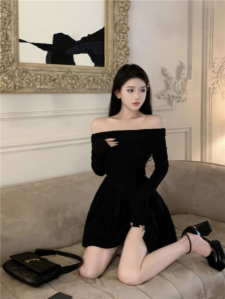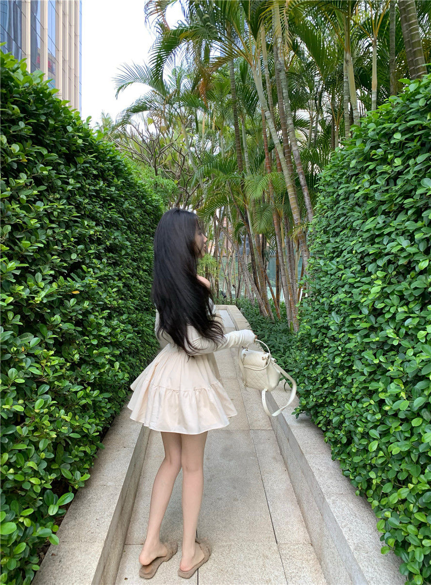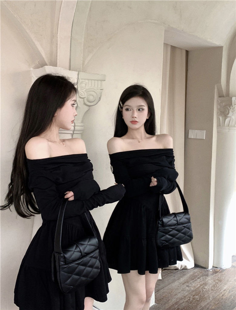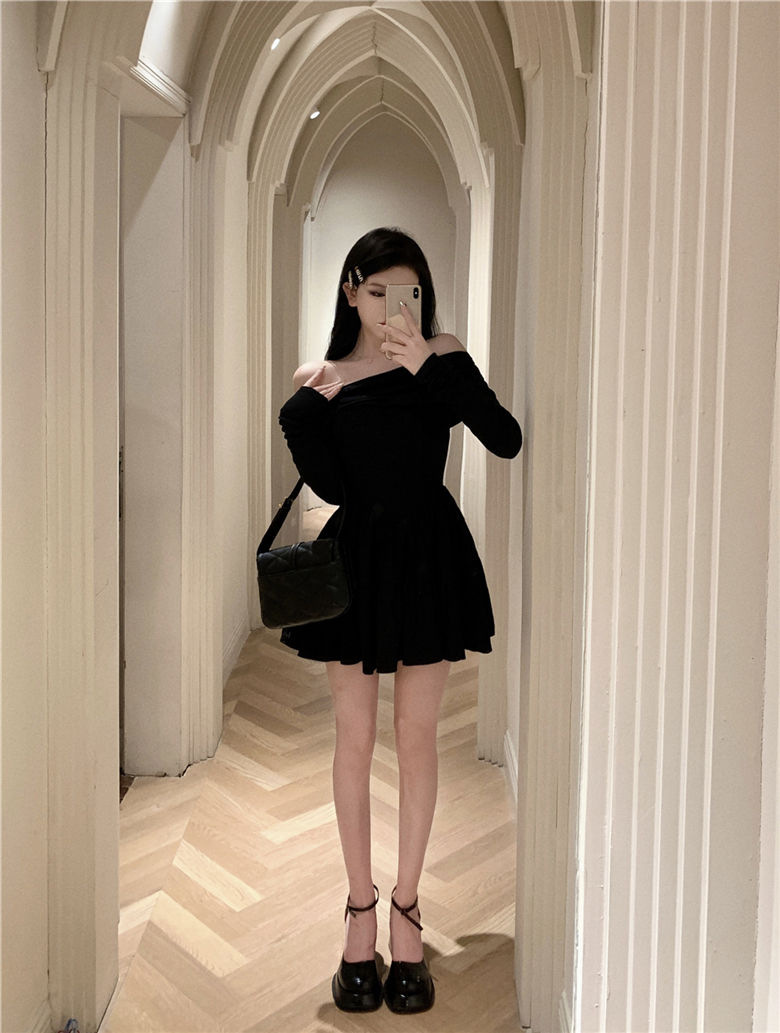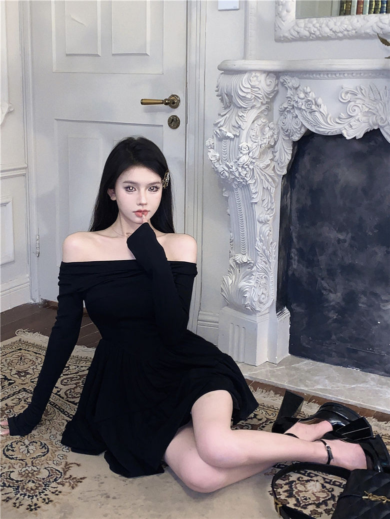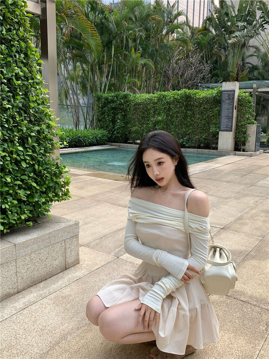 프랑스 스타일 우아한 한 단어 칼라 A 라인 짧은 치마 긴 소매 원피스 여성 가을 착용 달콤한 스파이스 소녀 슬림핏 웨이스트 살구색 스커트스토어 가기