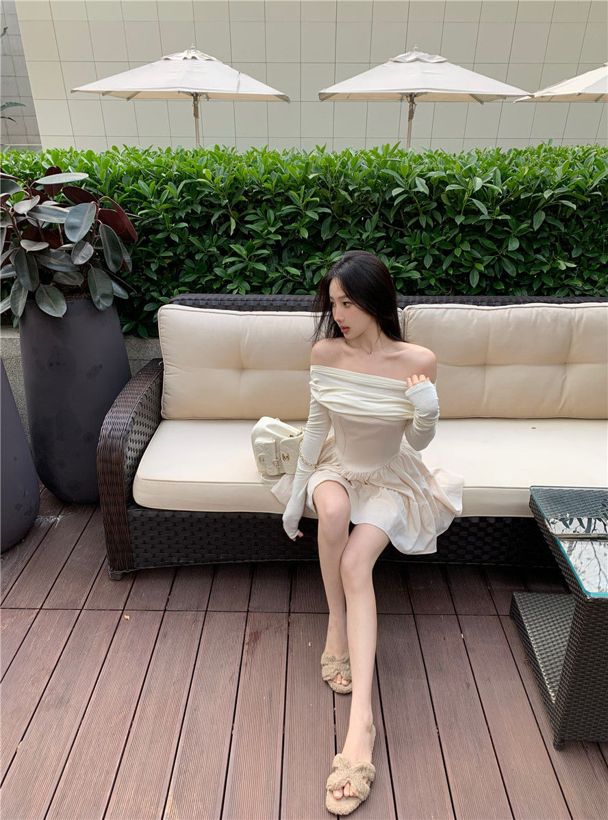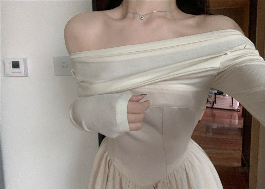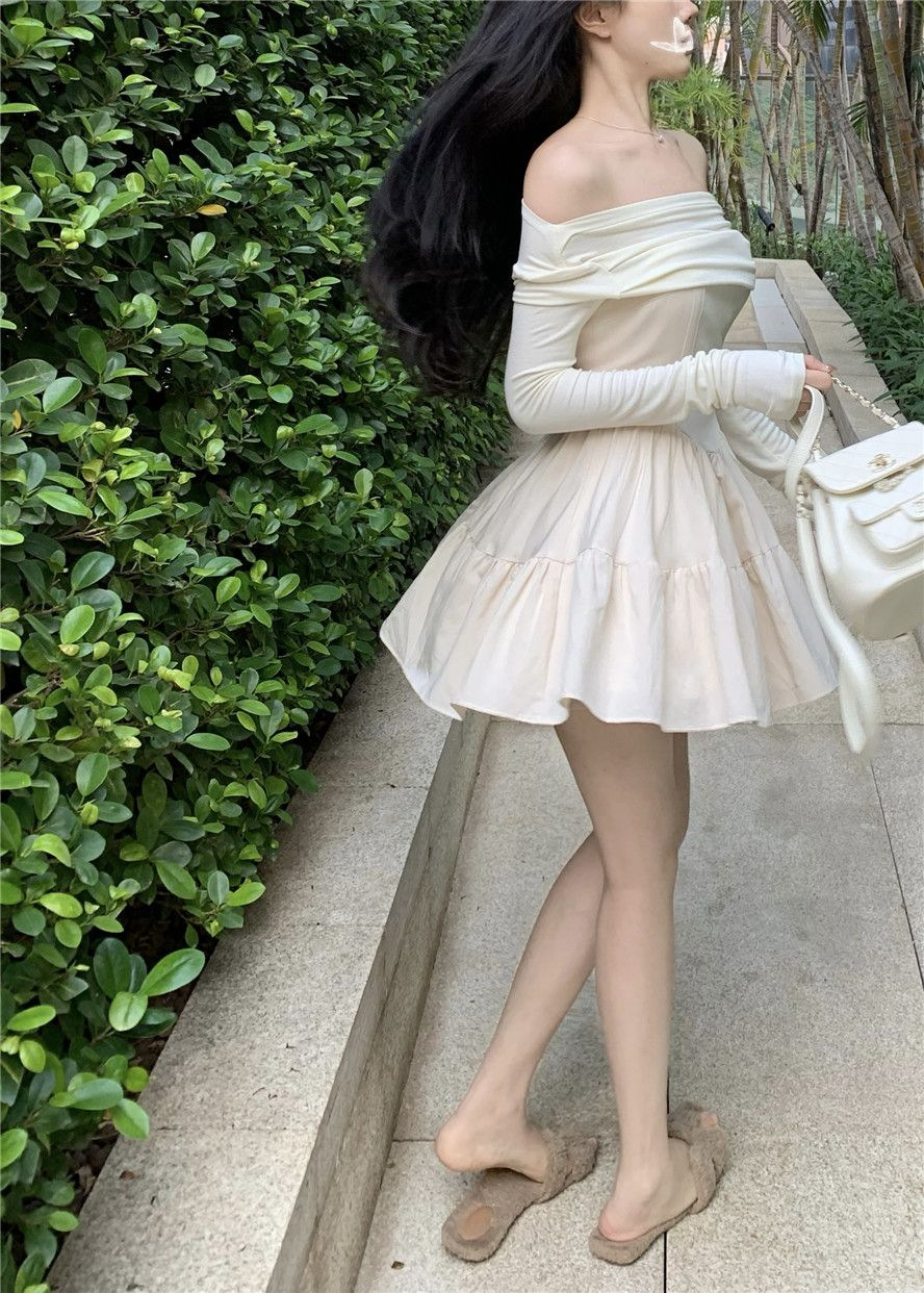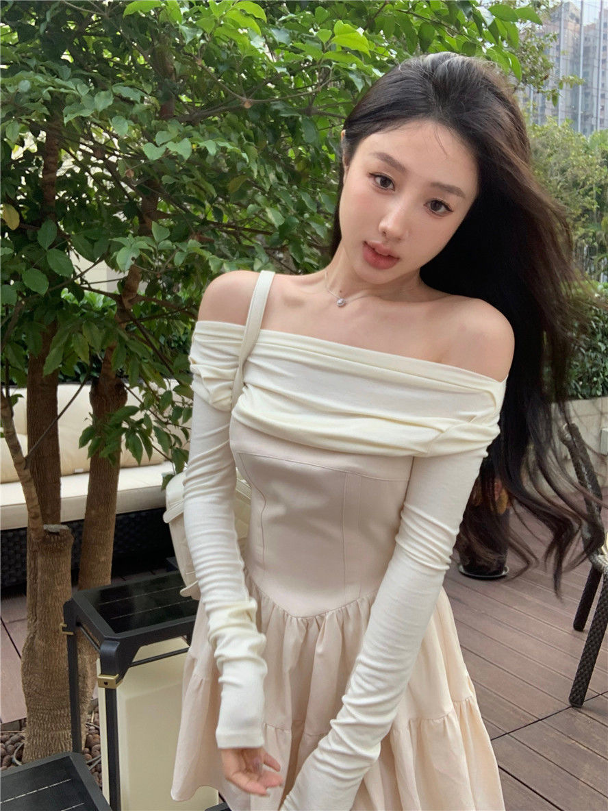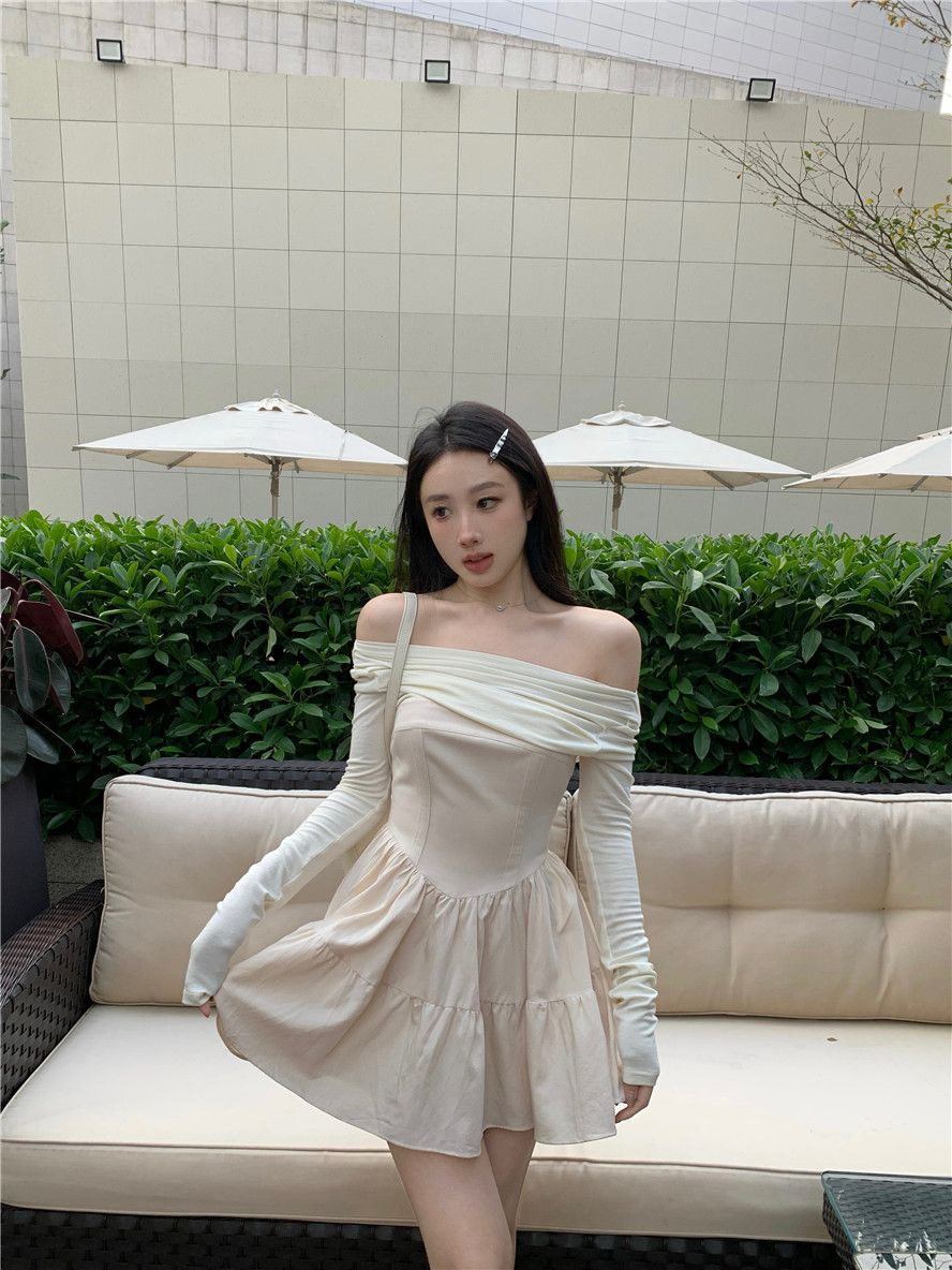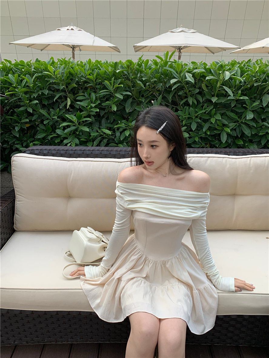 프랑스 스타일 우아한 한 단어 칼라 A 라인 짧은 치마 긴 소매 원피스 여성 가을 착용 달콤한 스파이스 소녀 슬림핏 웨이스트 살구색 스커트