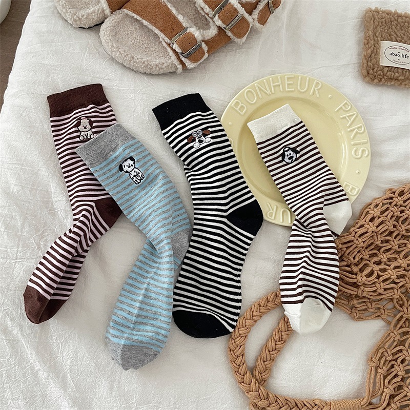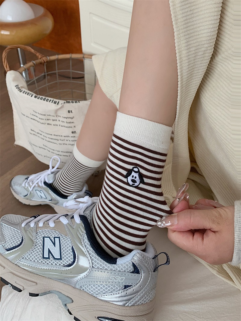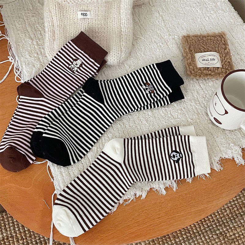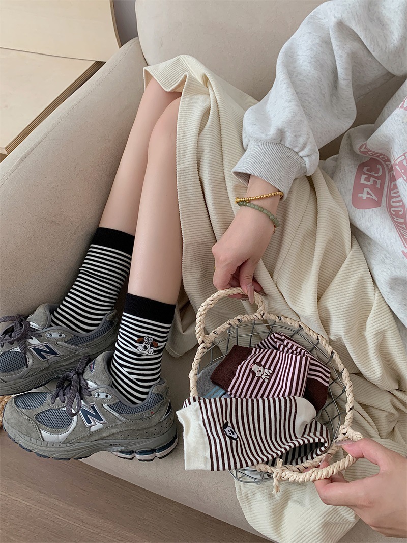 가을 겨울 여성 양말 귀여운 줄무늬 자수 강아지 만화 중목 양말 컬리지 스타일 다용도 인스 트렌드 양말