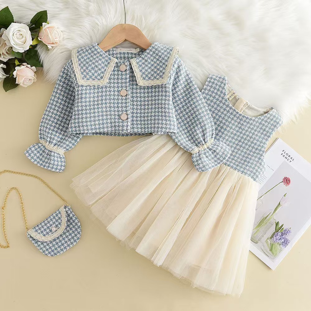 아기 소녀의 Houndstooth 대형 옷깃 재킷 조끼 슬링 스커트 작은 슬링 3 피스 세트 한국 스타일 소녀의 메시 세트