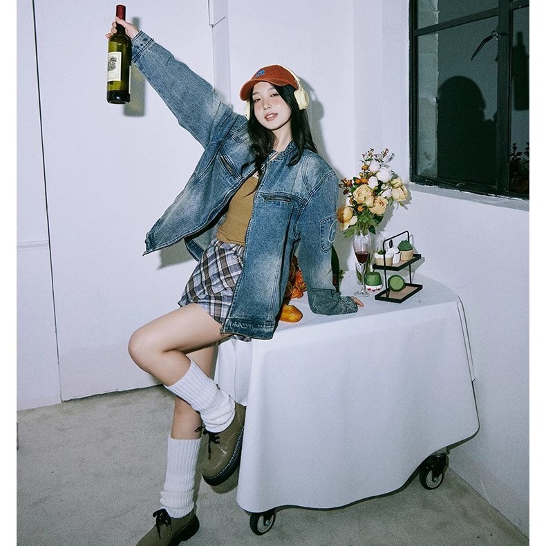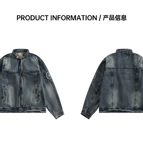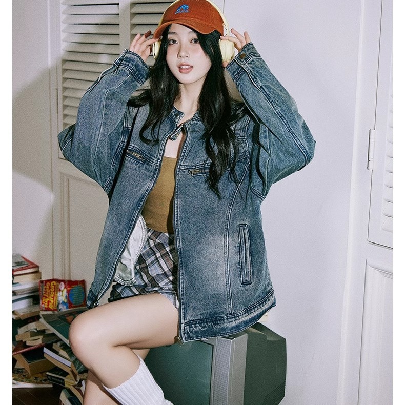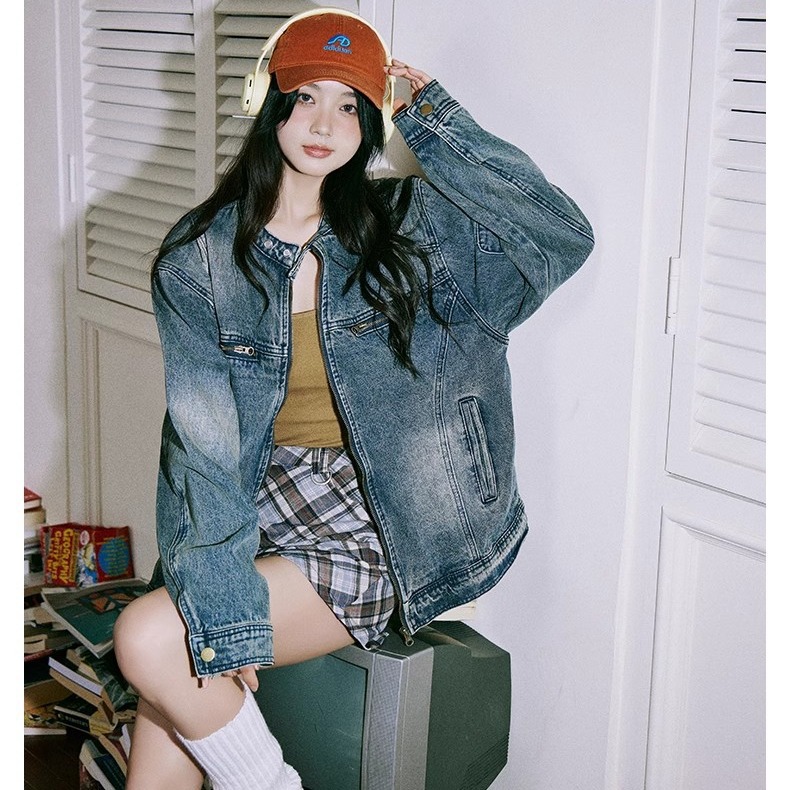 2024 새로운 미국 빈티지 세탁 데님 재킷 남성과 여성의 느슨한 디자인 센스 세미 하이 칼라 브록 지퍼 재킷스토어 가기