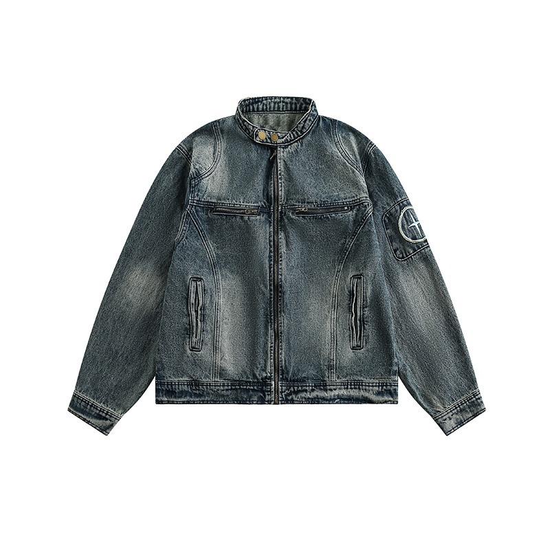 2024 새로운 미국 빈티지 세탁 데님 재킷 남성과 여성의 느슨한 디자인 센스 세미 하이 칼라 브록 지퍼 재킷