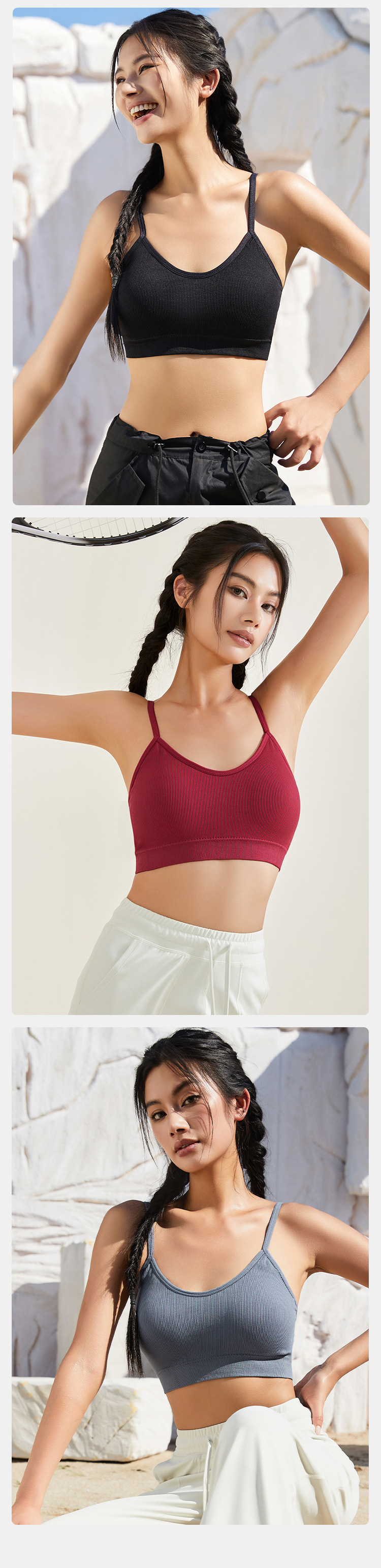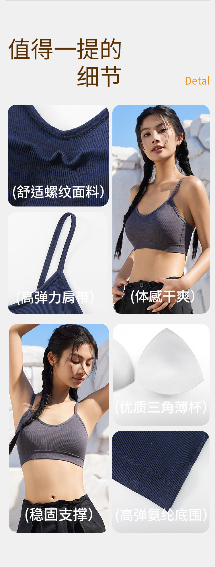 【卖点】:一体式织造运动美背,可日常外穿,高弹力固定肩带,稳定不滑落。面料专为运动设计,螺纹感做到贴肤杯垫不跑杯,排汗吸湿做到满足运动的所需。