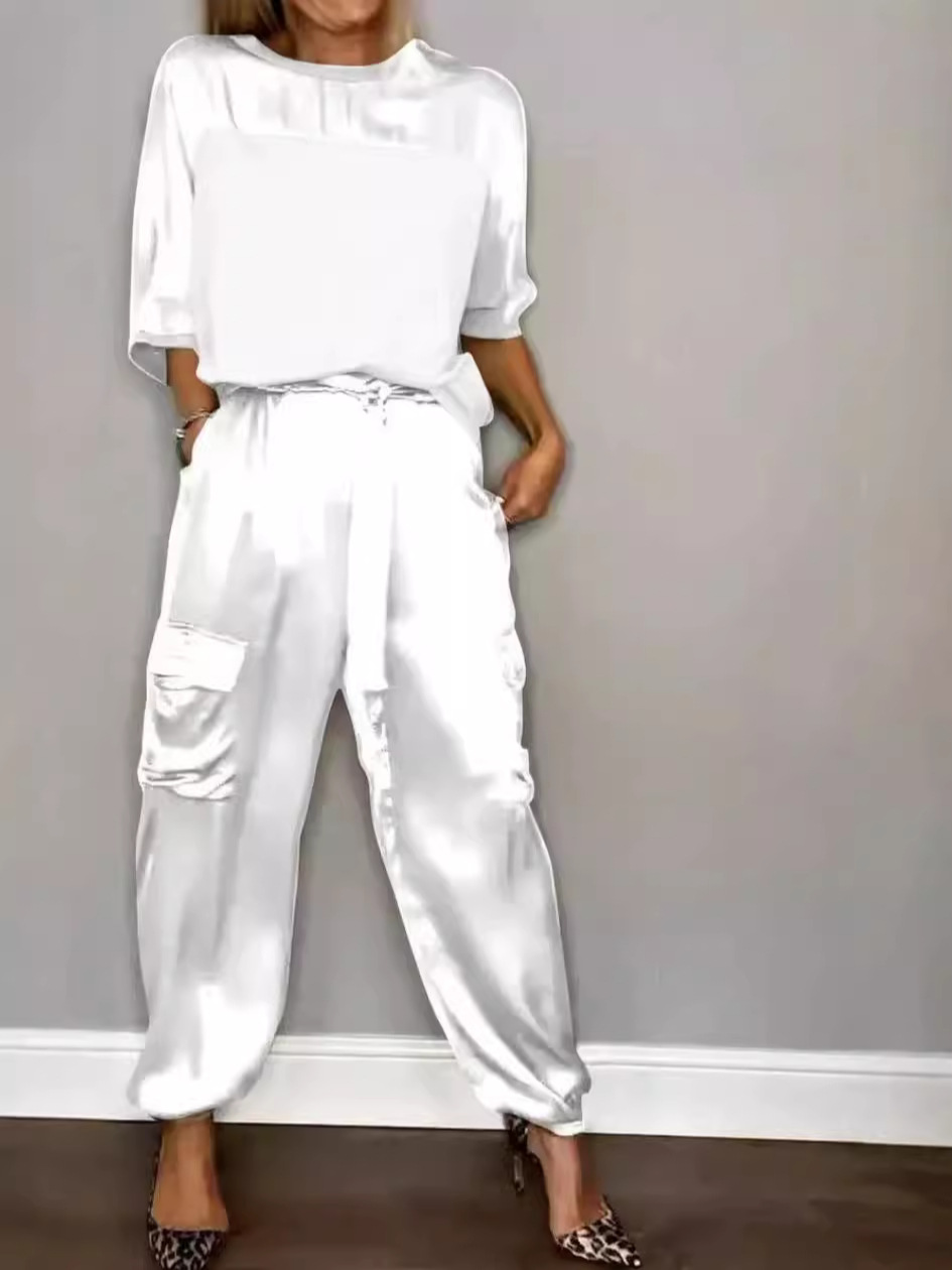 2024 아마존 유럽 및 미국 신상 패션 젊은 여성용 새틴 반팔 유럽 및 미국 스타일 정장 상의와 바지 2피스 세트