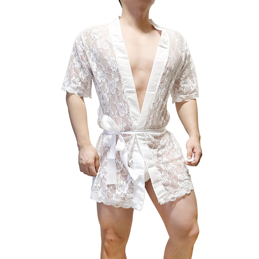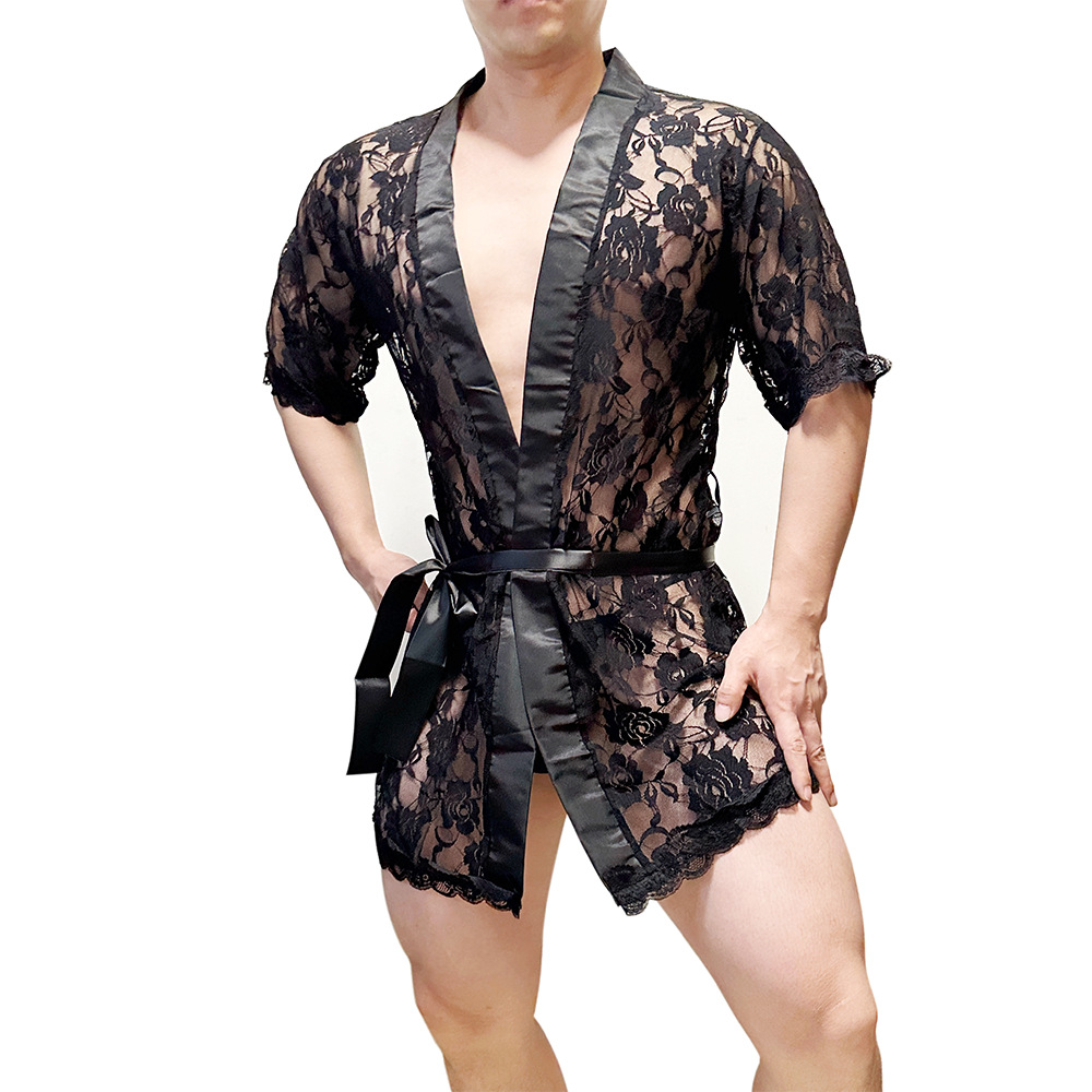 跨境货源 男士性感蕾丝镂空睡袍 欧美外贸情趣内衣丁字裤套装批发