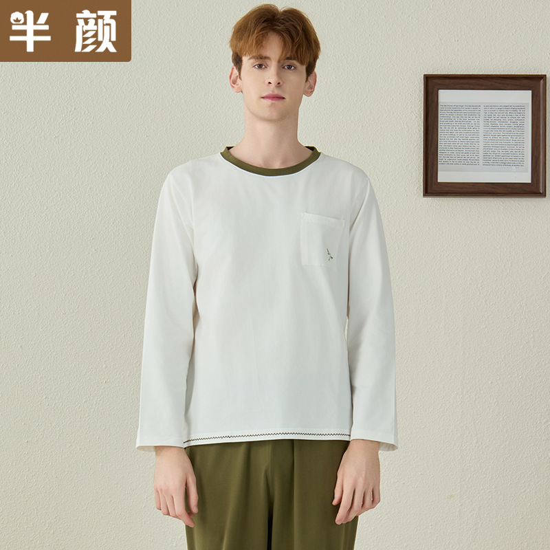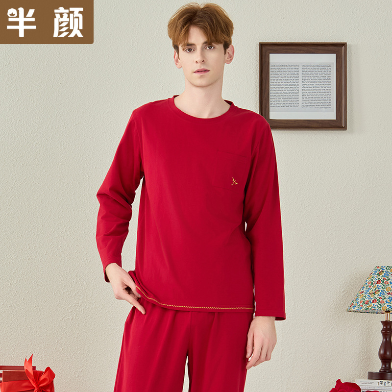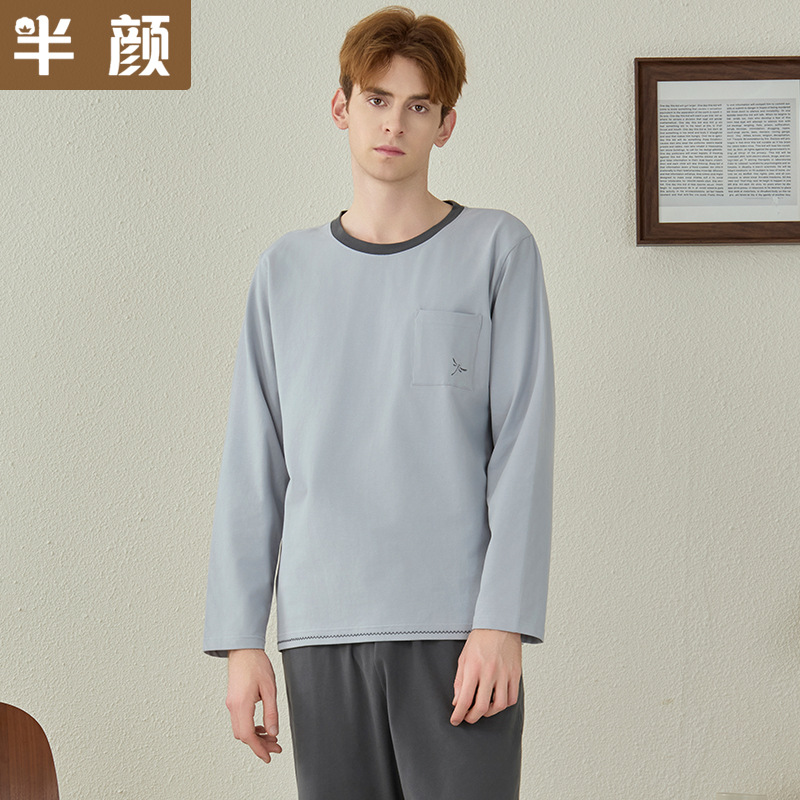 가을과 겨울 새 집 옷 커플의 크루 넥 풀오버 긴 소매 바지 니트 코튼 스크럽 수 놓은 남성용 잠옷