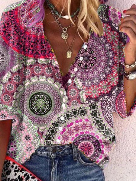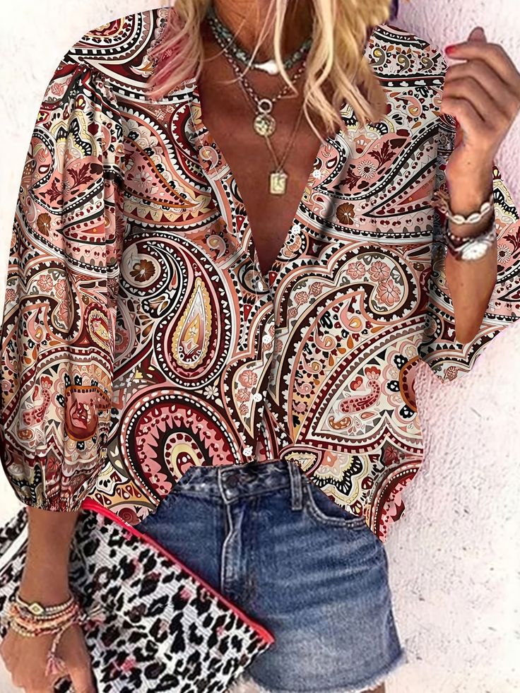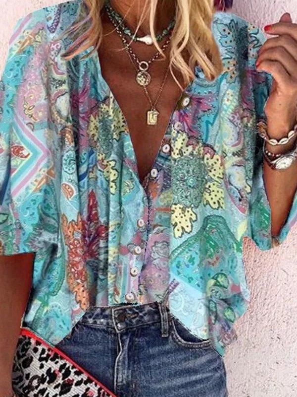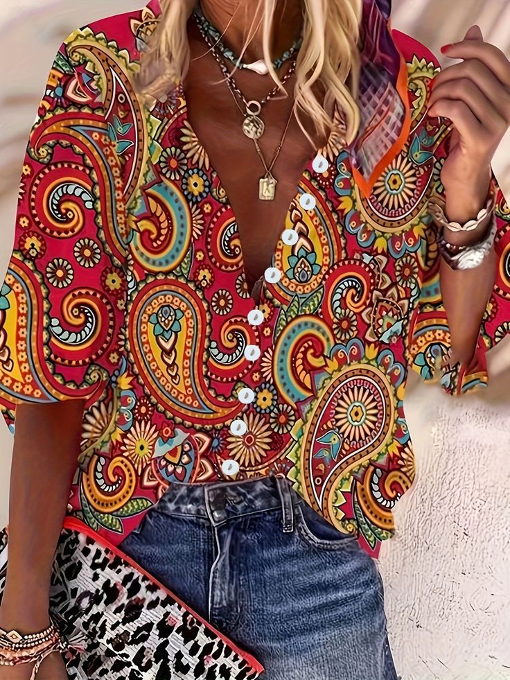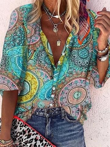 유럽과 미국의 국경 보헤미안 레트로 3d 인쇄 다채로운 봄과 가을 여성의 칼라 느슨한 셔츠
