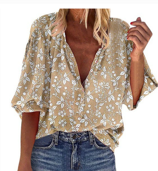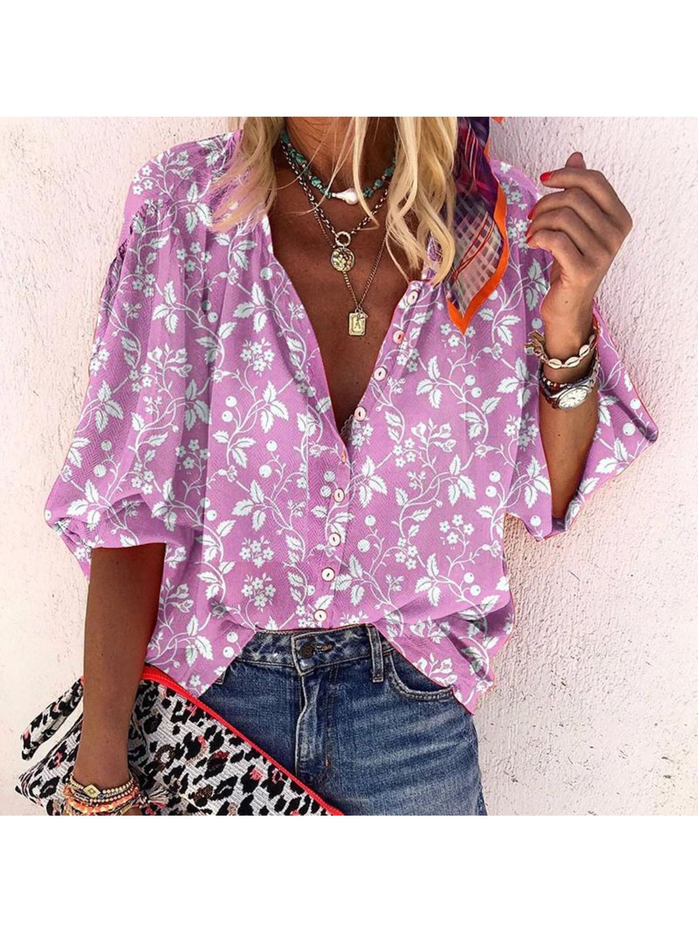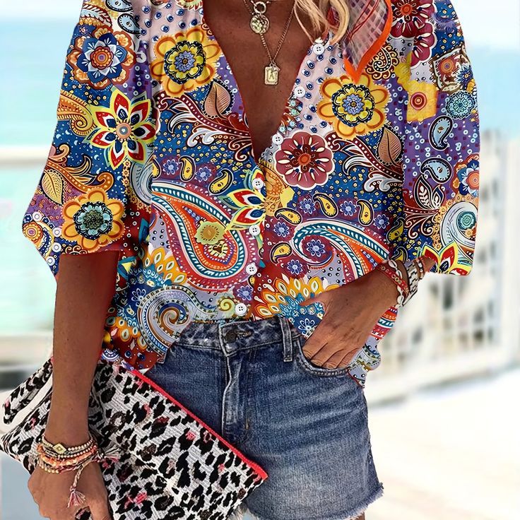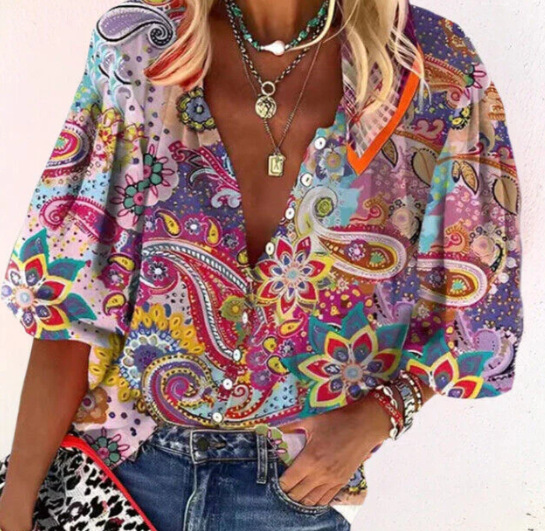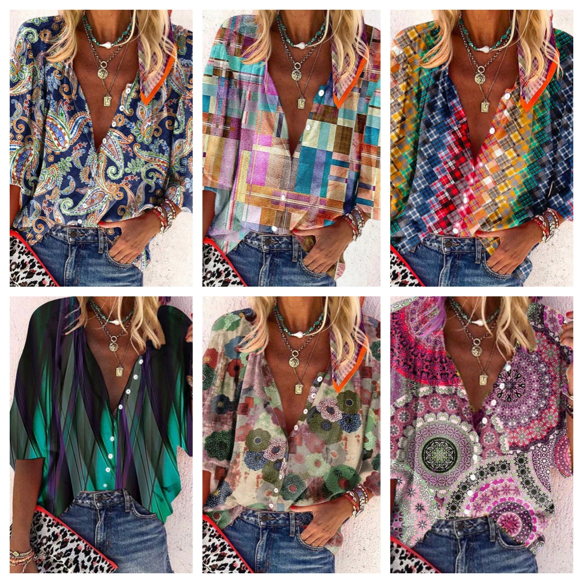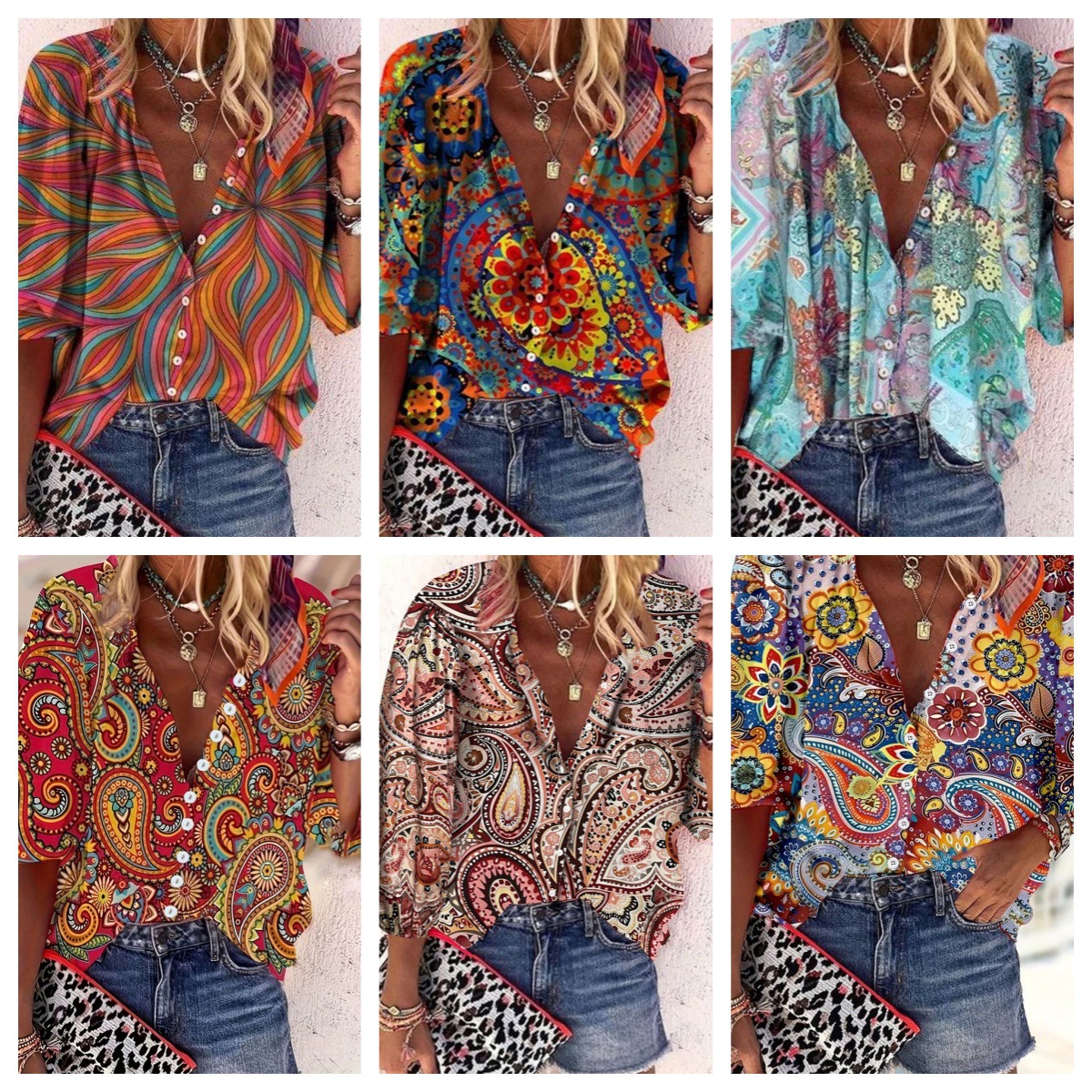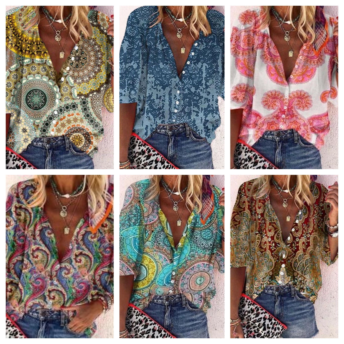 유럽과 미국의 국경 보헤미안 레트로 3d 인쇄 다채로운 봄과 가을 여성의 칼라 느슨한 셔츠스토어 가기