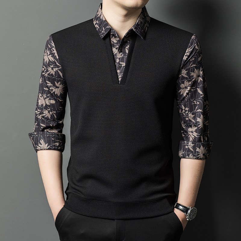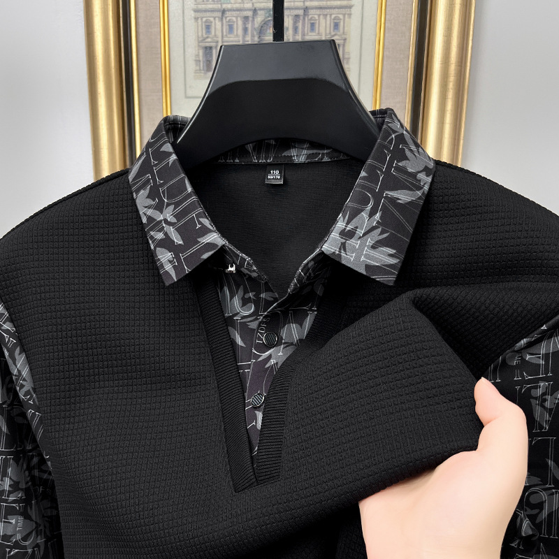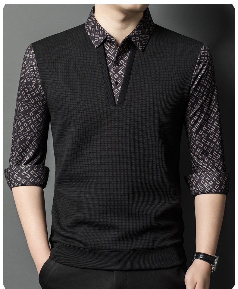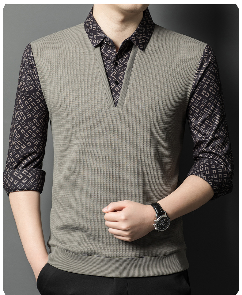 봄과 가을 새로운 하이 엔드 V 넥 프린트 셔츠 2 피스 스티칭 셔츠 한국 유행 긴팔 아빠 셔츠