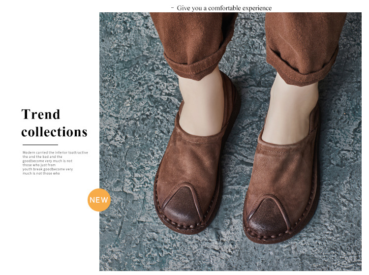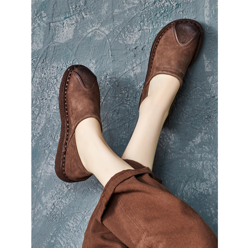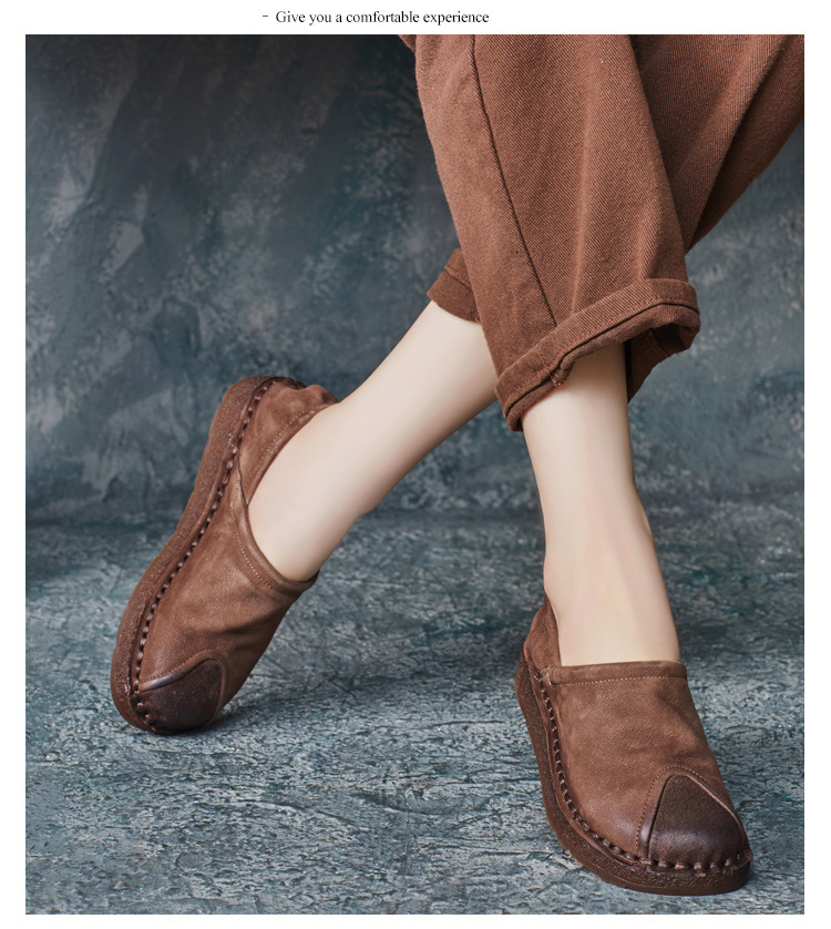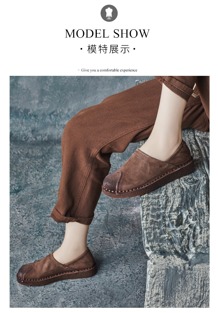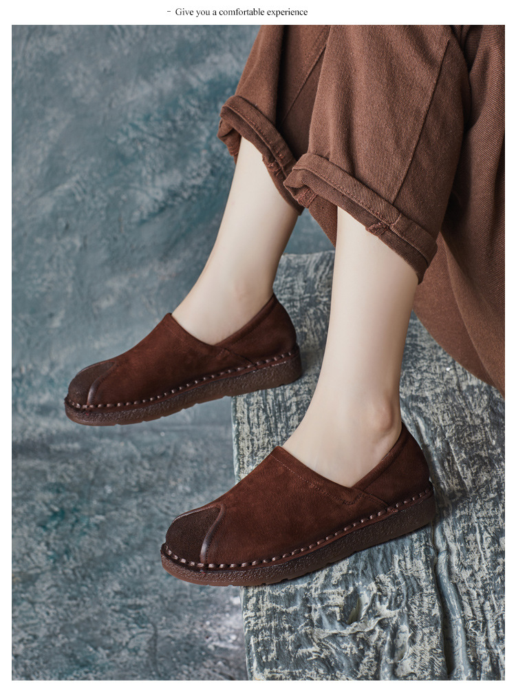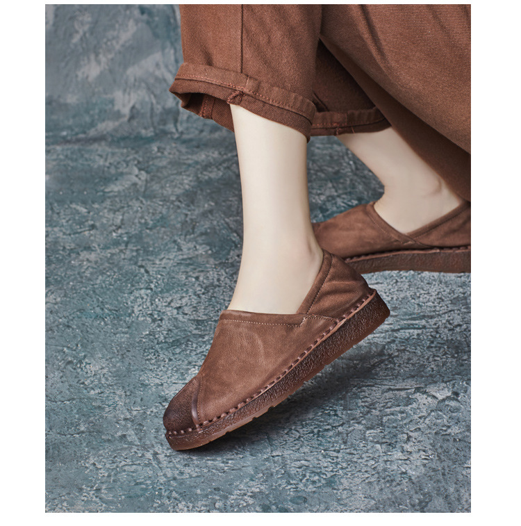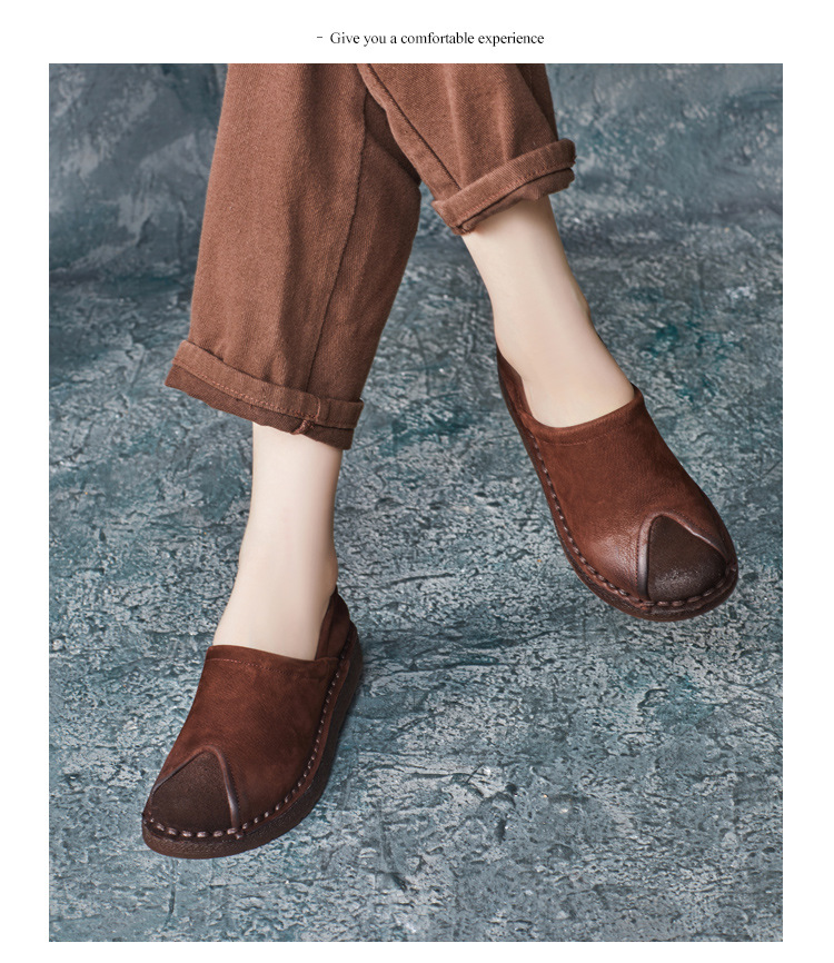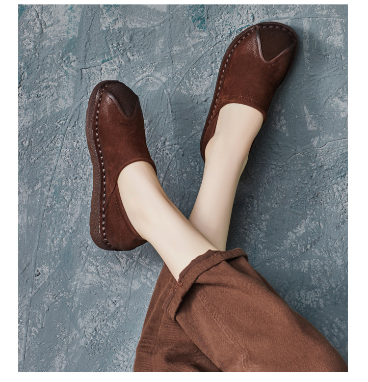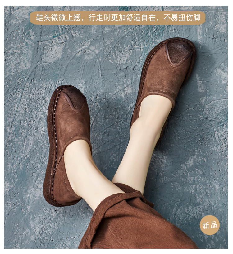 가을 2024 새로운 민족 스타일 복고풍 소가죽 평면 부드러운 바닥 손으로 꿰매는 싱글 레이어 신발 부드러운 바닥 여성 신발스토어 가기