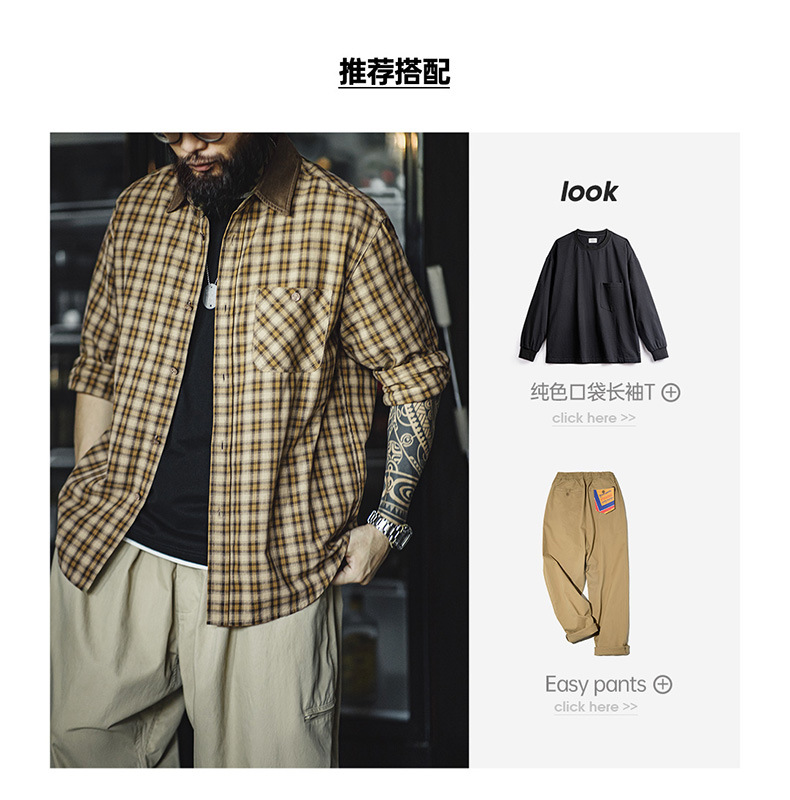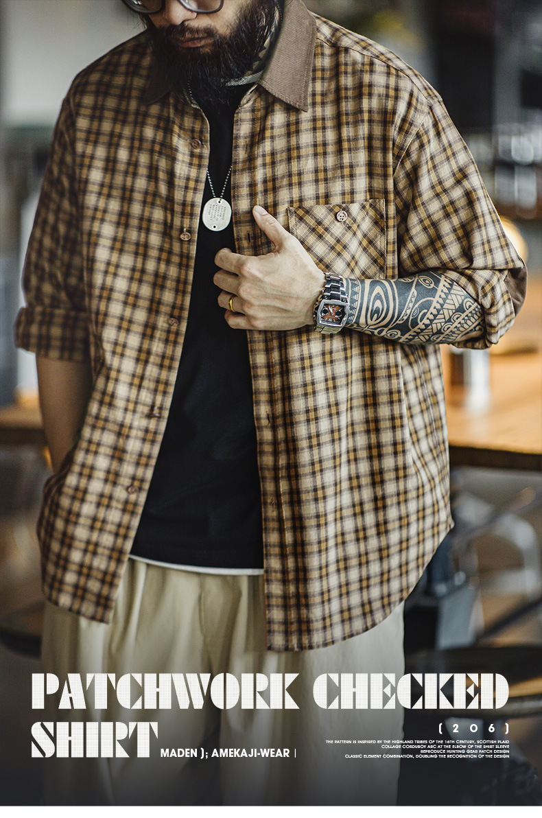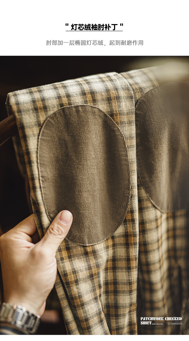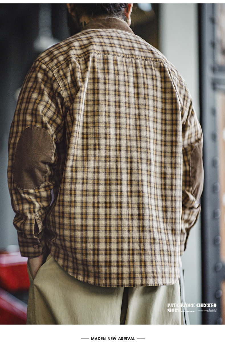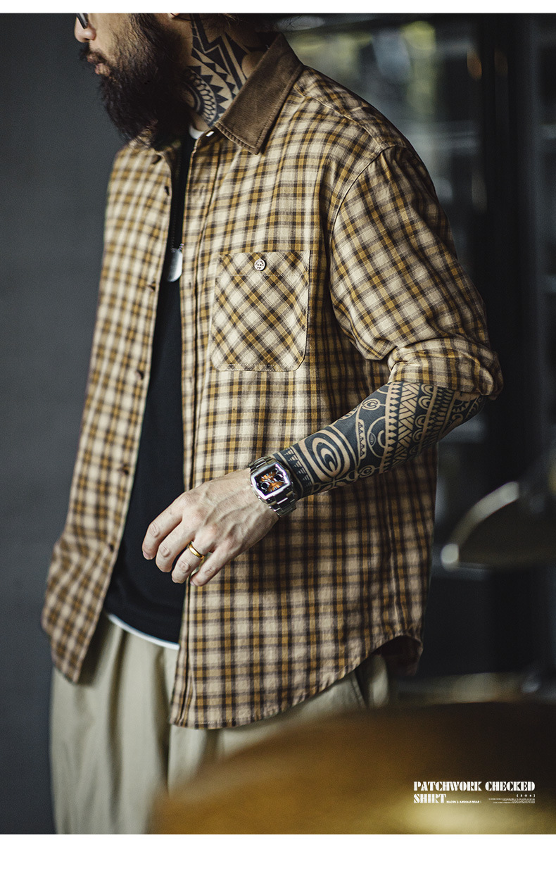 Madden Workwear 아메리칸 레트로 스코틀랜드 격자 무늬 긴팔 셔츠 코듀로이 스플 라이스 라펠 격자 무늬 셔츠 남성 가을스토어 가기