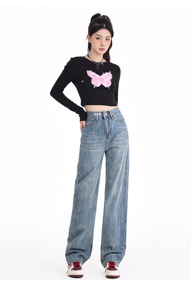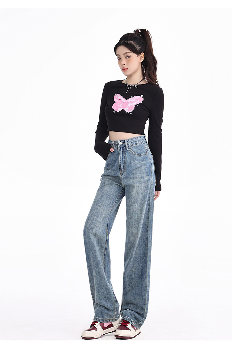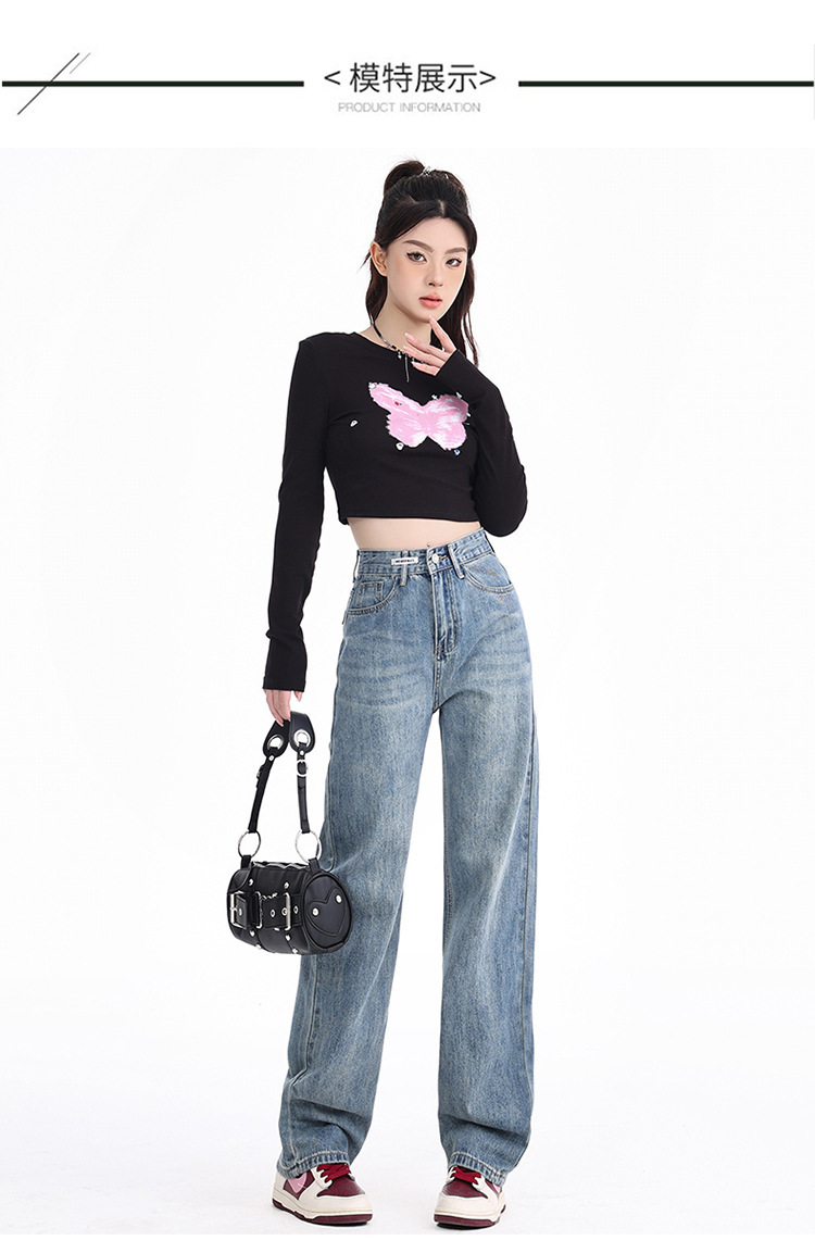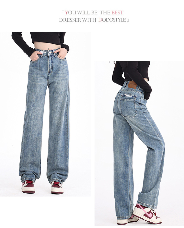 유럽 라이트 블루 좁은 직선 청바지 여성의 2024 높은 허리 투약 느슨한 슬림 넓은 다리 모양 유행 유행 바지스토어 가기