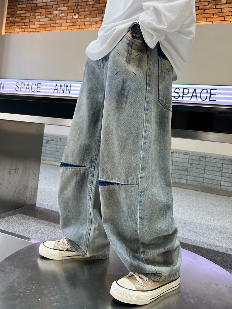 대외 무역 소년 청바지 유행 더피 잘 생긴 소년 더러운 바지 한국 봄과 가을 어린이 느슨한 넓은 다리 스트레이트 바지