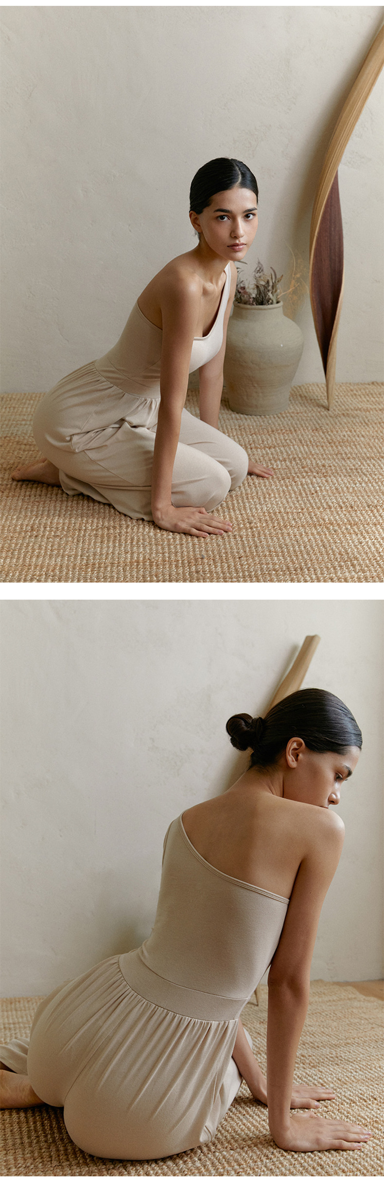 인쇄 로고 사용자 정의 로고 선 스타일 기울어 진 어깨 원피스 넓은 다리 바지 정장 요가 착용 여성을위한 게으른 필라테스 점프 슈트스토어 가기