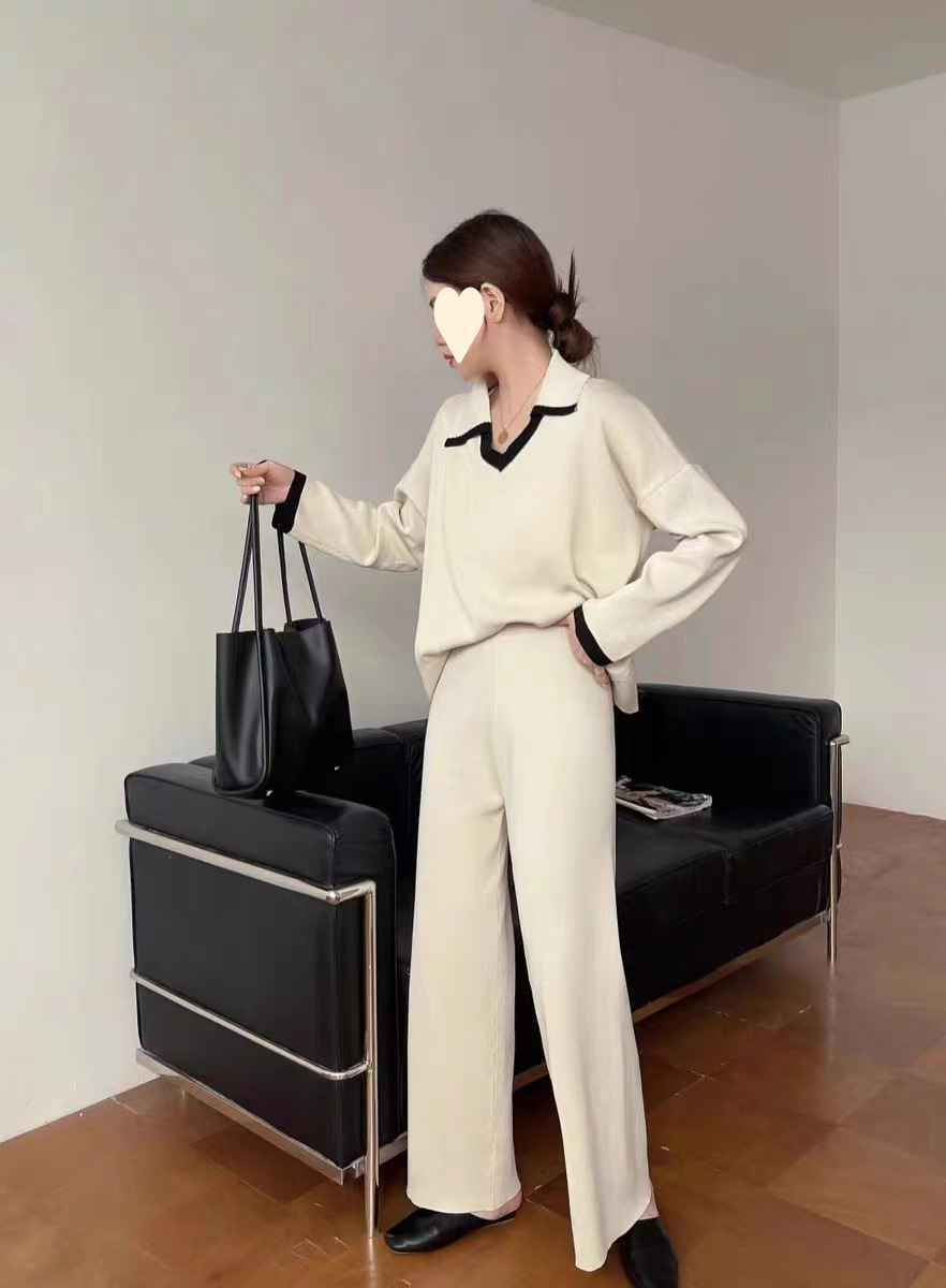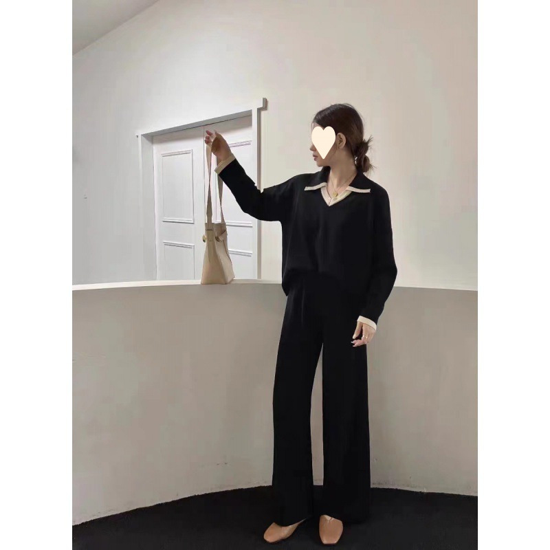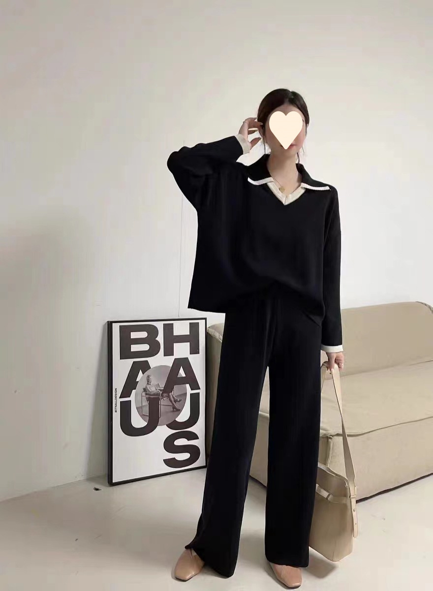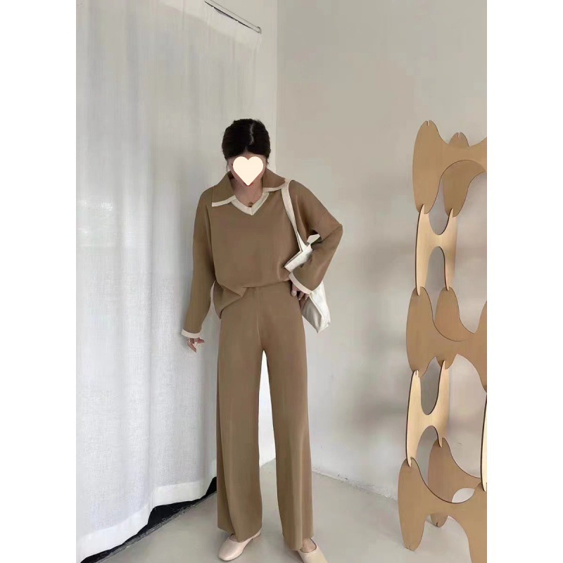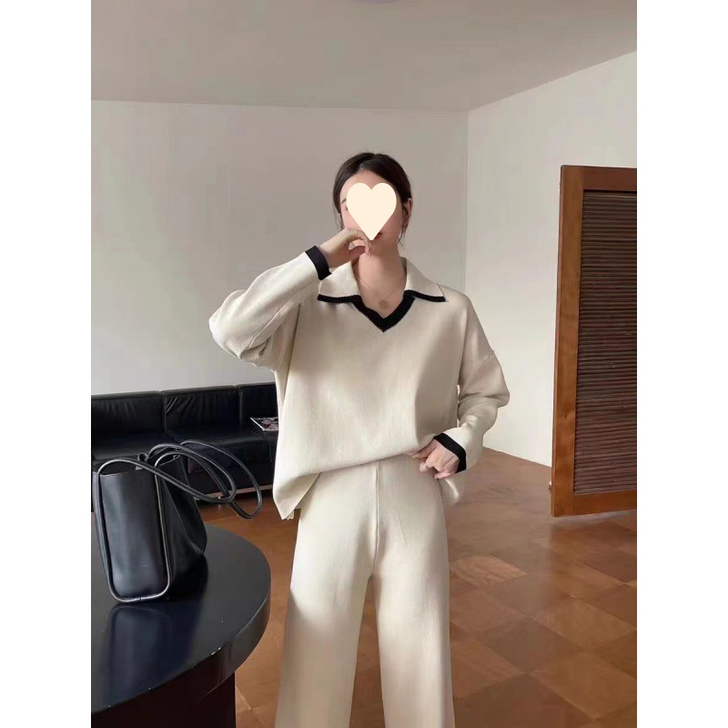 대조적 인 POLO 칼라 풀오버 느슨한 여성의 2024 새로운 디자인 감각 틈새 캐주얼 와이드 다리 바지 니트 세트 여성스토어 가기