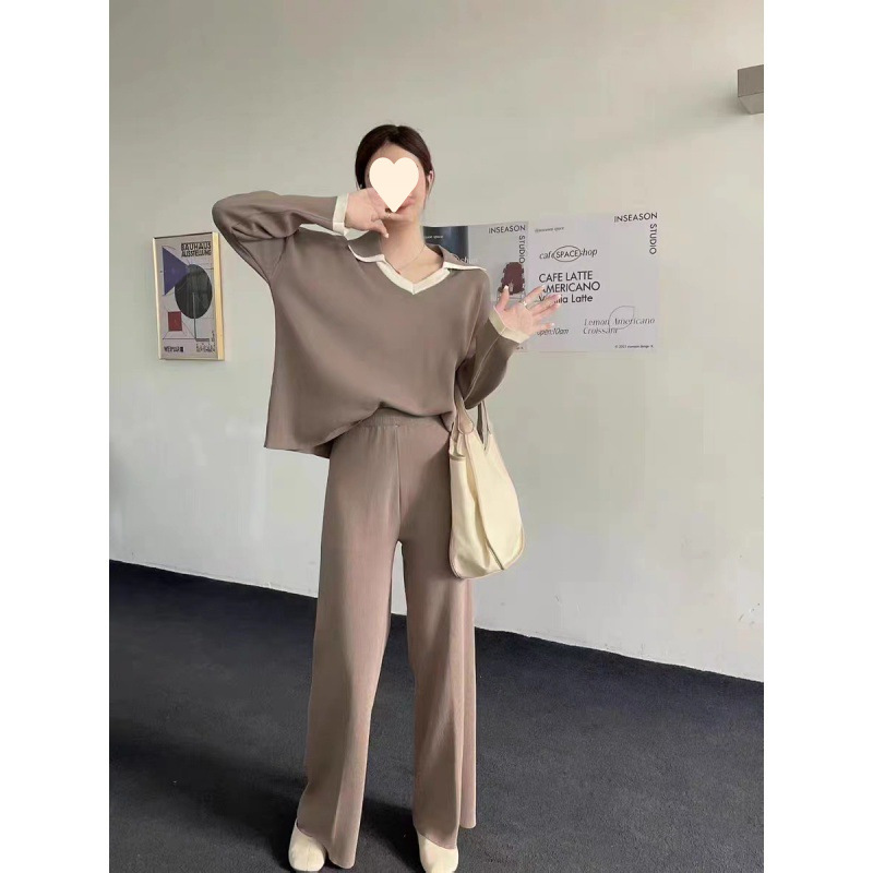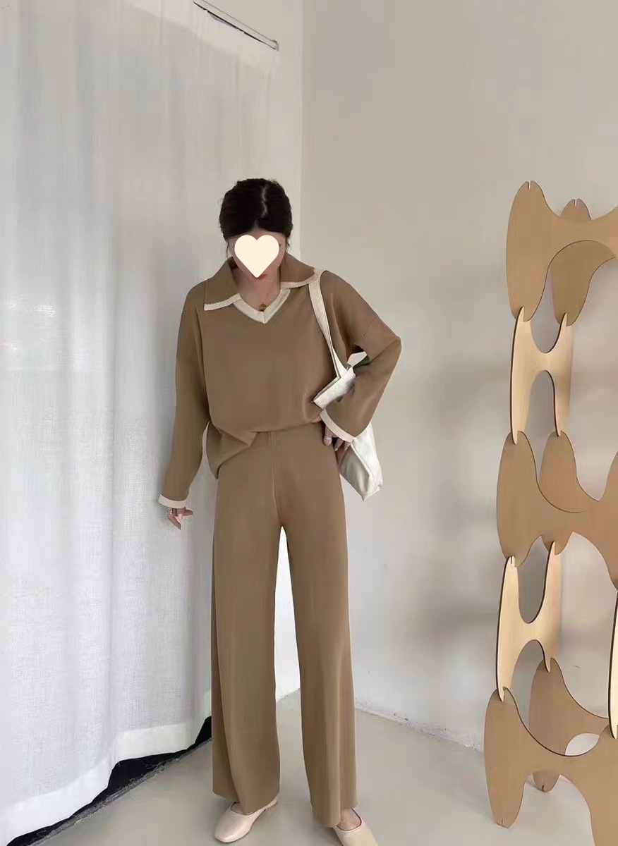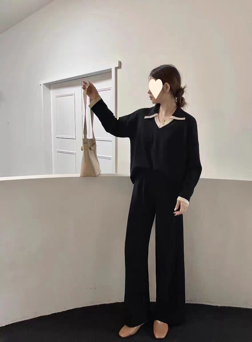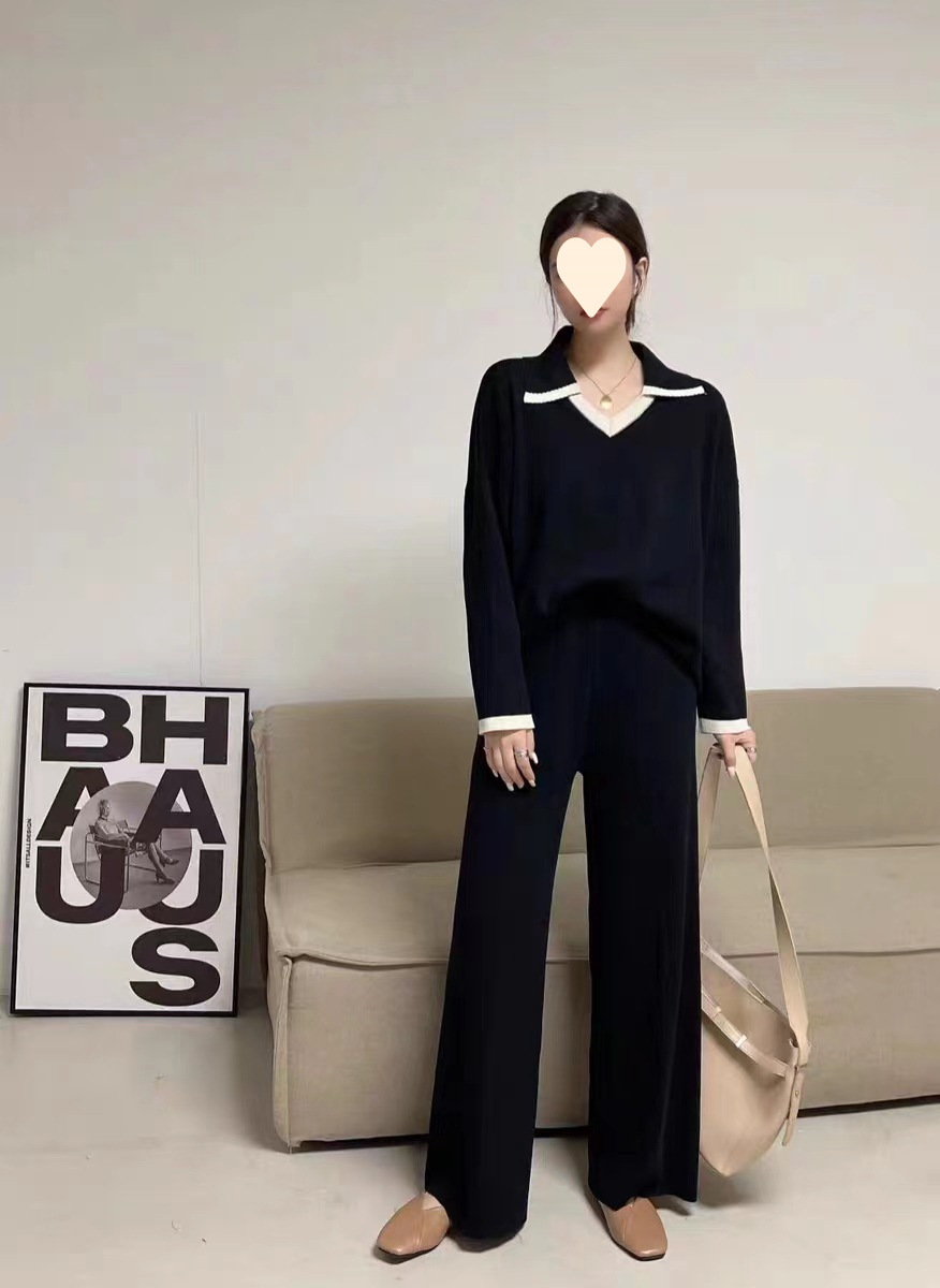 대조적 인 POLO 칼라 풀오버 느슨한 여성의 2024 새로운 디자인 감각 틈새 캐주얼 와이드 다리 바지 니트 세트 여성스토어 가기