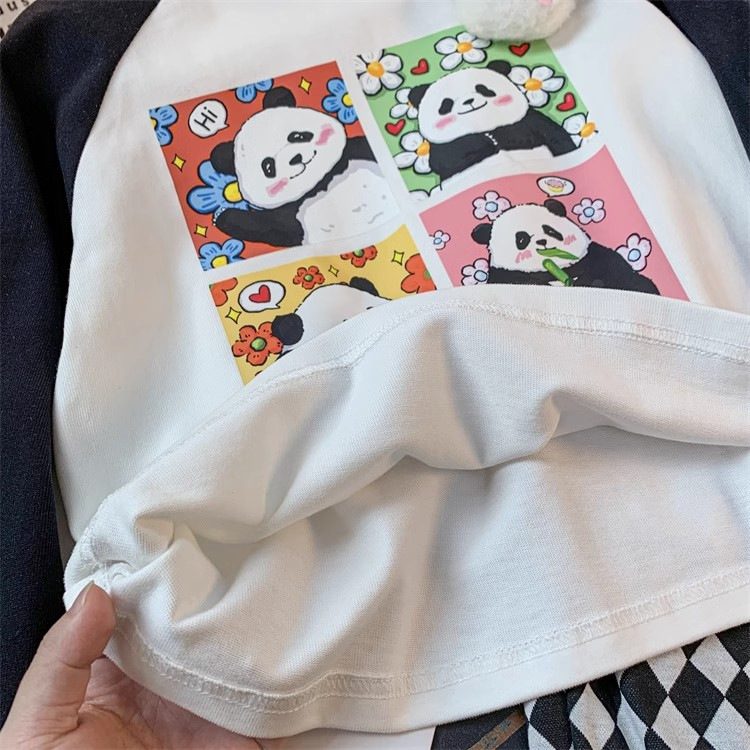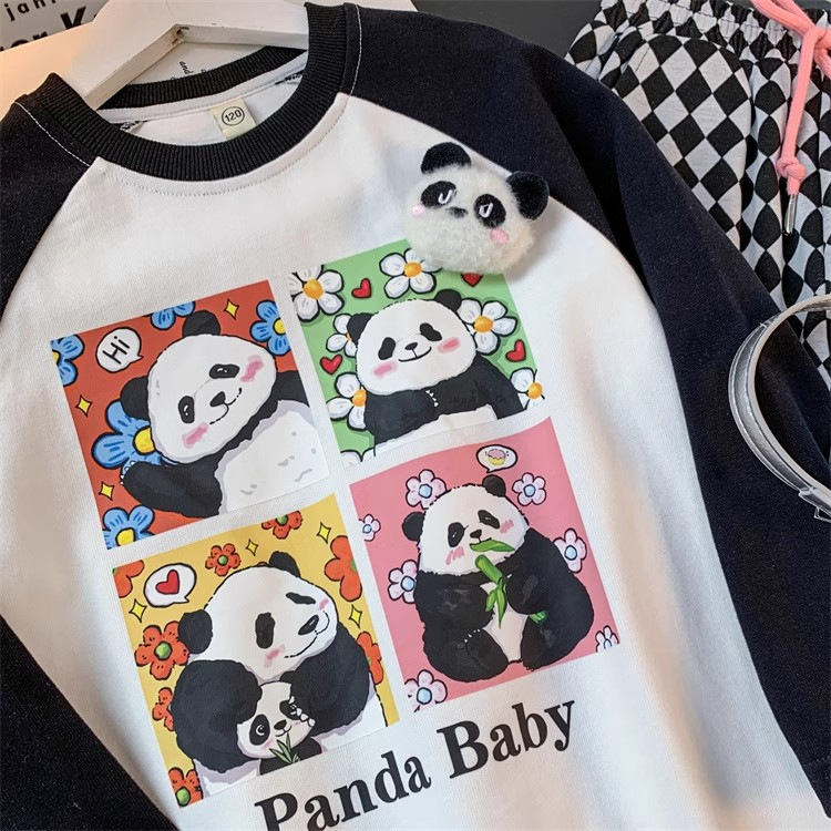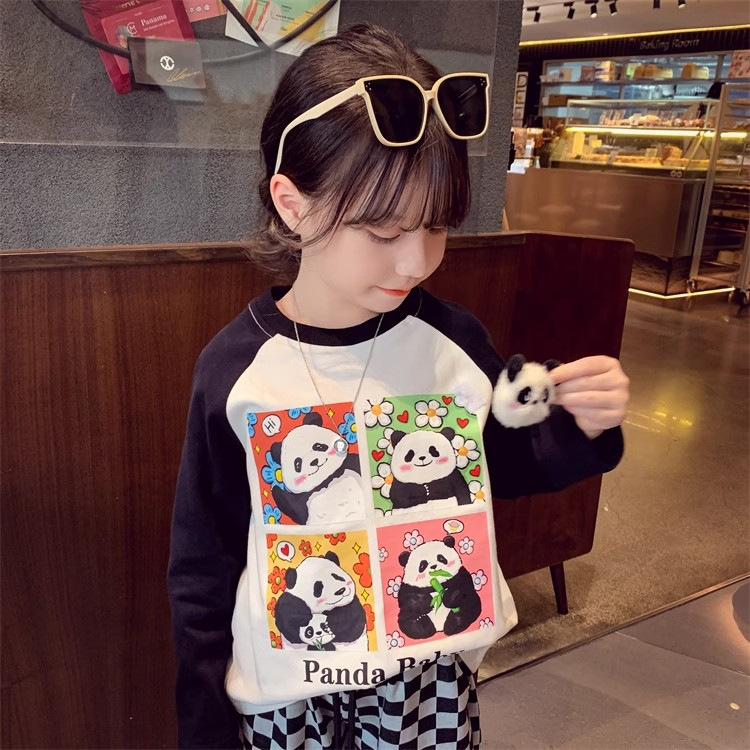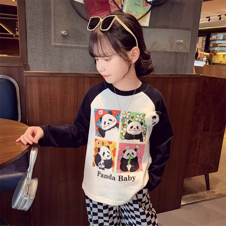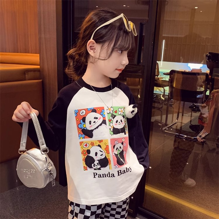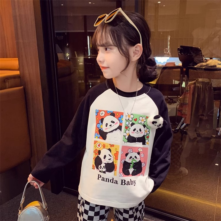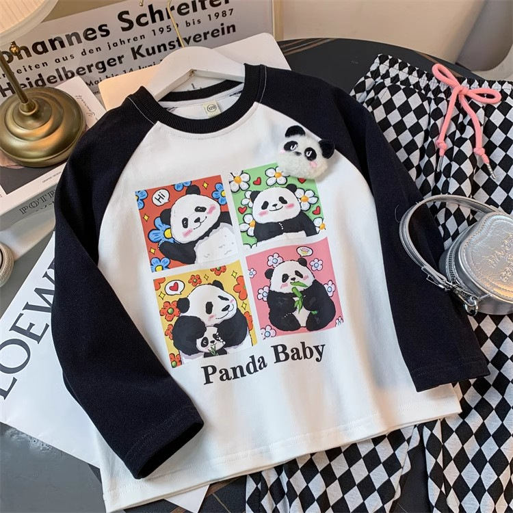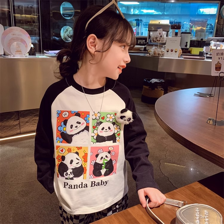 봄과 가을 새로운 2024 소녀의 만화 귀여운 팬더 편지 인쇄 패션 모든 경기 서양 스타일 긴 소매 순수한 면화 탑스토어 가기