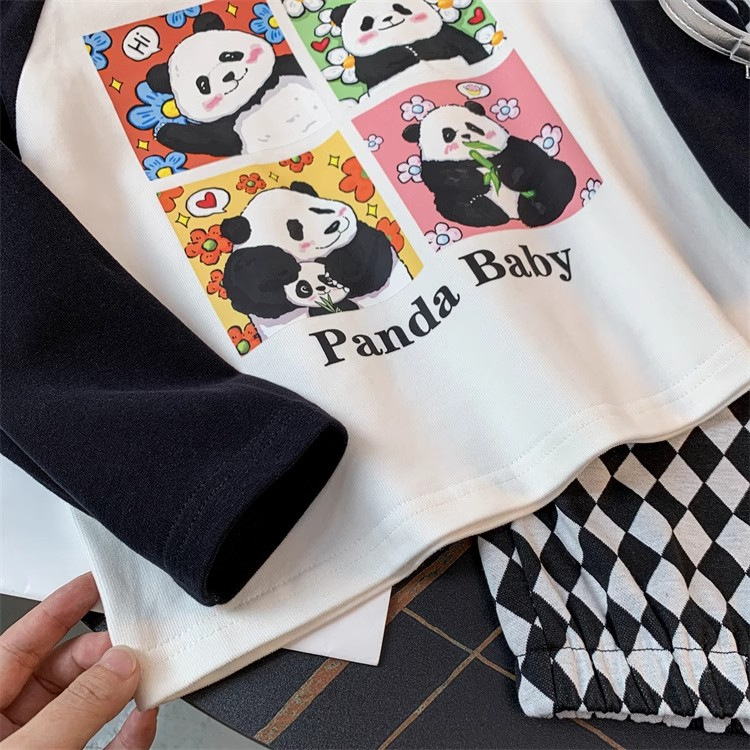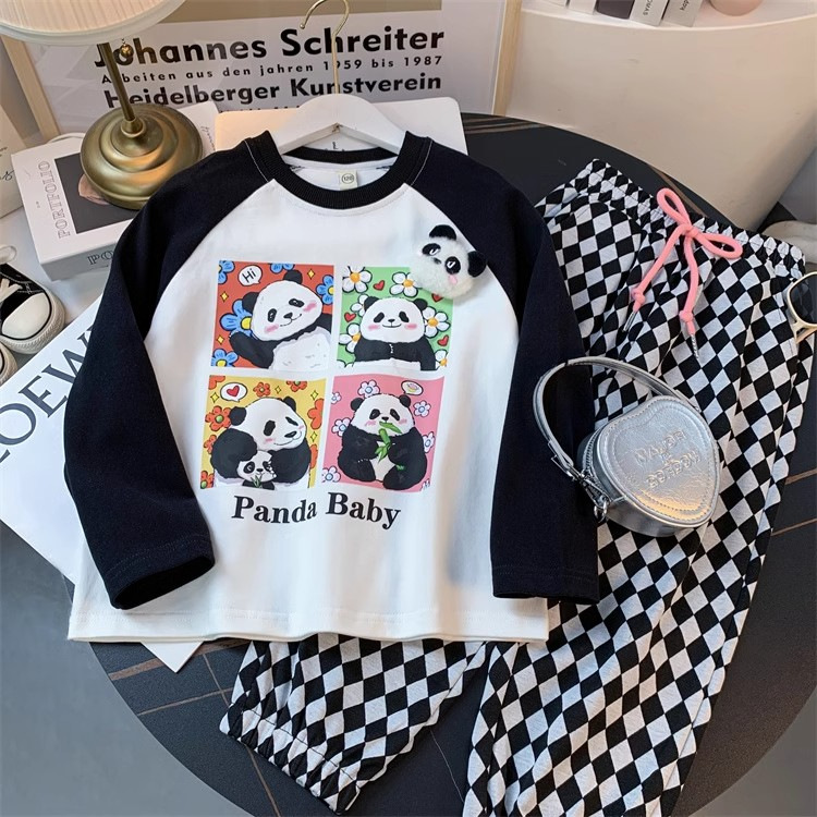 봄과 가을 새로운 2024 소녀의 만화 귀여운 팬더 편지 인쇄 패션 모든 경기 서양 스타일 긴 소매 순수한 면화 탑