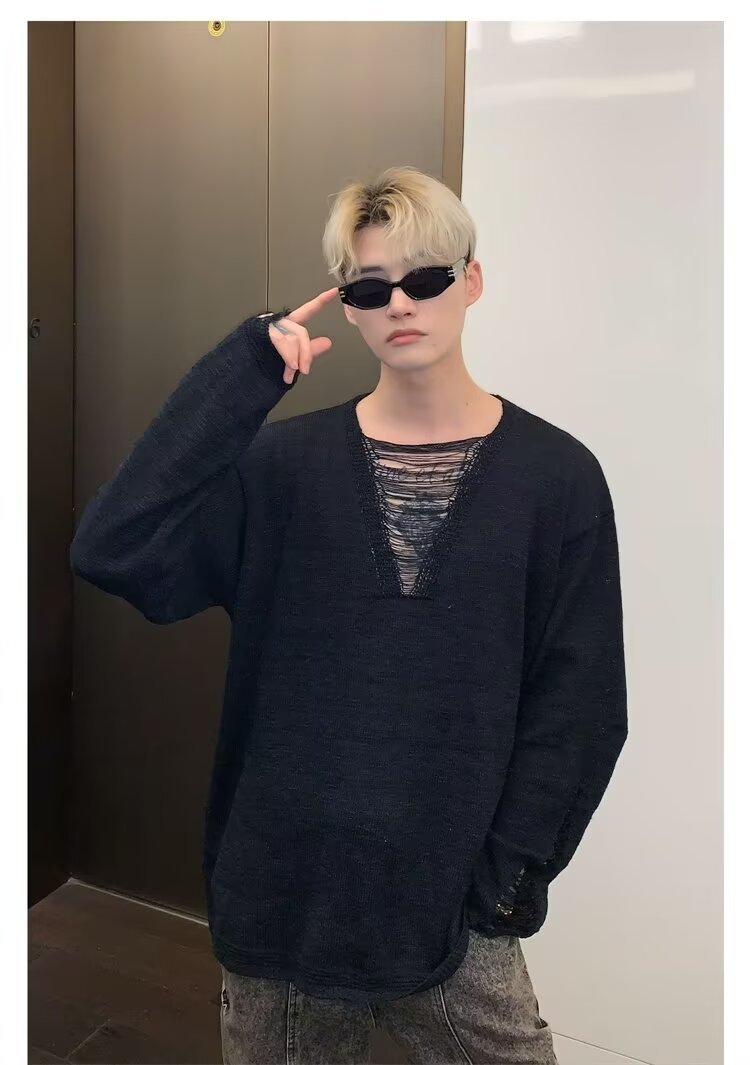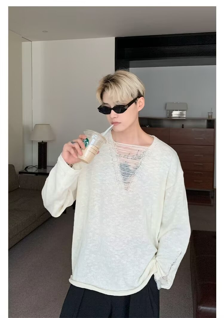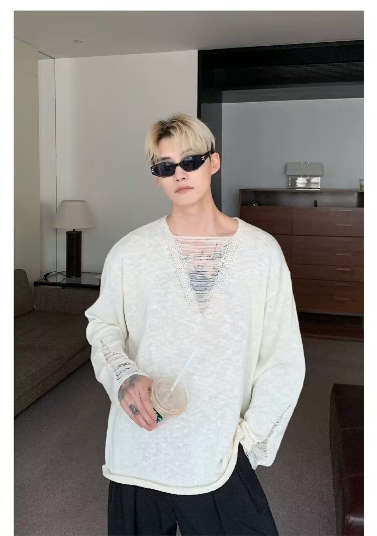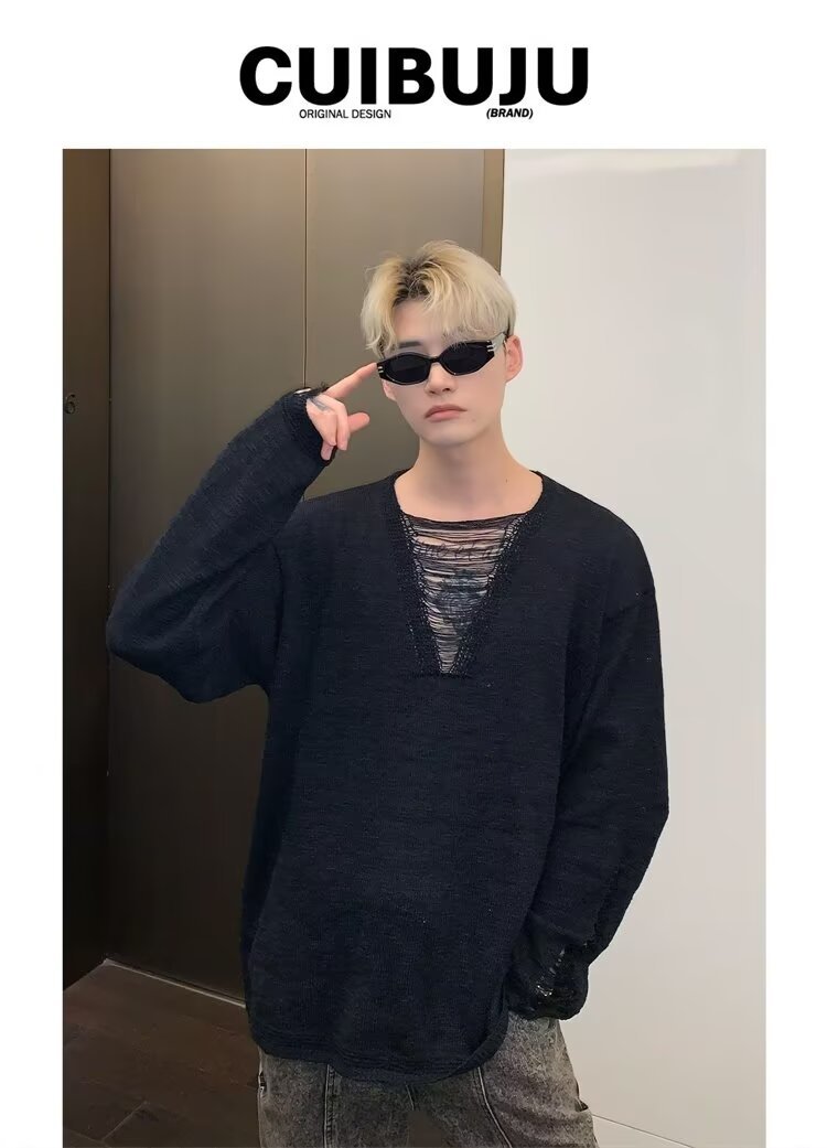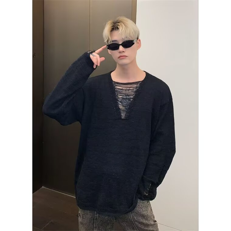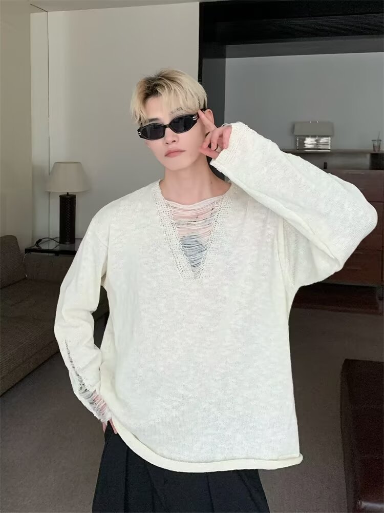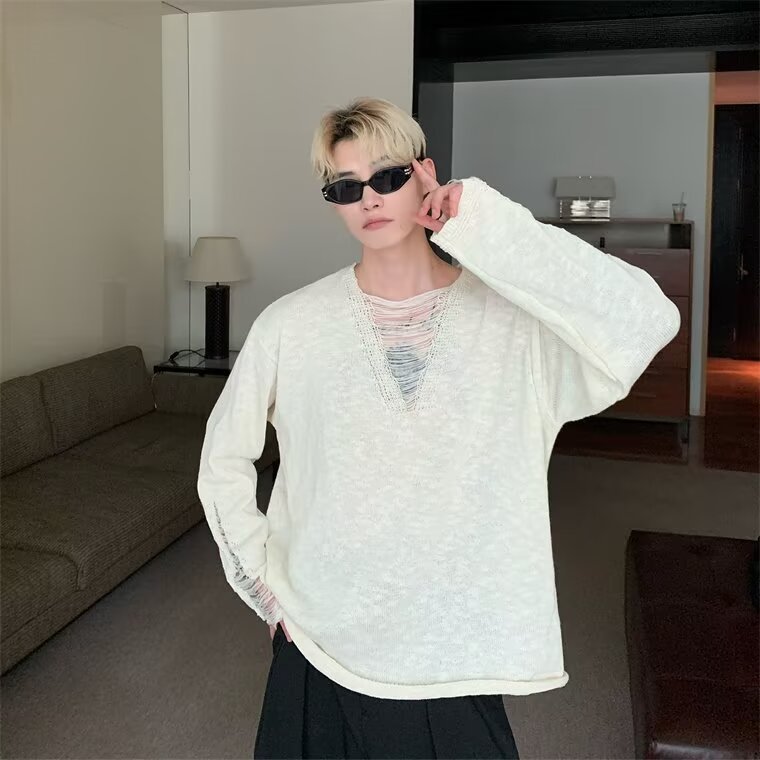 아메리칸 스타일 복고풍 디자인 센스 긴 소매 스웨터 남자 2024 새로운 찢어진 술 니트 스웨터 하이 센스 니쉬 재킷스토어 가기