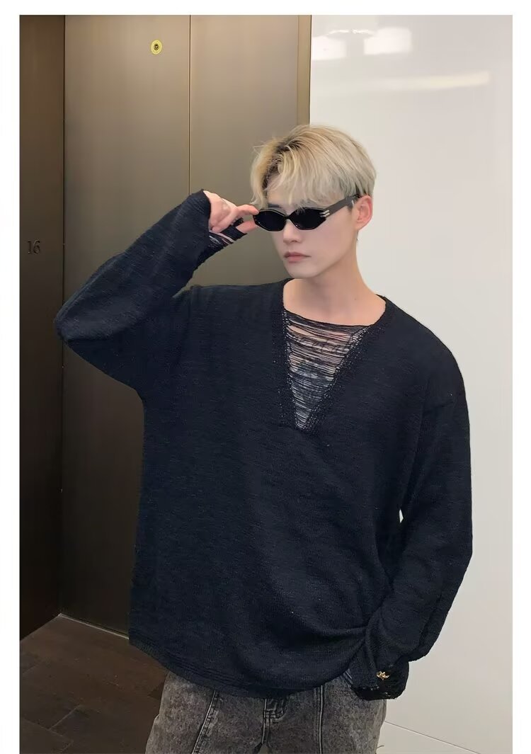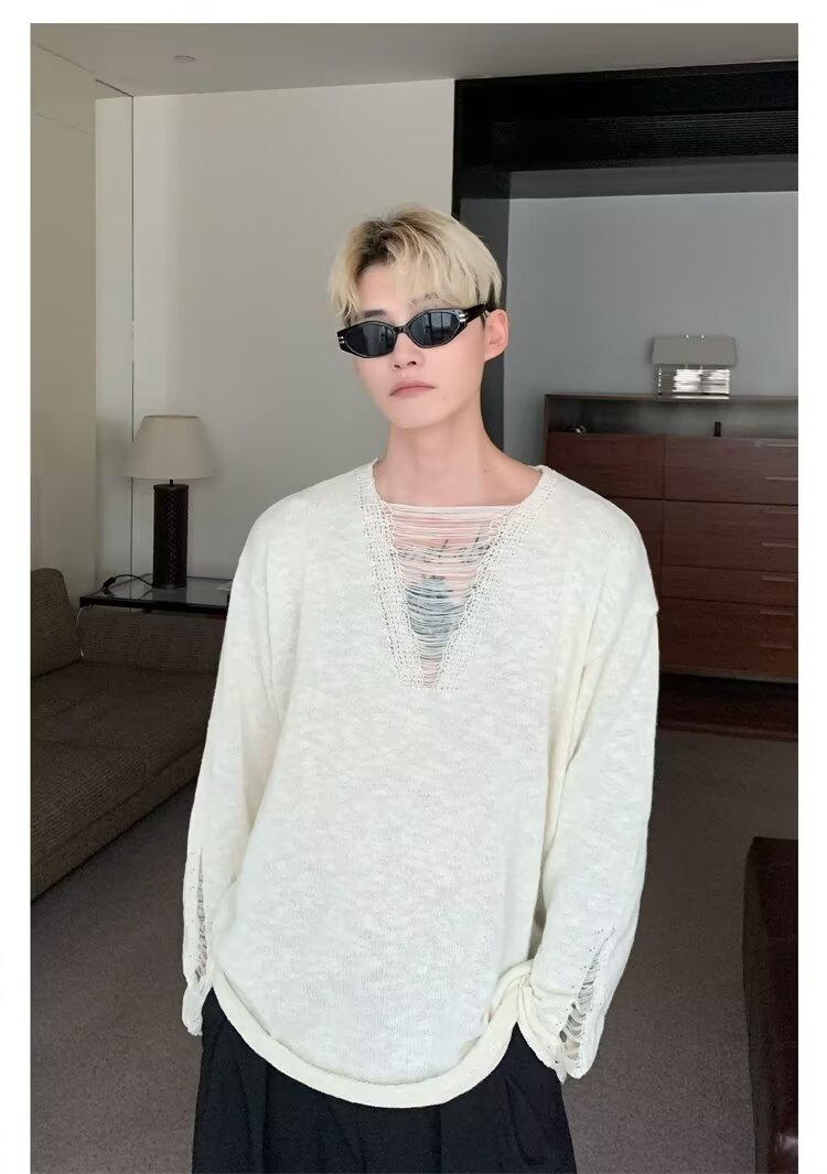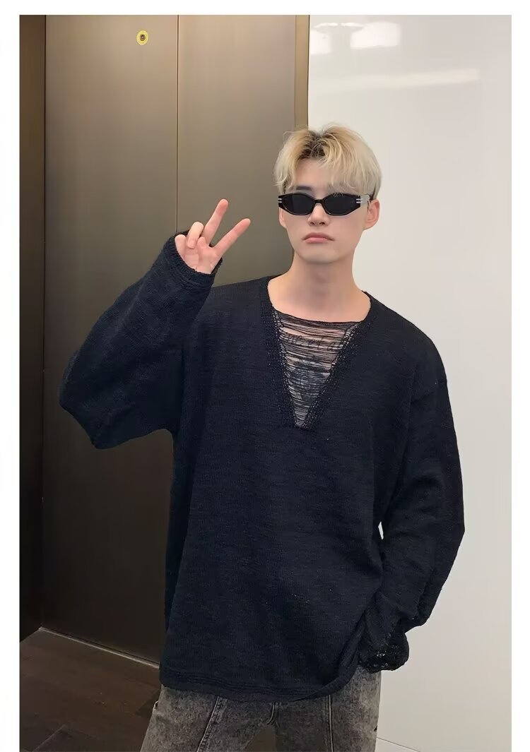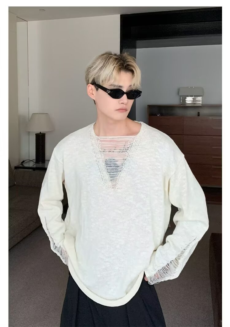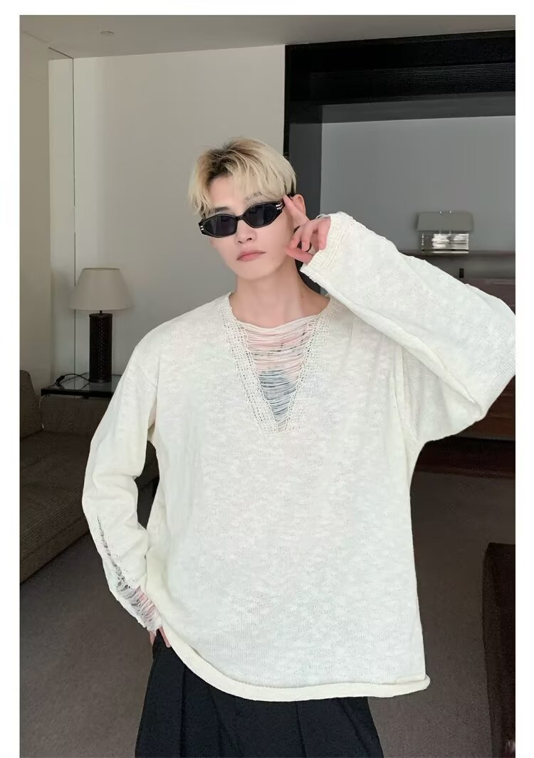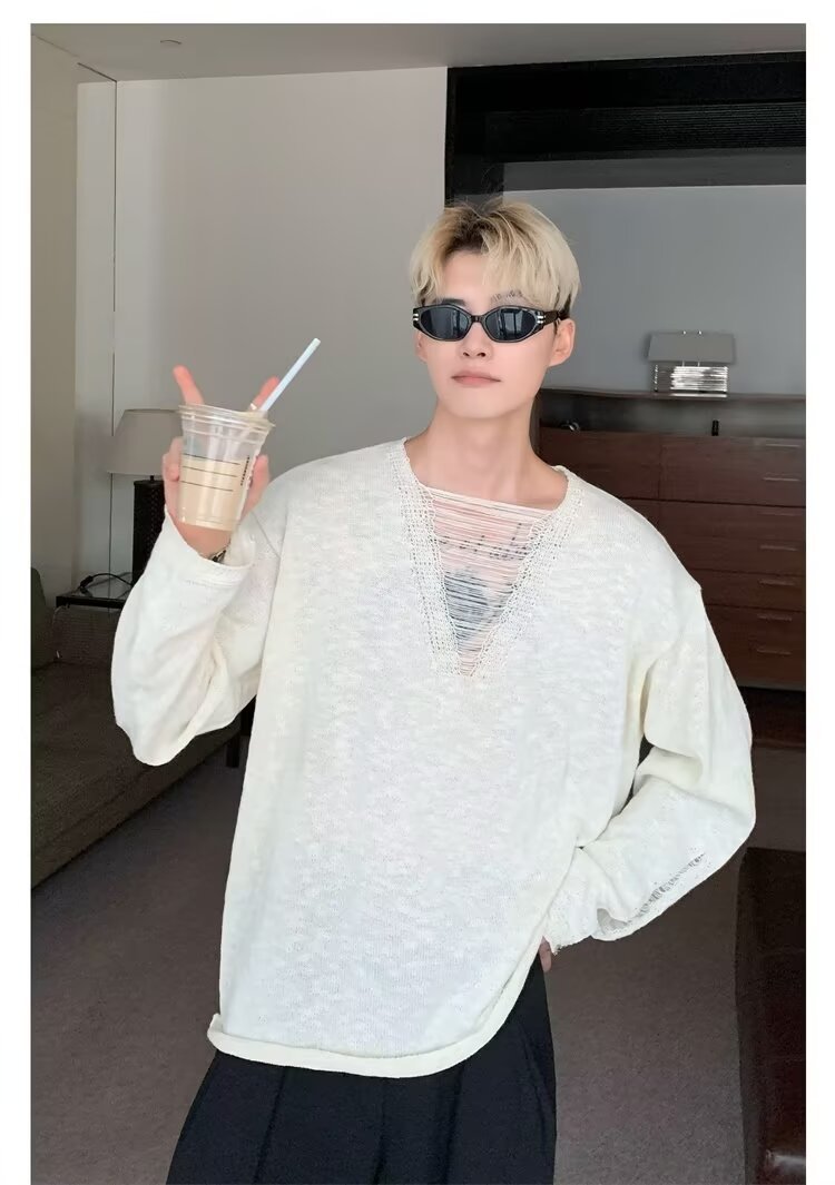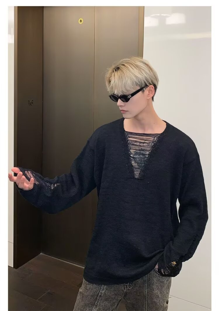 아메리칸 스타일 복고풍 디자인 센스 긴 소매 스웨터 남자 2024 새로운 찢어진 술 니트 스웨터 하이 센스 니쉬 재킷스토어 가기