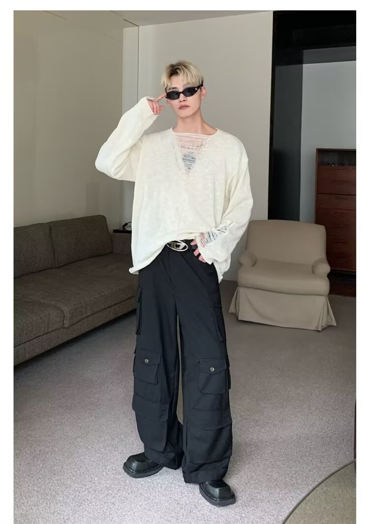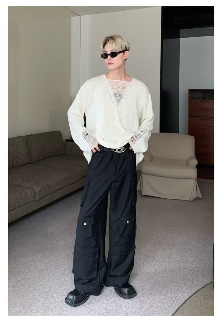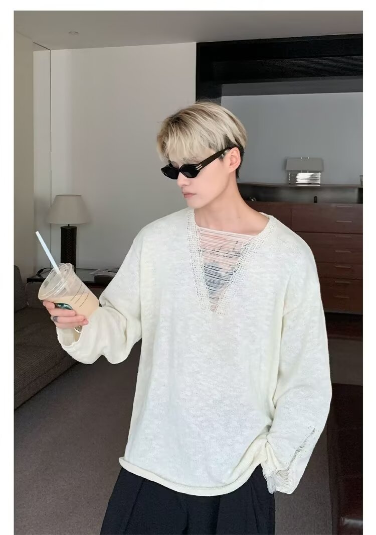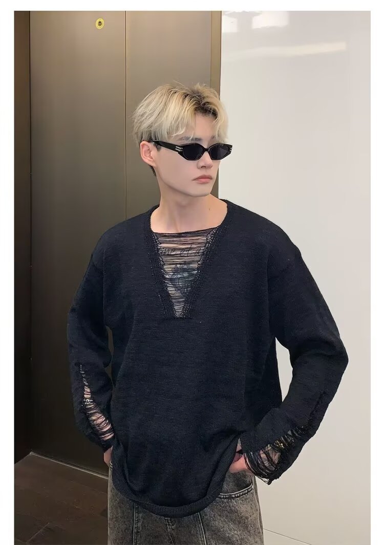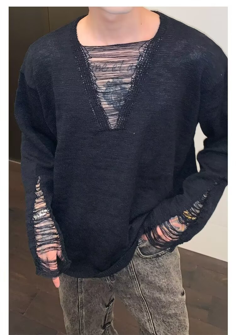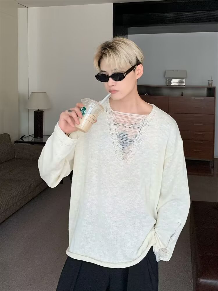 아메리칸 스타일 복고풍 디자인 센스 긴 소매 스웨터 남자 2024 새로운 찢어진 술 니트 스웨터 하이 센스 니쉬 재킷