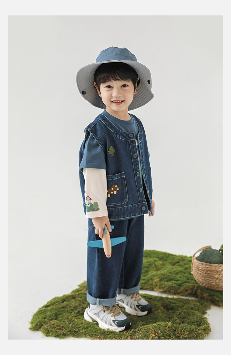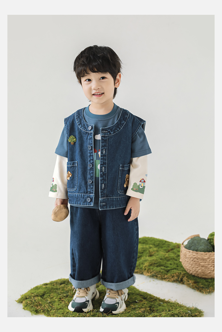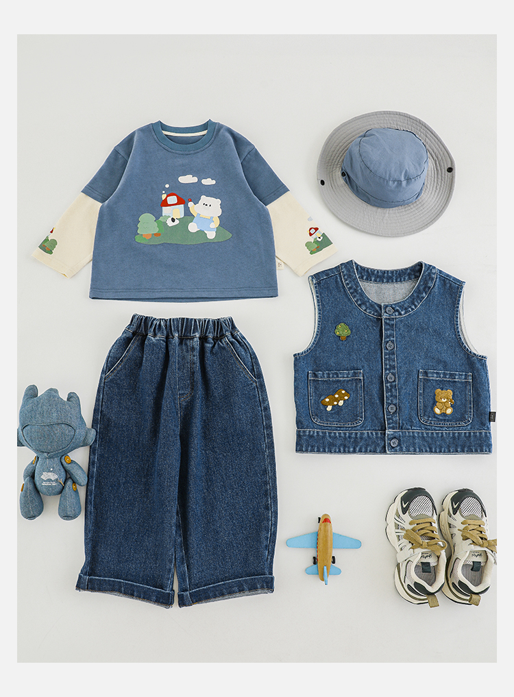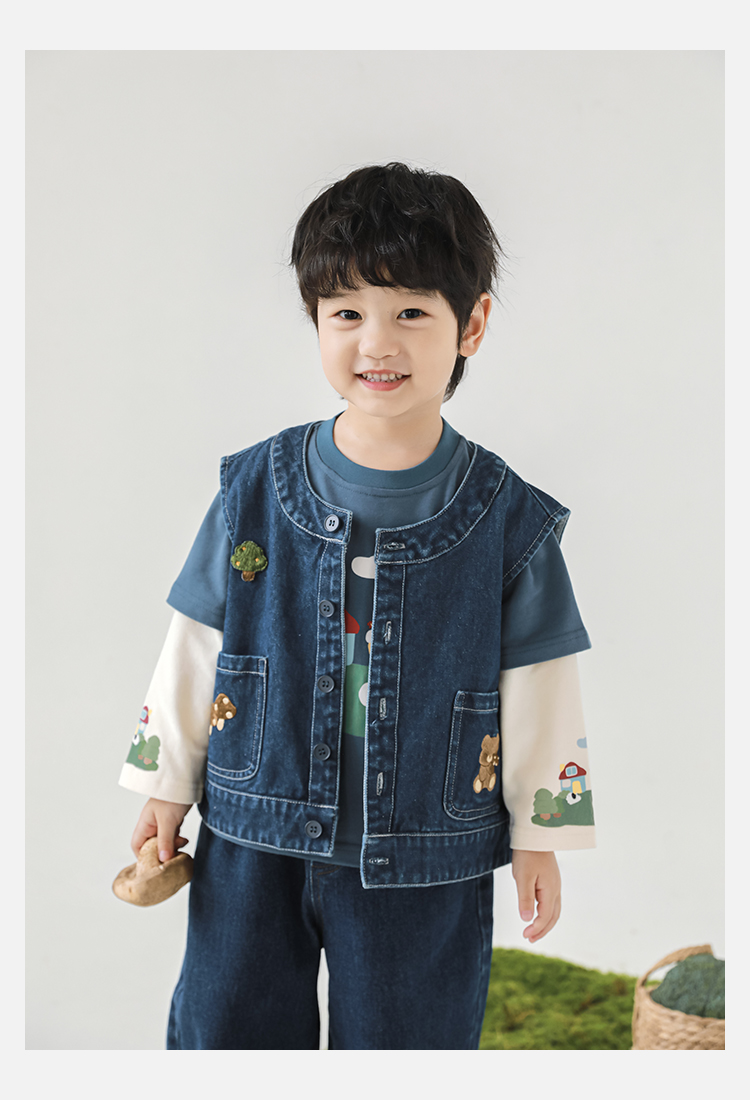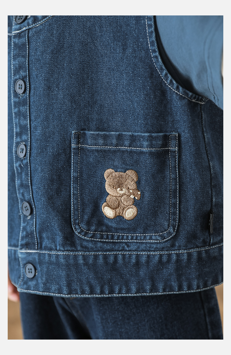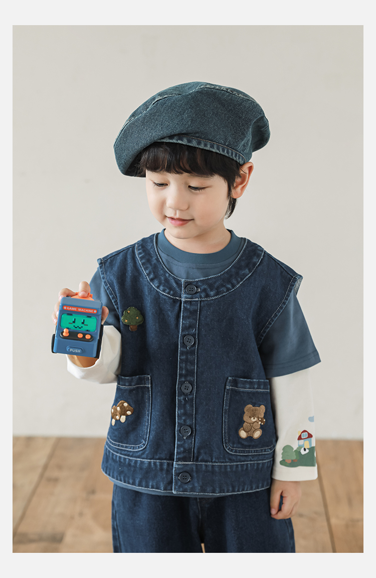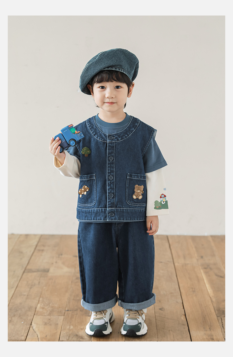 Wuribu 아동복 소년 데님 조끼 2024 새로운 패션 올 매치 트렌디 한 민소매 곰 조끼스토어 가기
