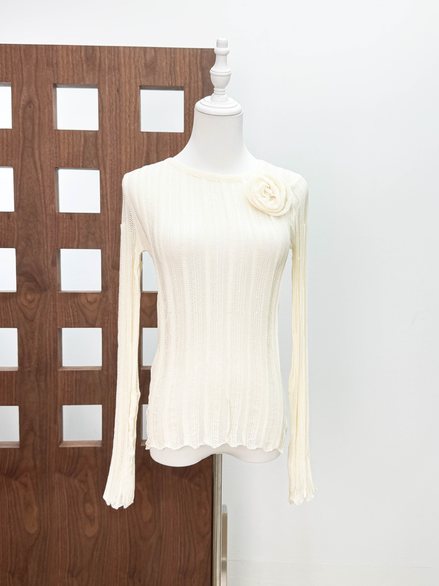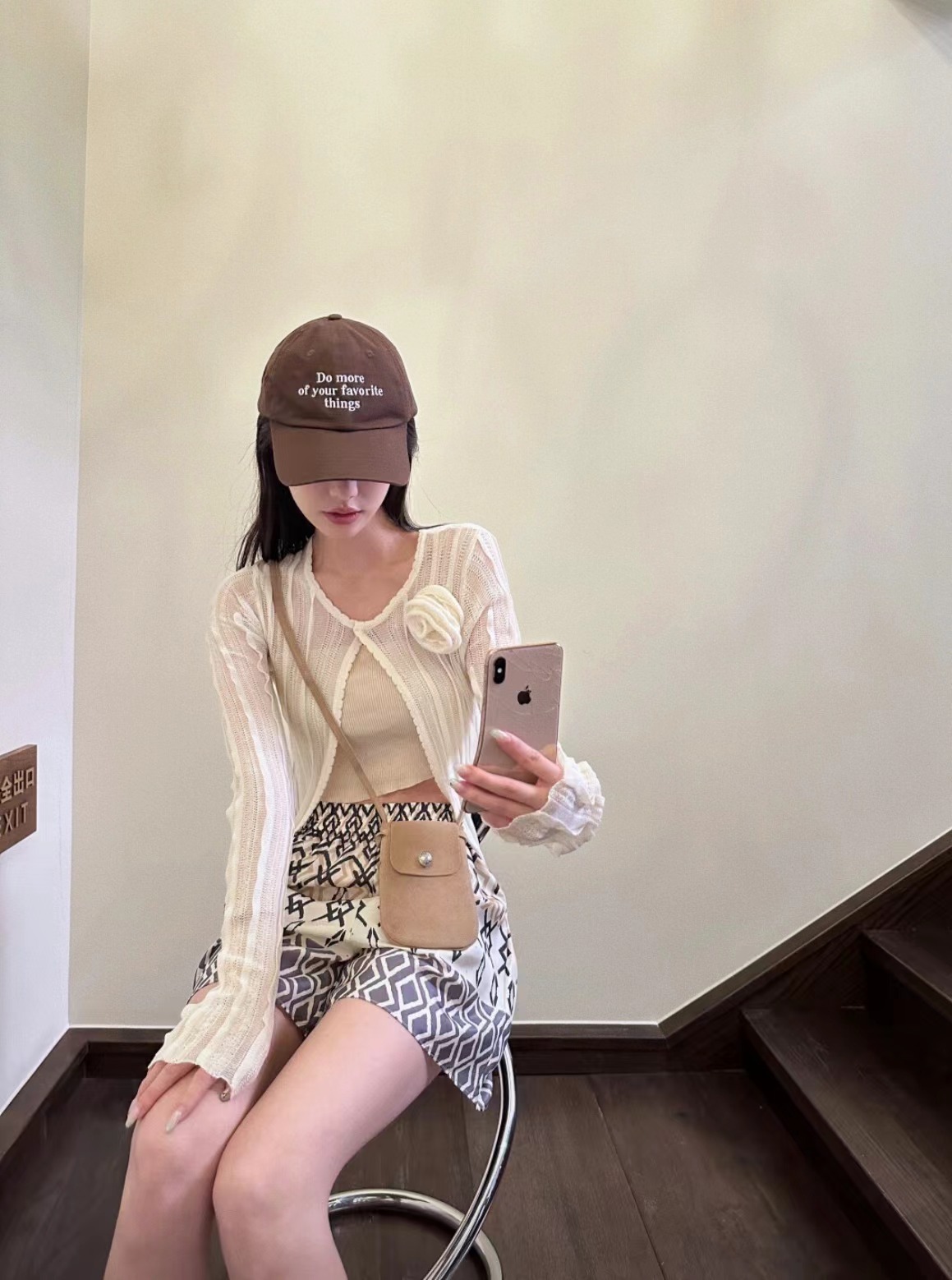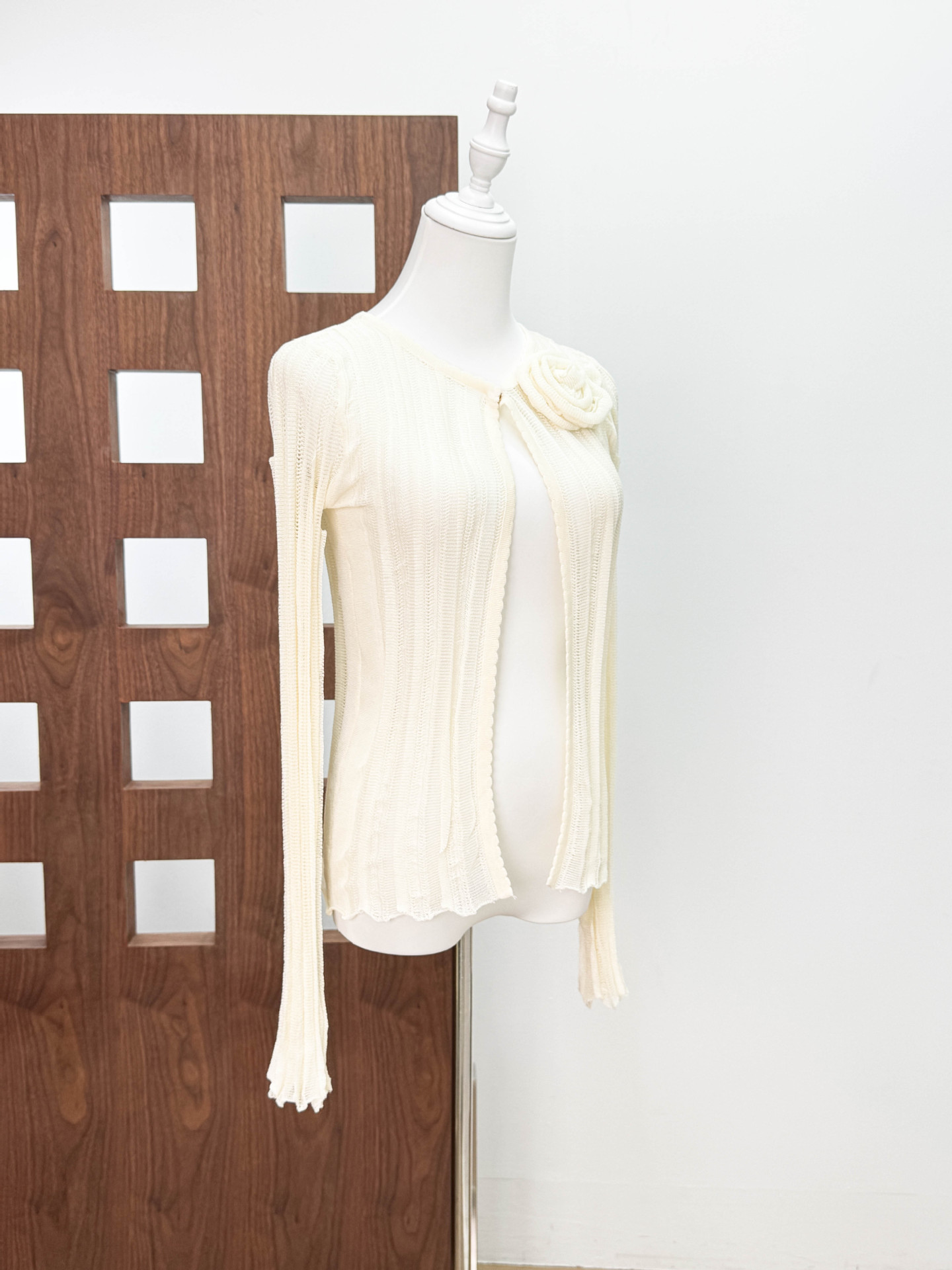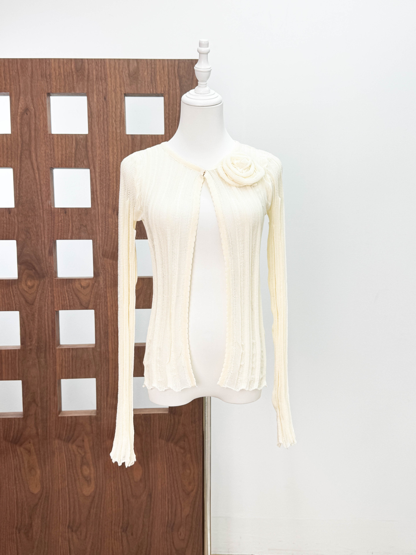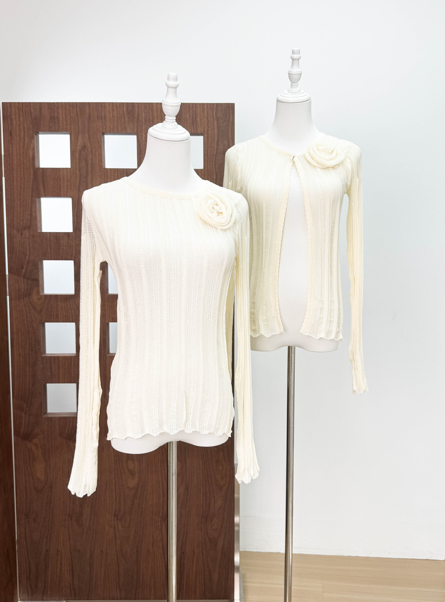 2025ss 프렌치 스타일의 부드러운 감성과 여유로운 분위기, 입체적인 꽃무늬로 나이를 덜어주는 베이지색 니트 가디건 여성용스토어 가기