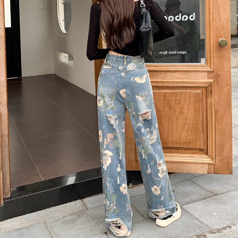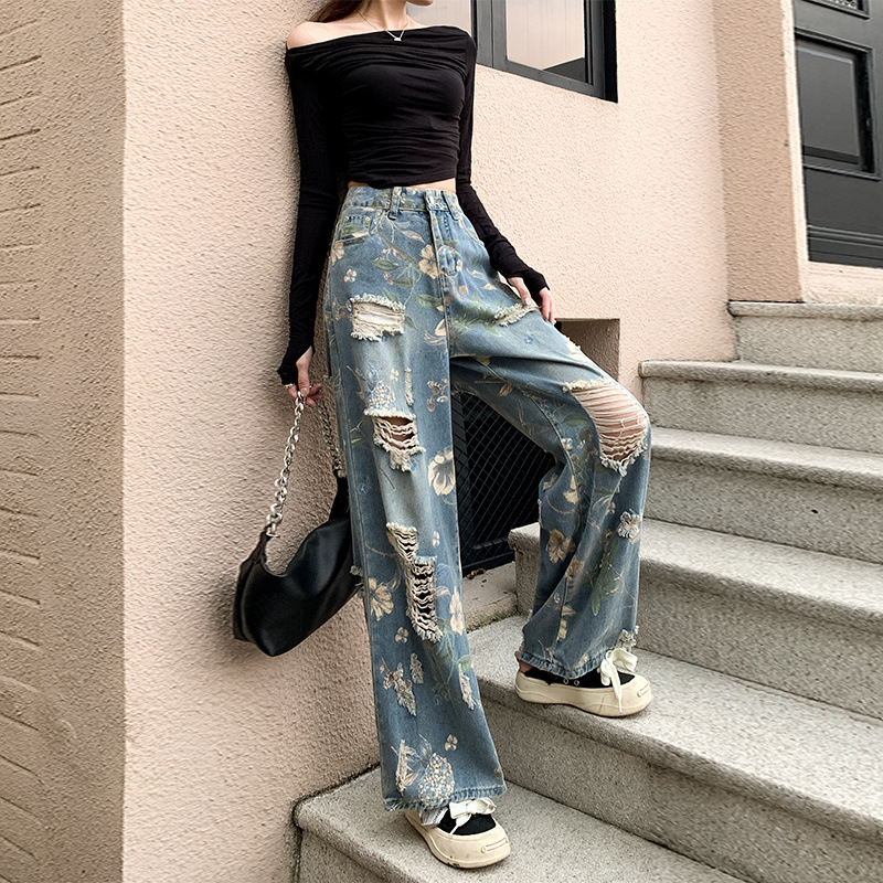 전국 패션 아메리칸 스타일 레트로 인쇄 된 찢어진 청바지 여성 여름 새로운 디자인 감각 느슨한 슬림 넓은 다리 바지