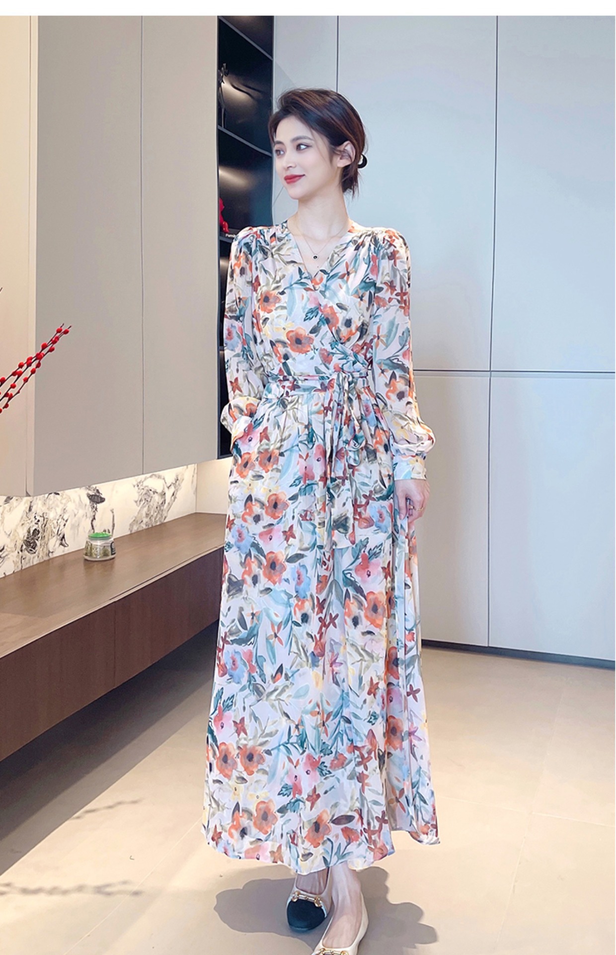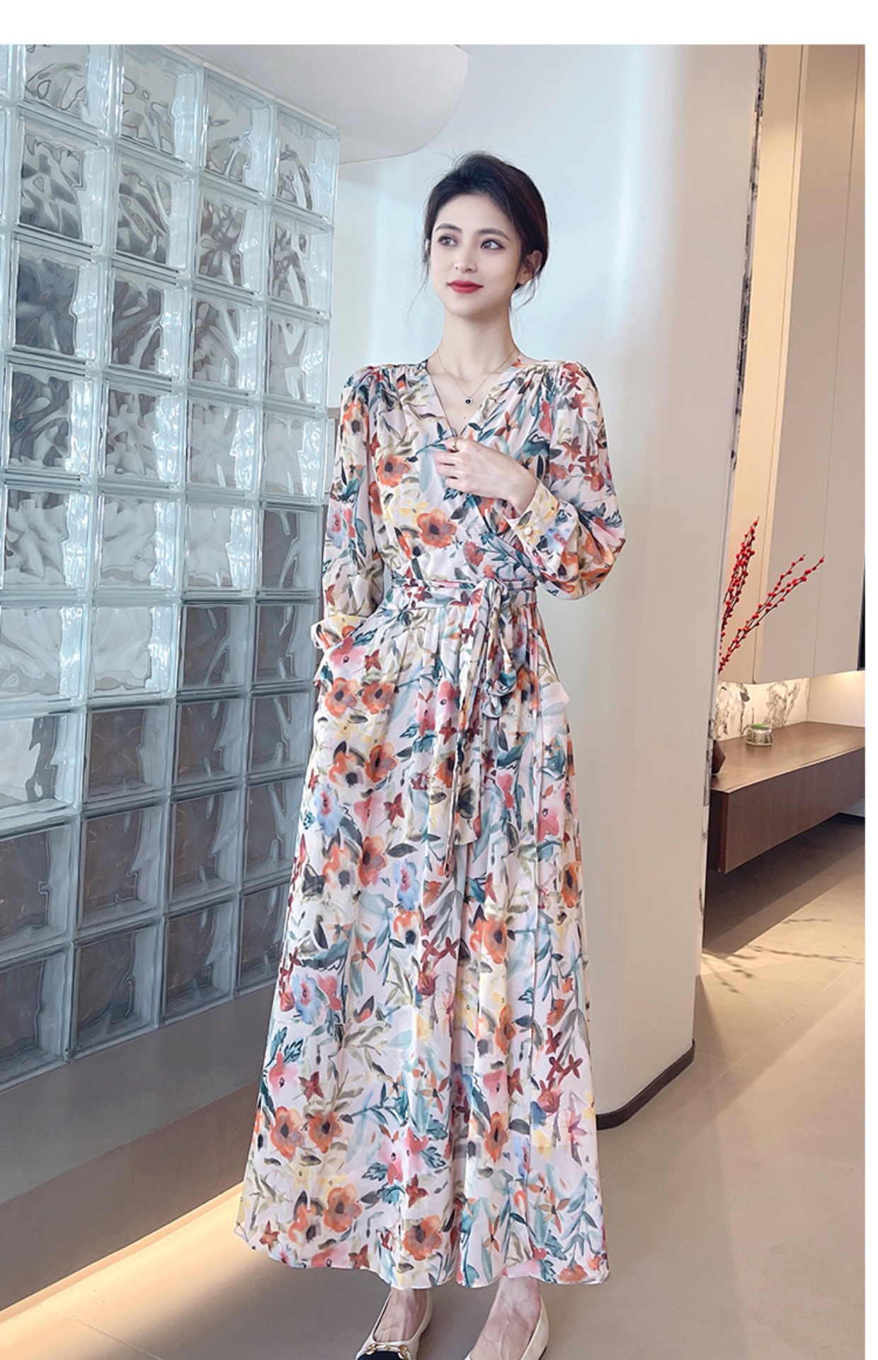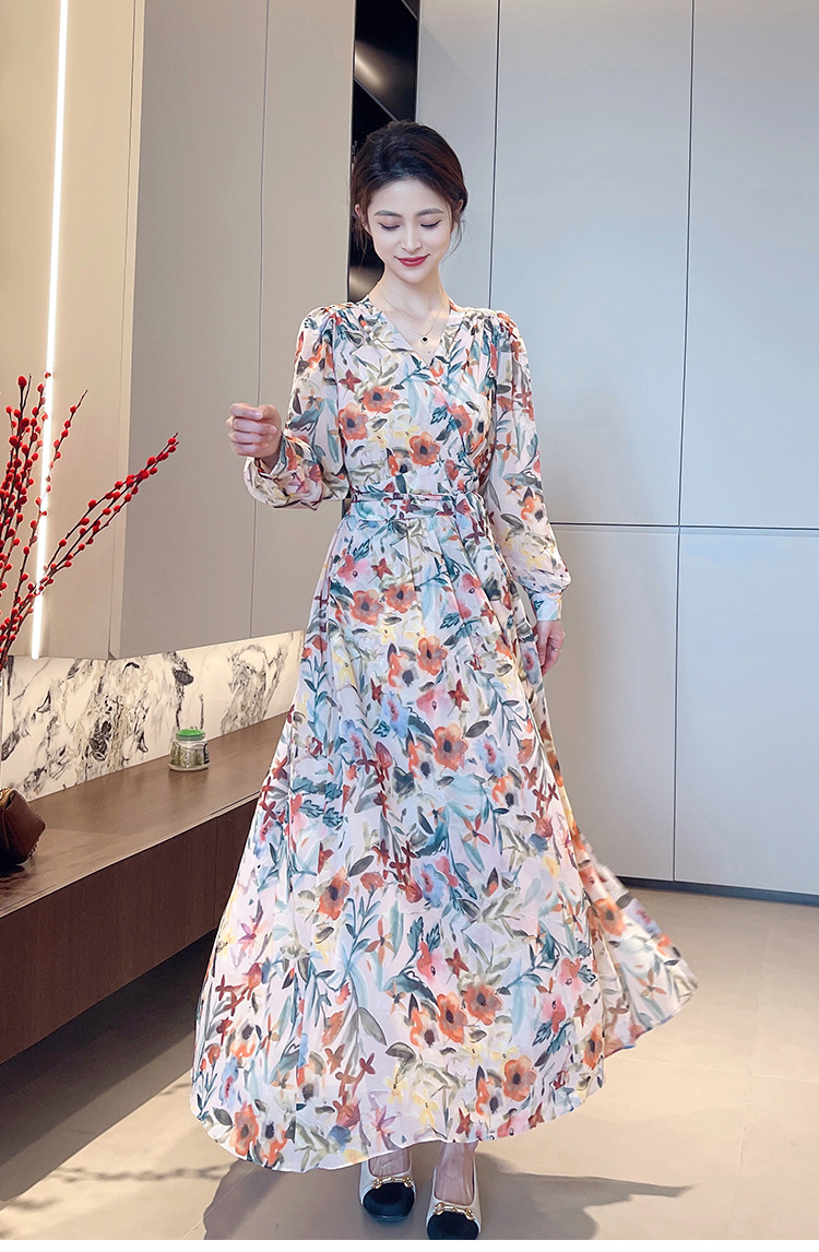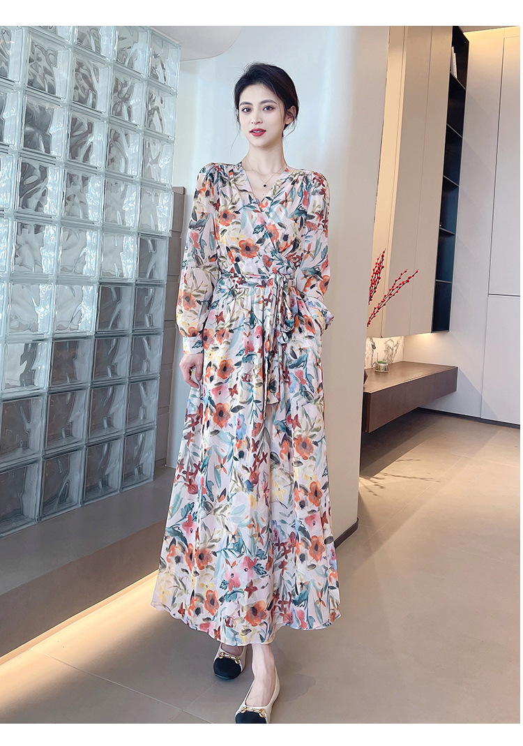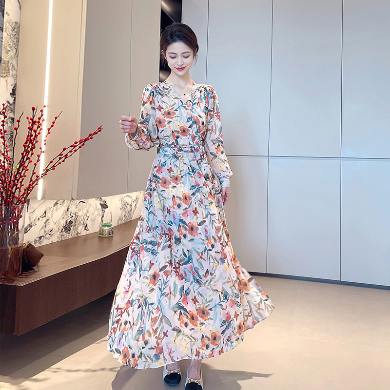 긴 소매 꽃 쉬폰 원피스 여성의 봄과 가을 2024 새로운 우아한 허리 커버 배 슬림 달콤한 긴 치마스토어 가기