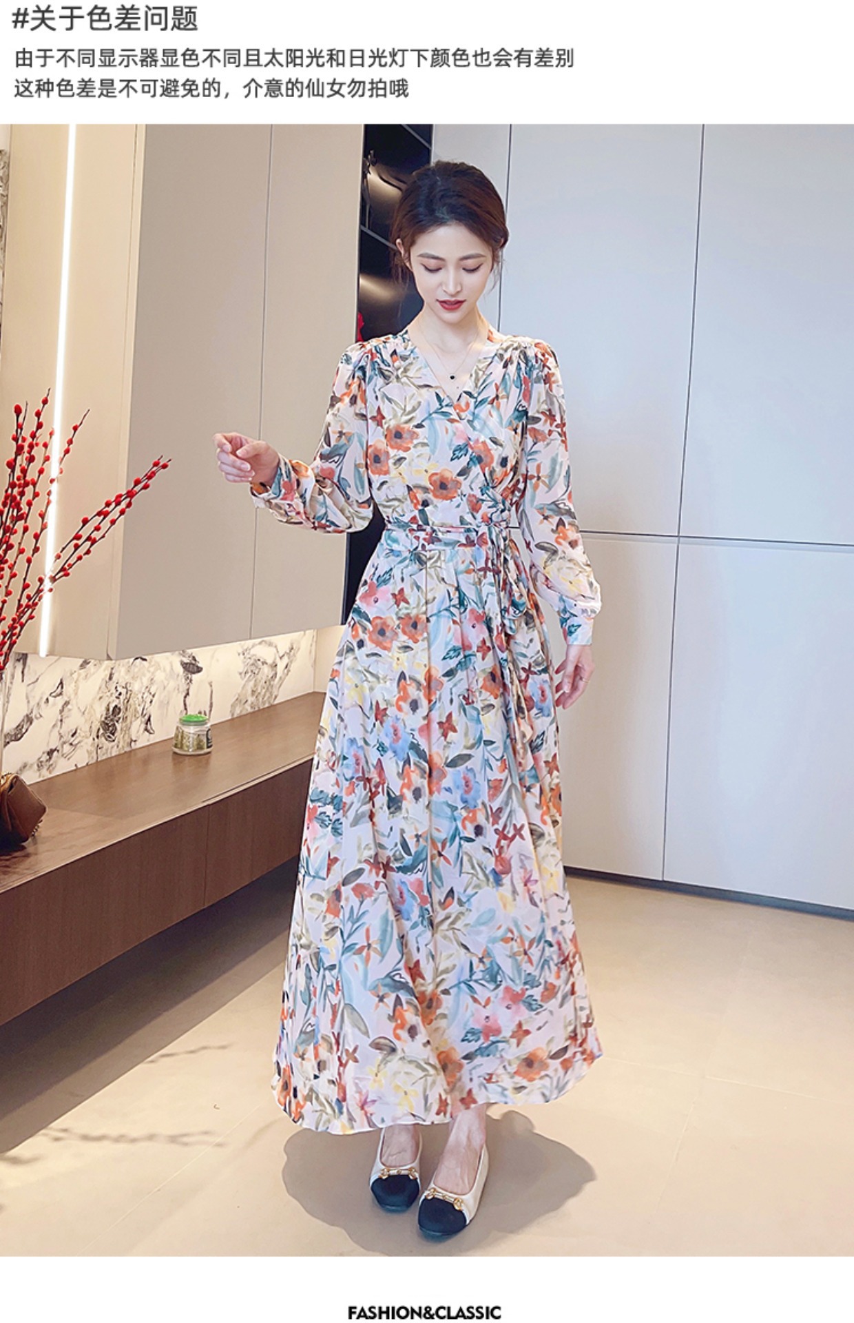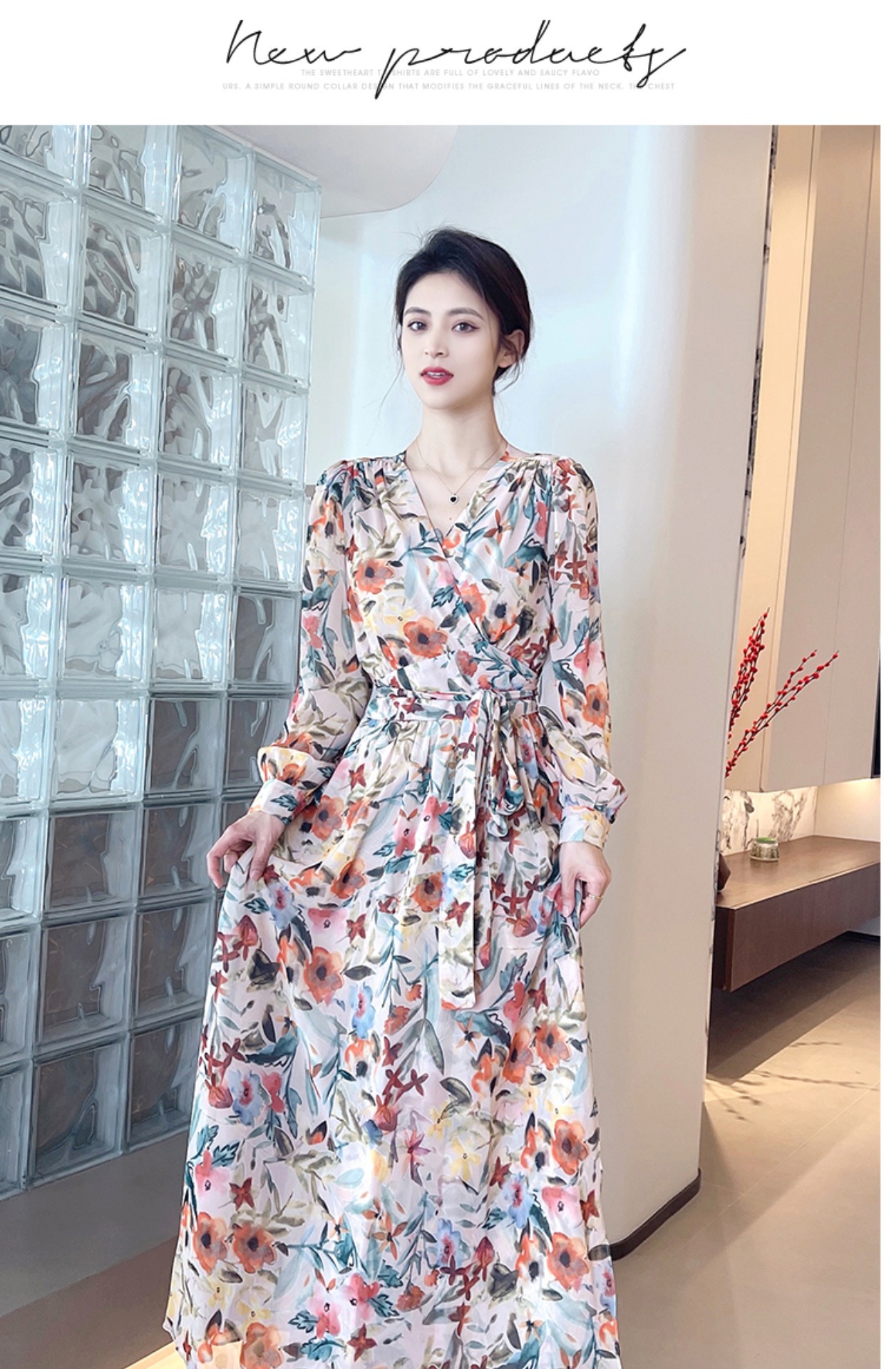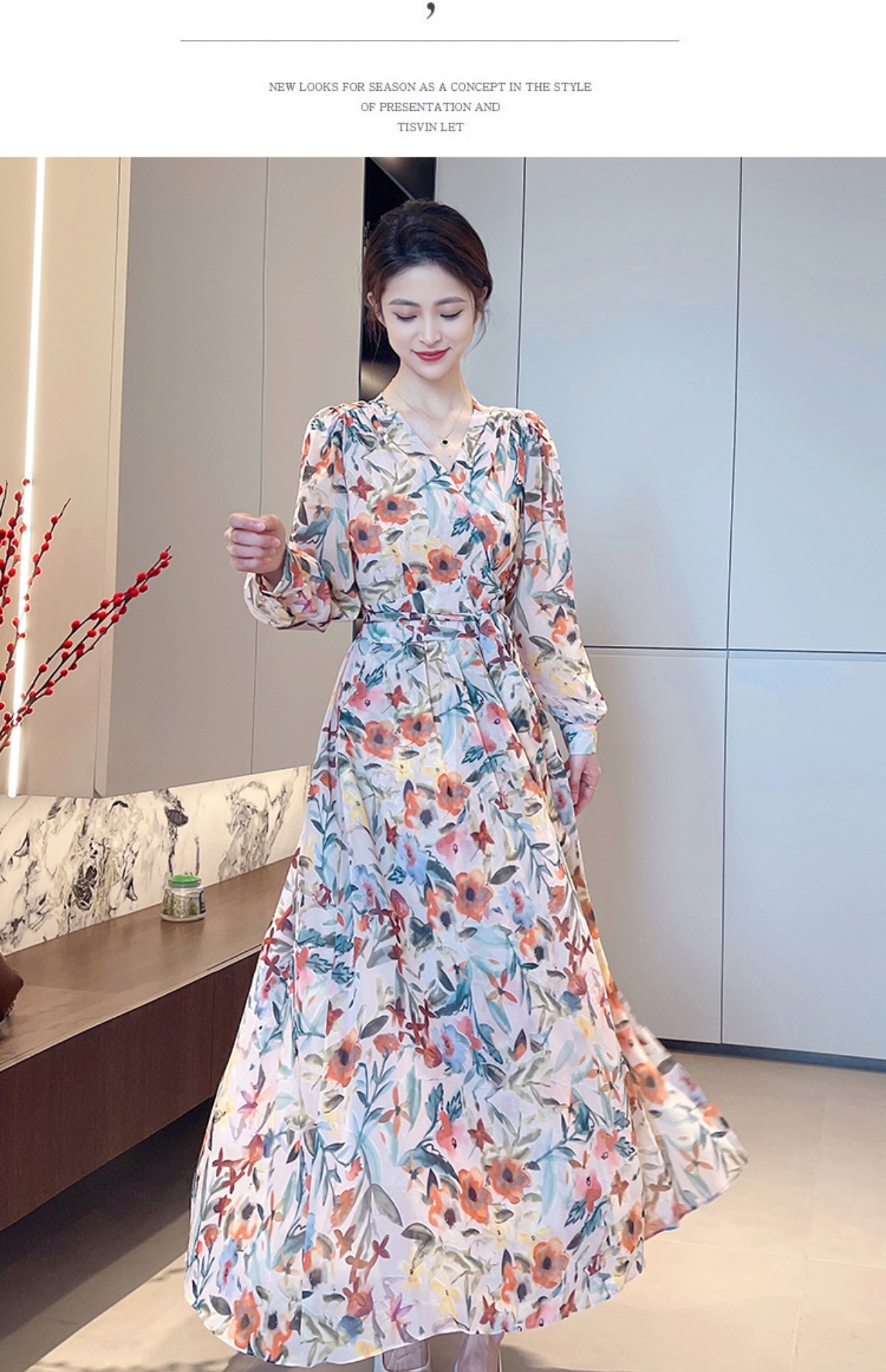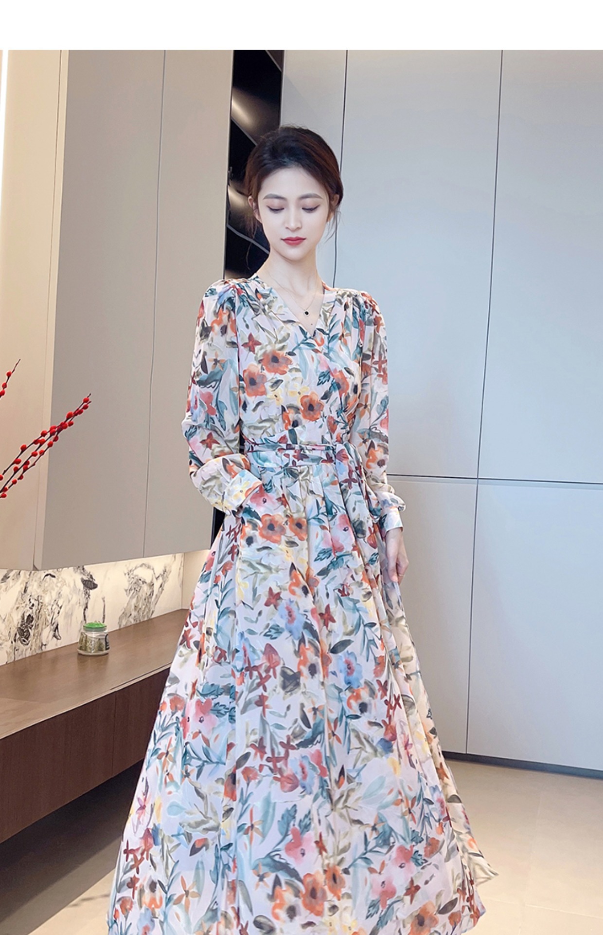 긴 소매 꽃 쉬폰 원피스 여성의 봄과 가을 2024 새로운 우아한 허리 커버 배 슬림 달콤한 긴 치마스토어 가기