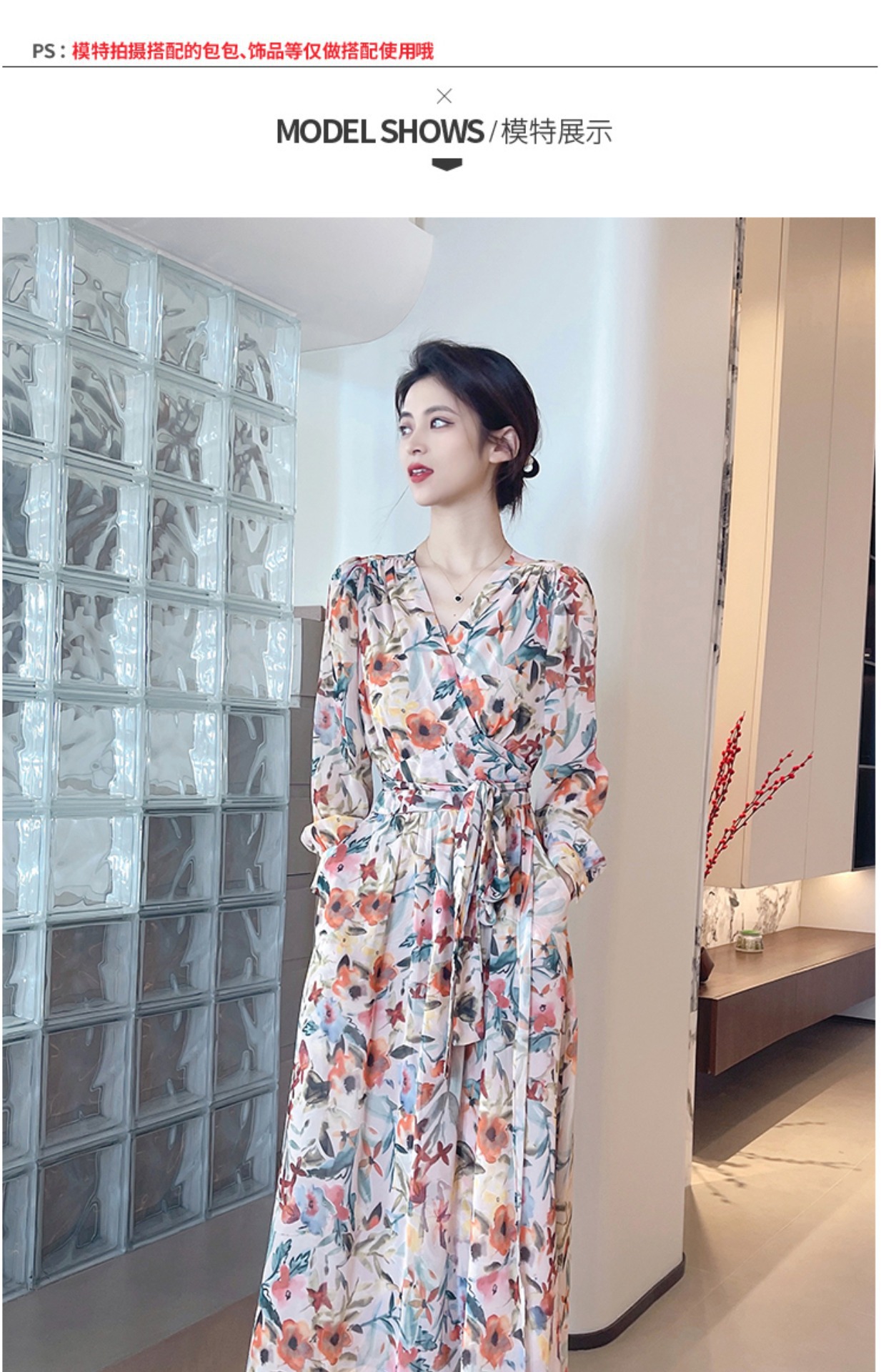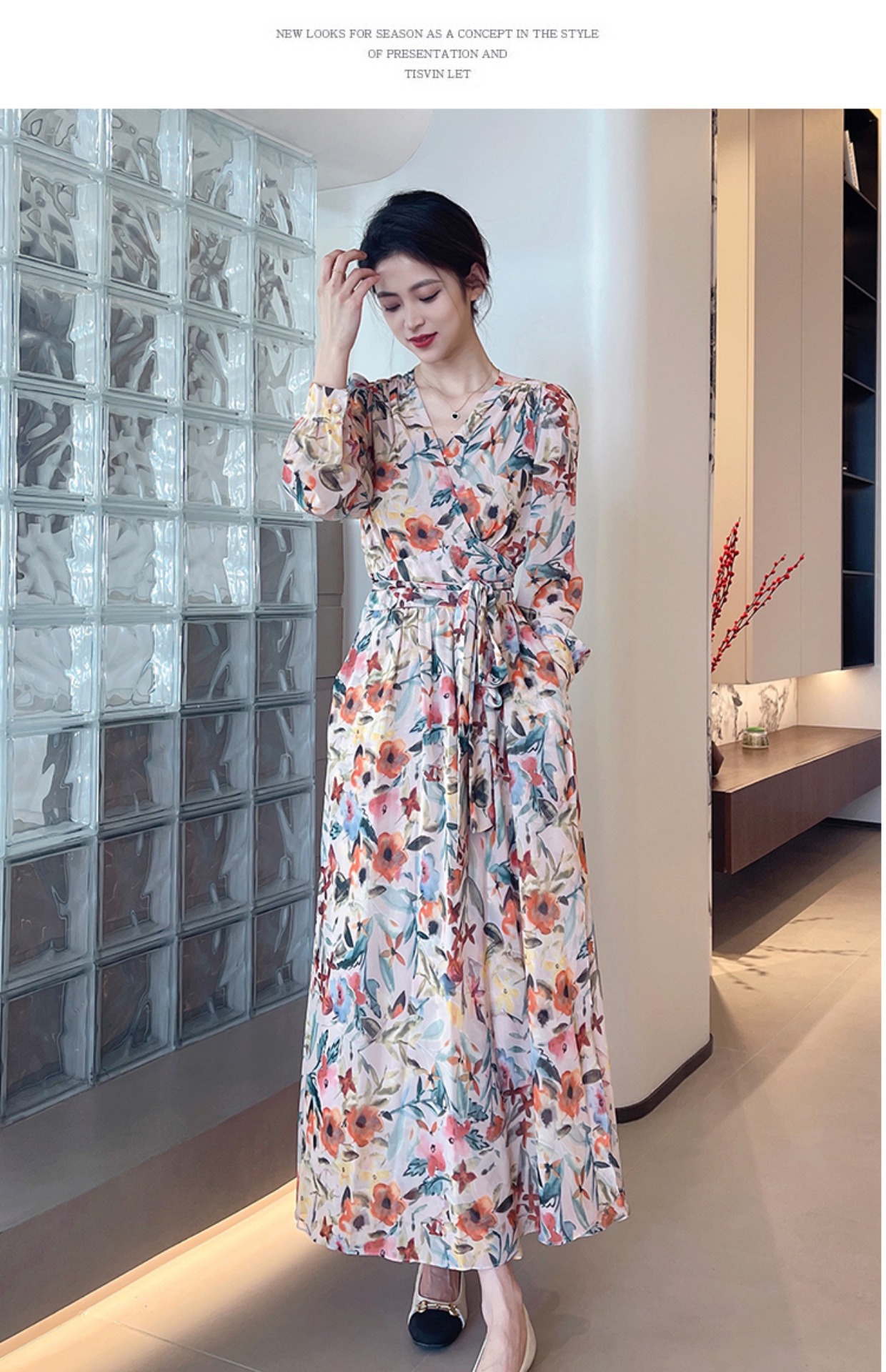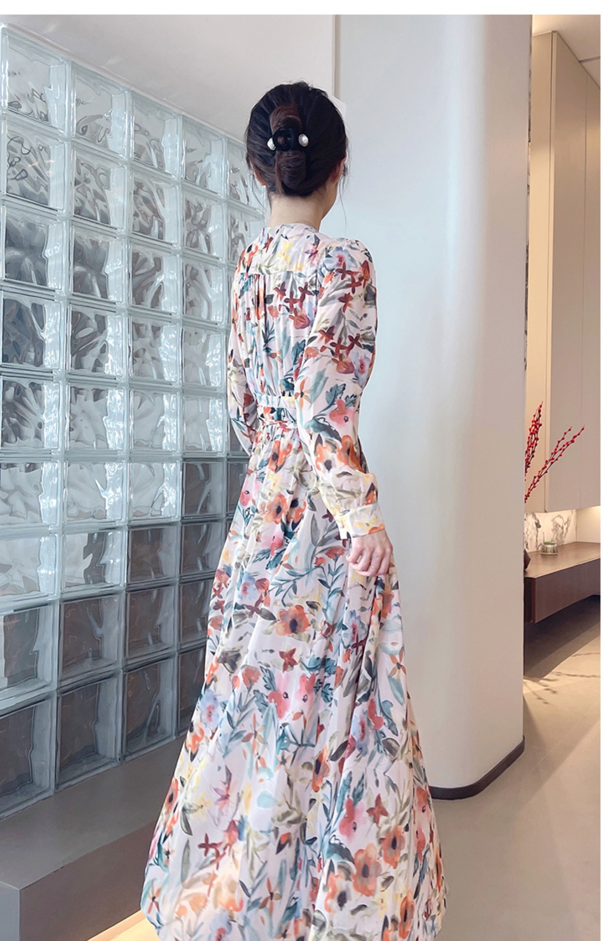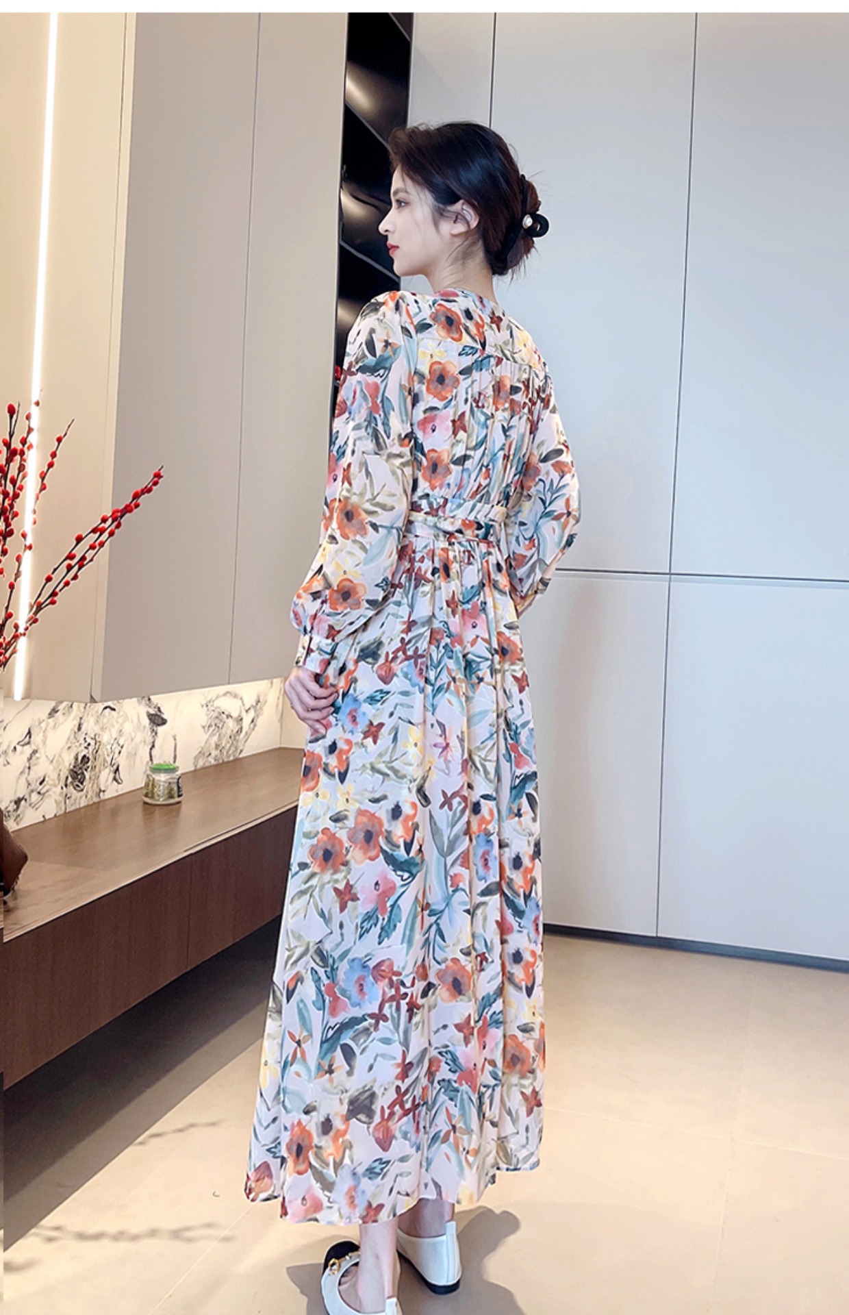 긴 소매 꽃 쉬폰 원피스 여성의 봄과 가을 2024 새로운 우아한 허리 커버 배 슬림 달콤한 긴 치마스토어 가기