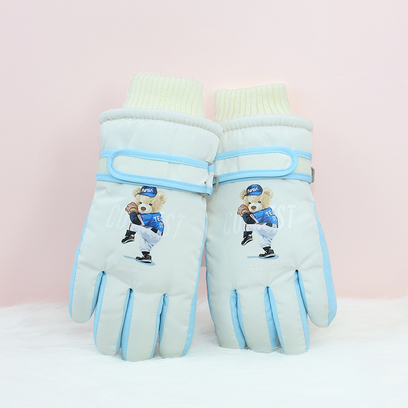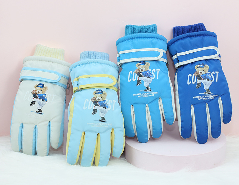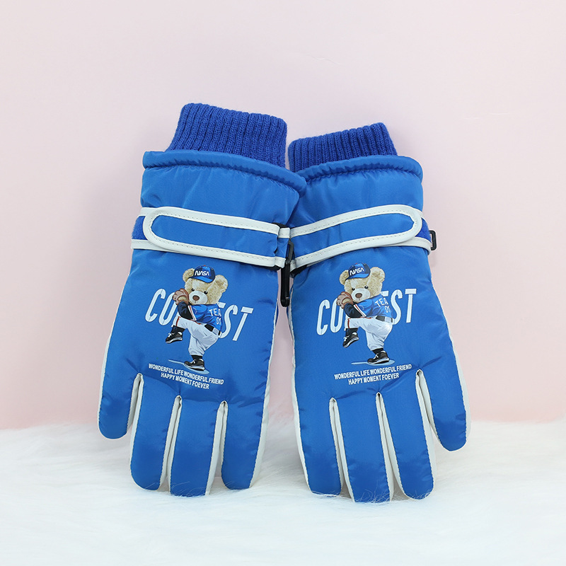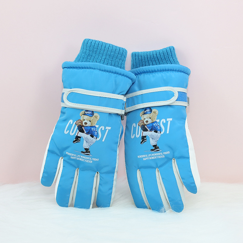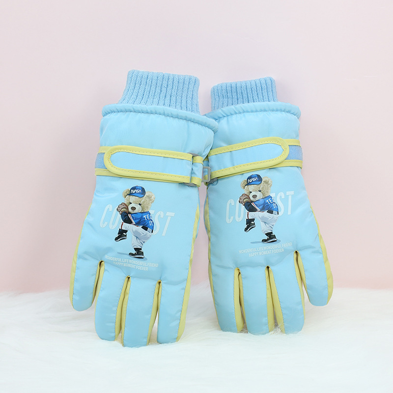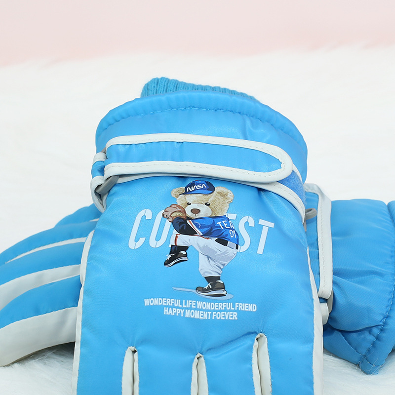童款滑雪手套采用记忆布面料,纤维细密,防水防风,360度立体裁剪,做工均匀走线细密,掌心指采用止滑革,内里采用的是绒料,柔软舒适。