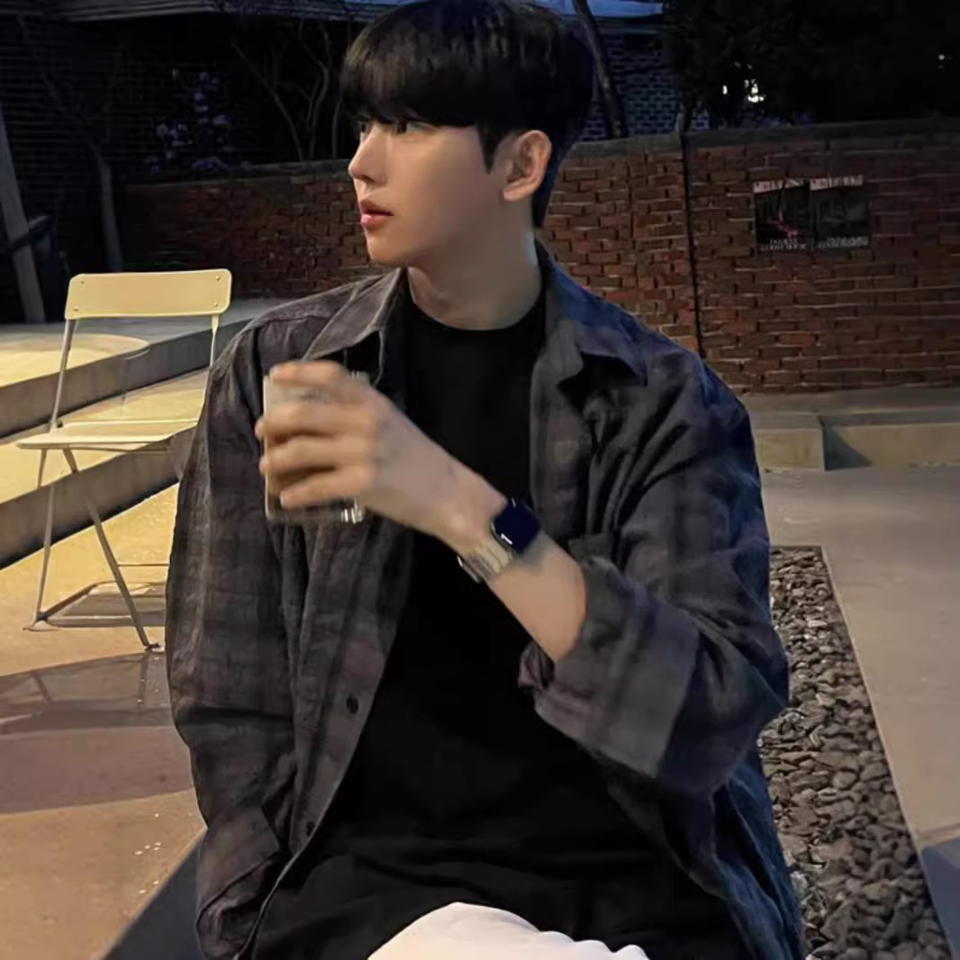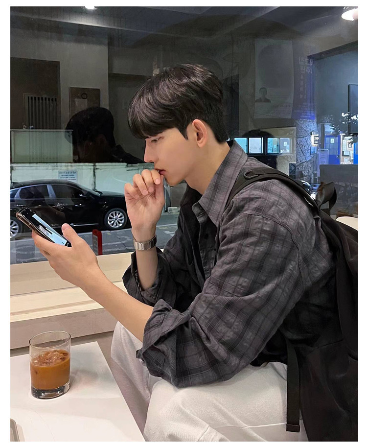 한국 스타일 Ouba 긴 소매 셔츠 남자 일본 스타일 복고풍 격자 무늬 유행 브랜드 느슨한 캐주얼 셔츠 봄과 가을 카디건 재킷