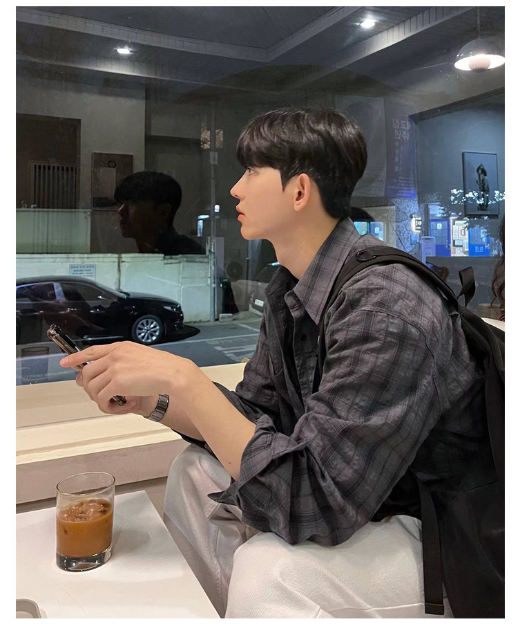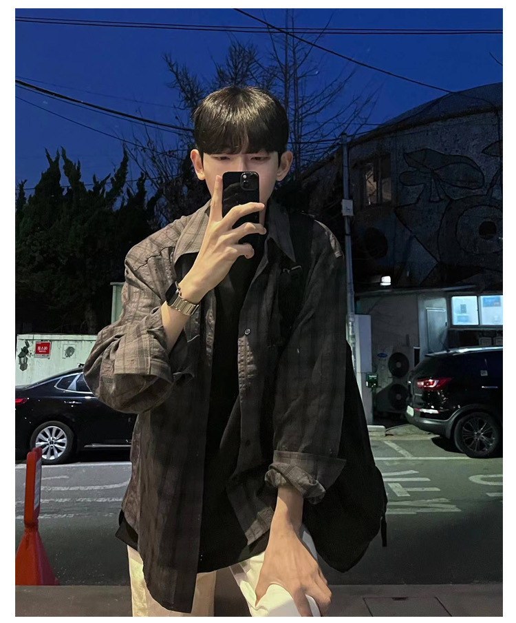 한국 스타일 Ouba 긴 소매 셔츠 남자 일본 스타일 복고풍 격자 무늬 유행 브랜드 느슨한 캐주얼 셔츠 봄과 가을 카디건 재킷스토어 가기