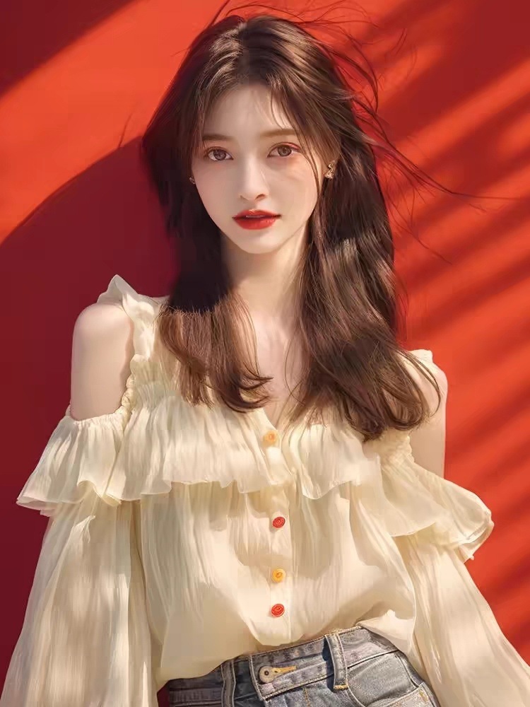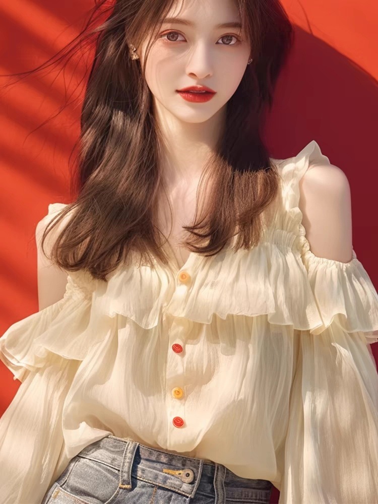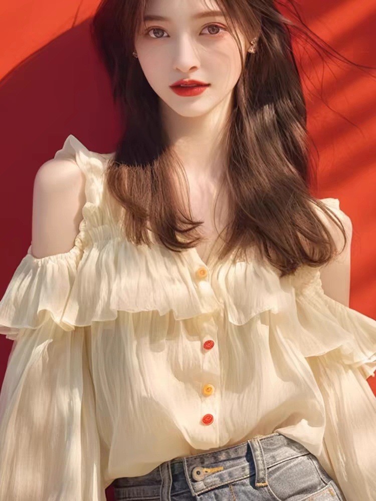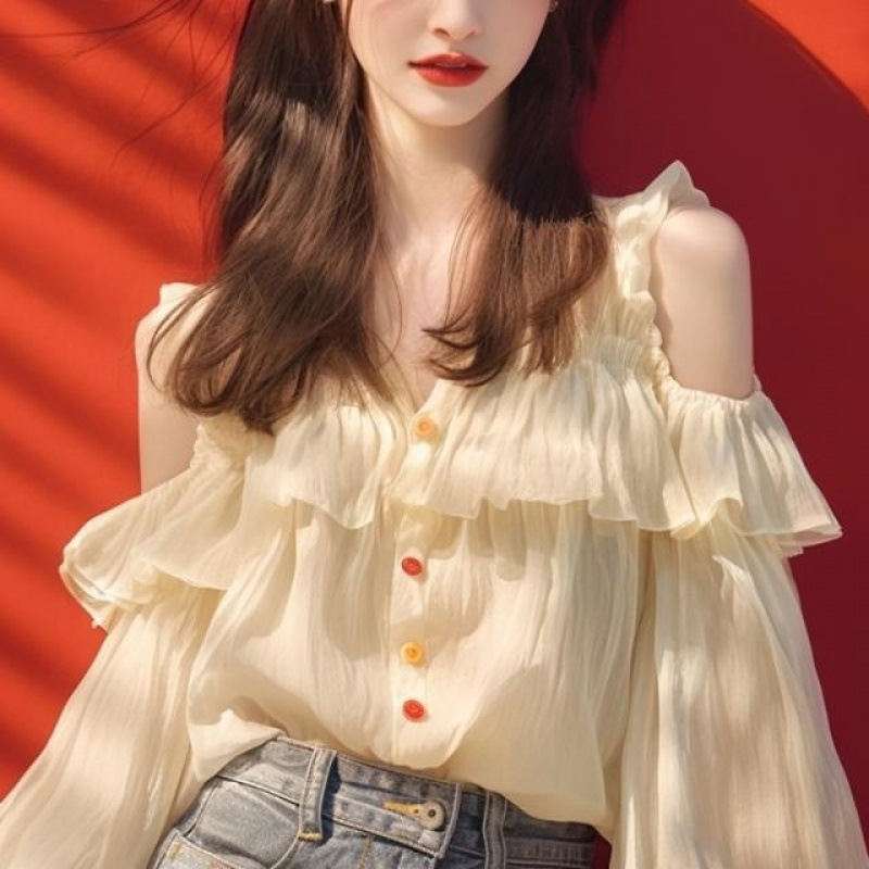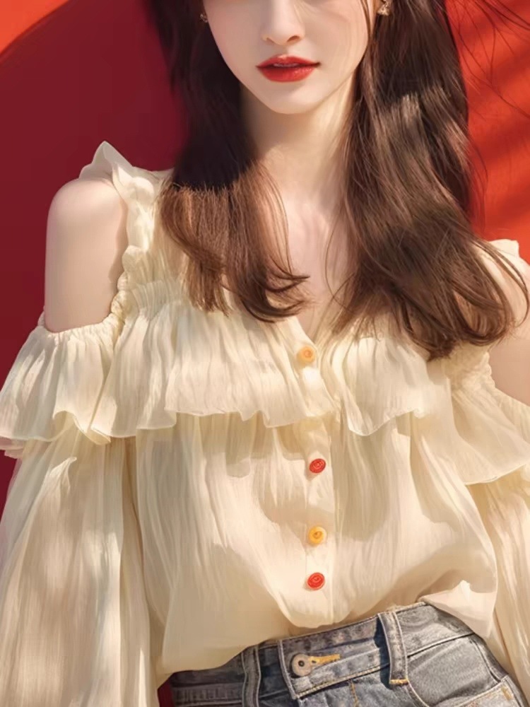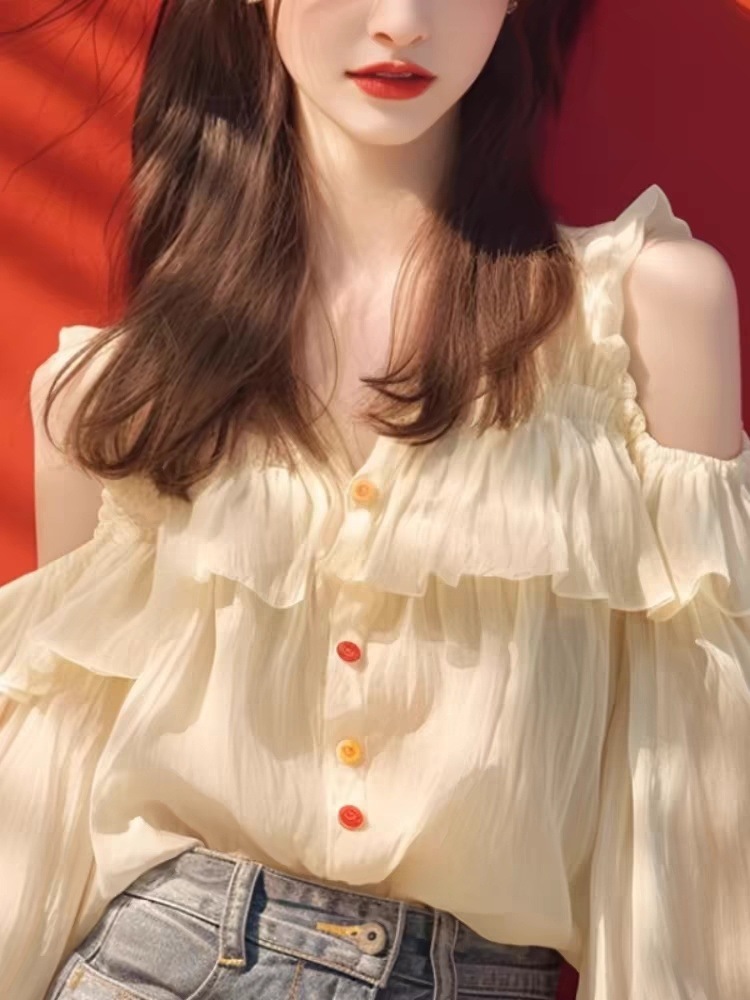 今年流行漂亮雪纺衫女夏季荷叶边高级感挖肩法式衬衫娃娃衫上衣服