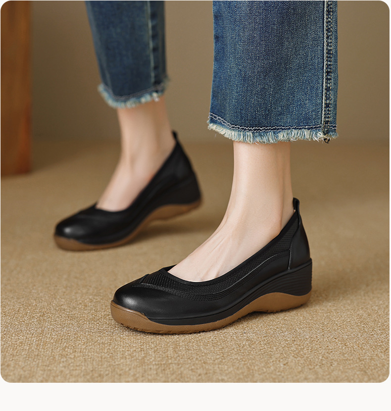 레트로 라이트 럭셔리 두꺼운 밑창 슬립온 여성용 진짜 소가죽 라운드 토 슈즈 2025년 가을 캐주얼 하이힐 가죽 신발