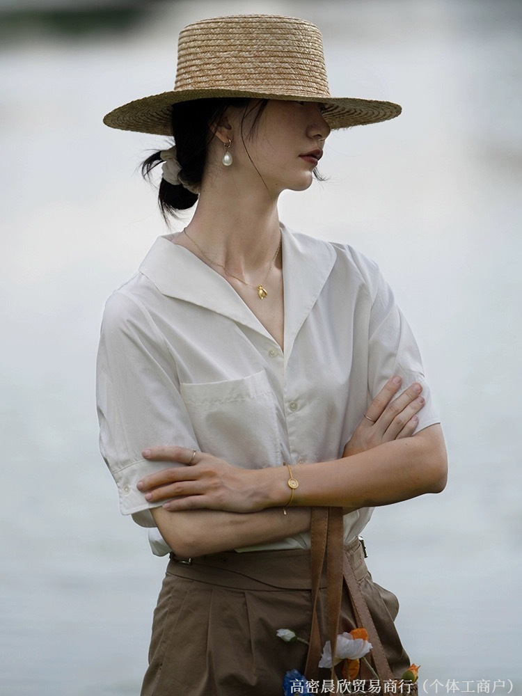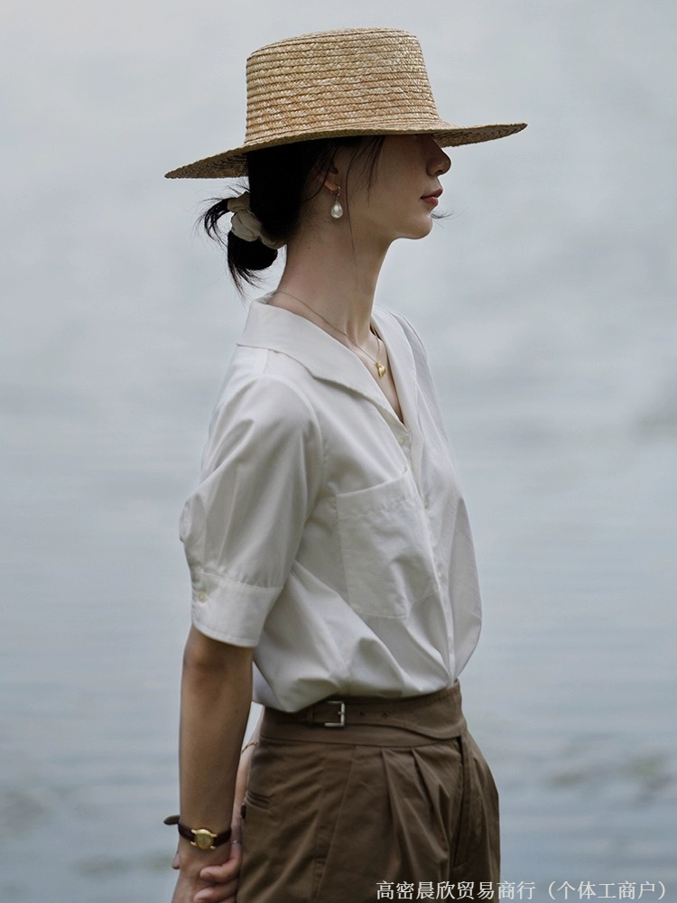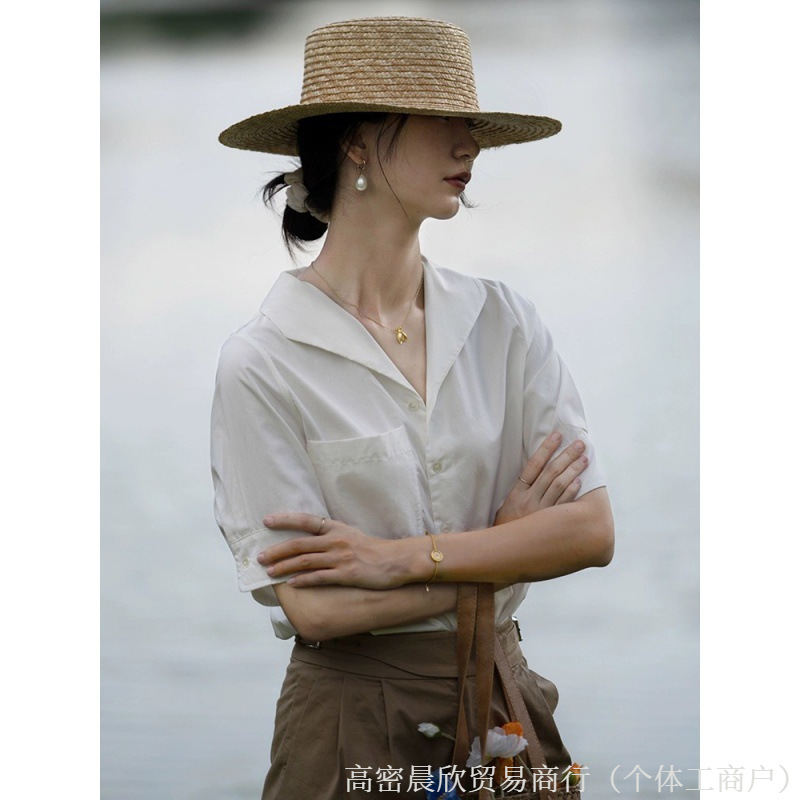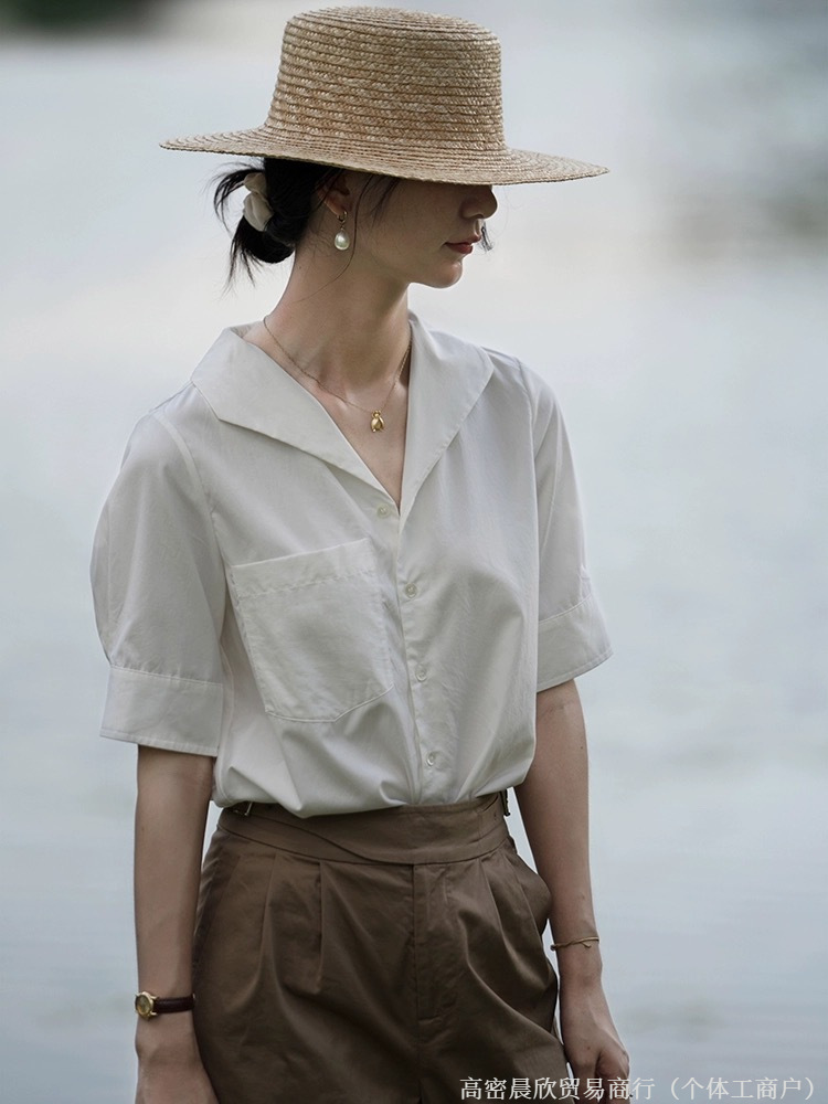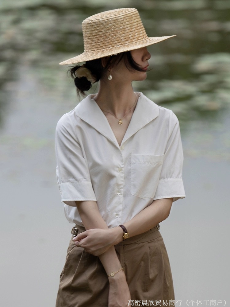 프랑스 스타일의 세련된 디자인 틈새 최고 짧은 소매 칼라 화이트 V-Neck 여성의 우아한 레트로 하이 엔드 셔츠 여름스토어 가기