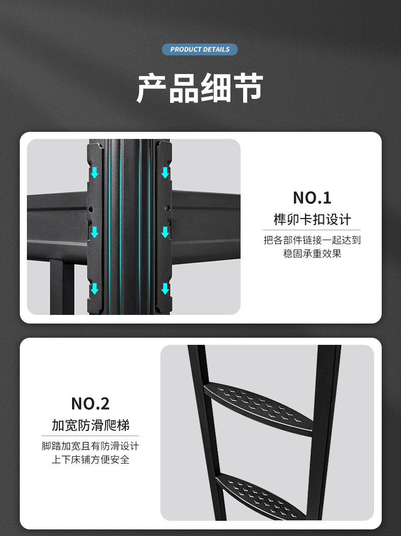 • 다층 침대 보드가 포함된 검정색 이중 사다리 침대 프레임