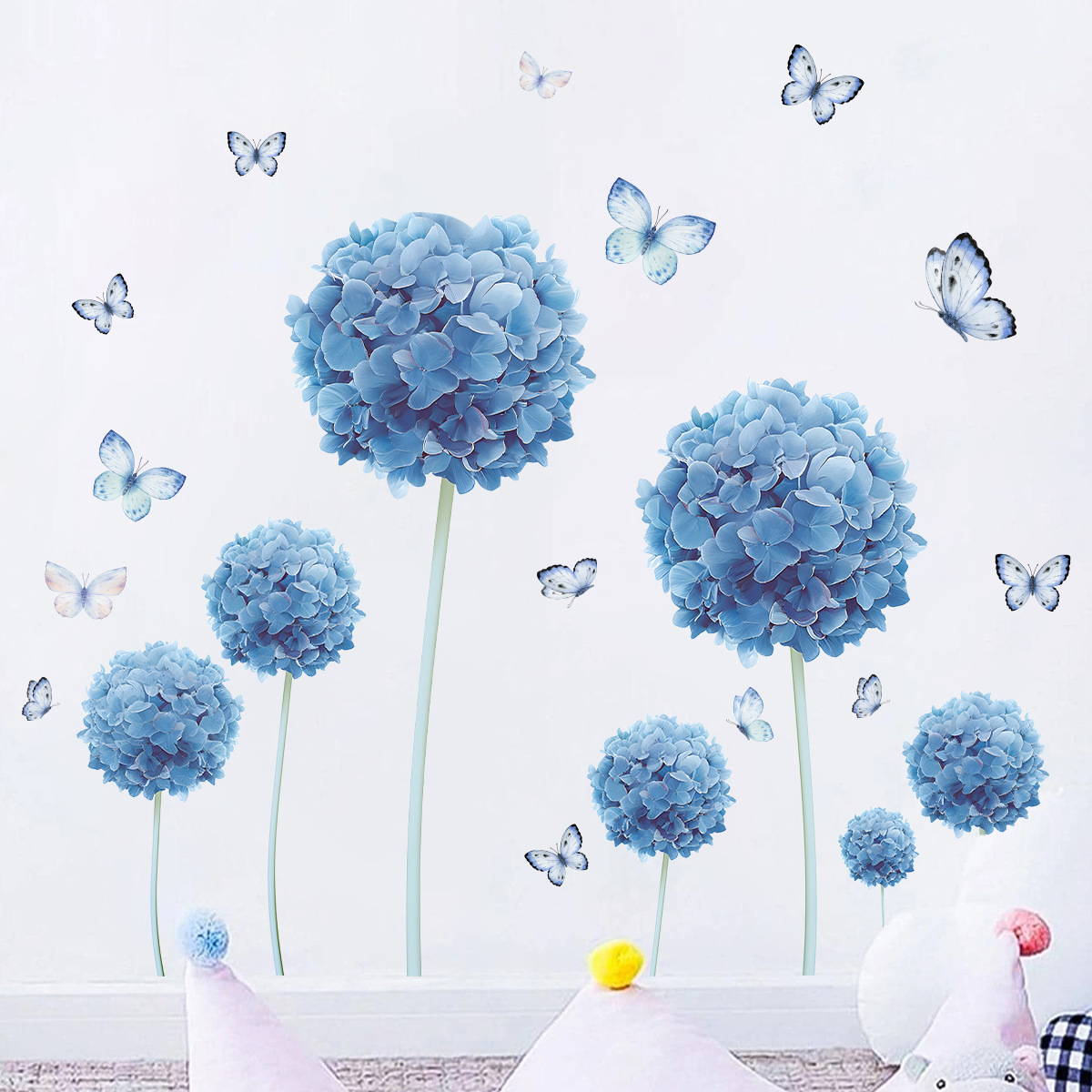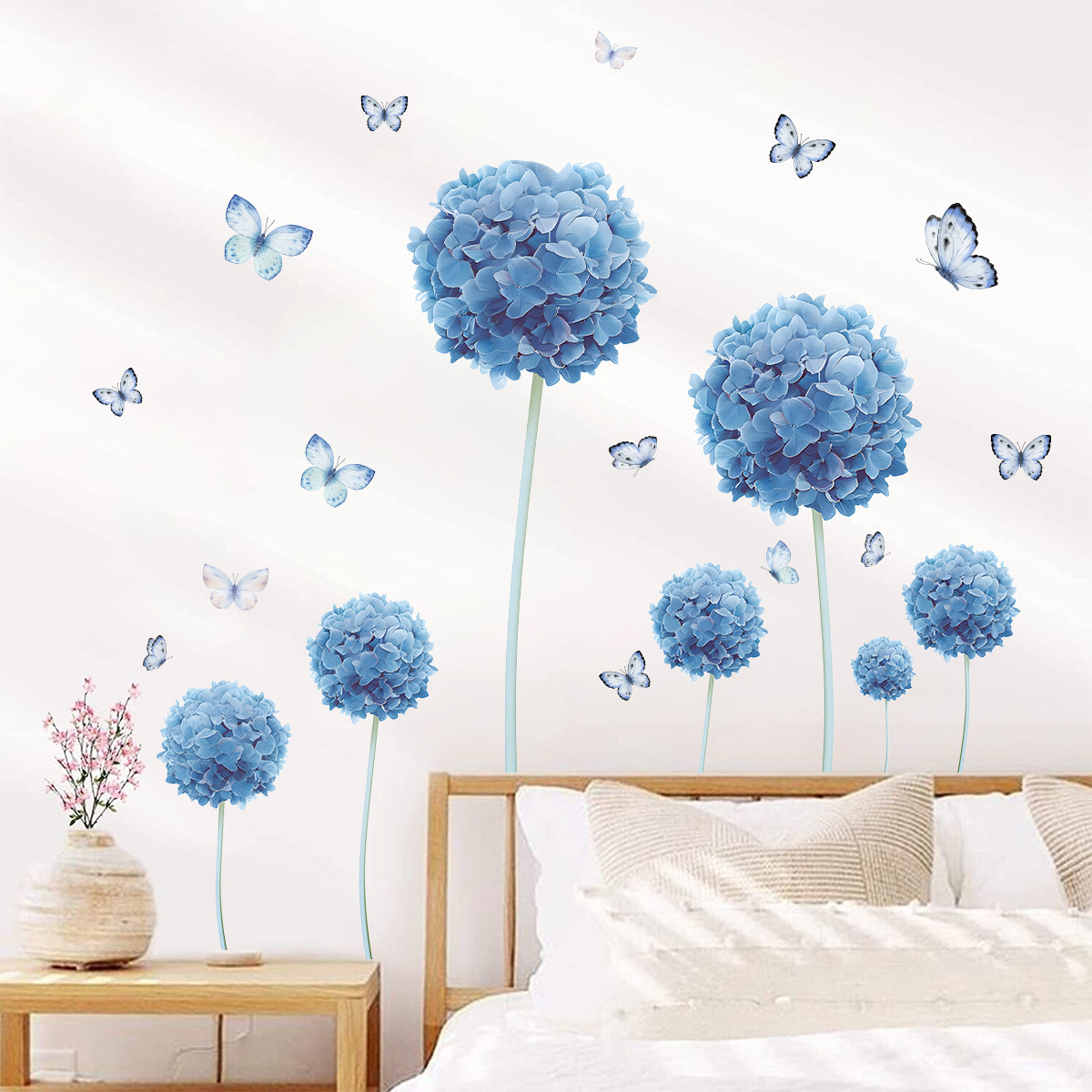 여름 신선한 푸른 꽃 나비 자체 접착 벽 스티커 Ins 스타일 룸 침실 거실 장식 스티커 HS0859F