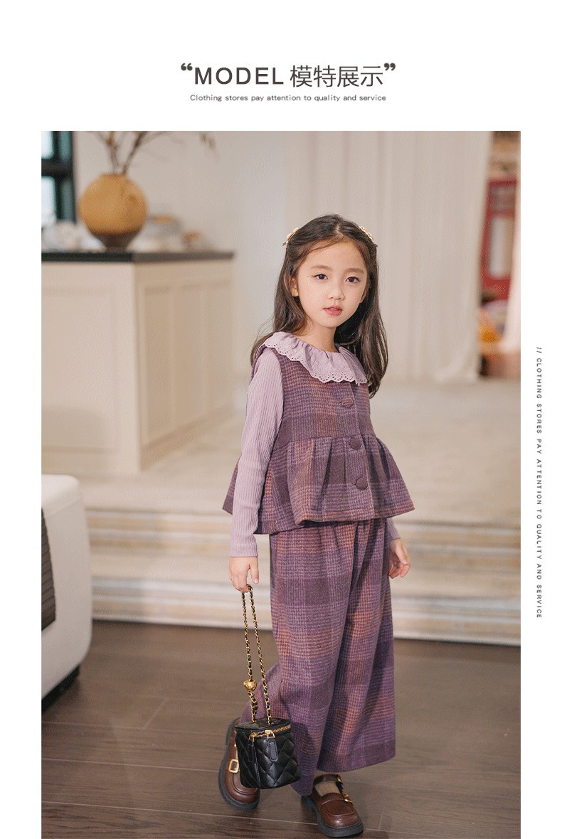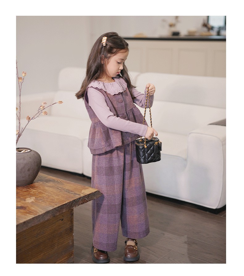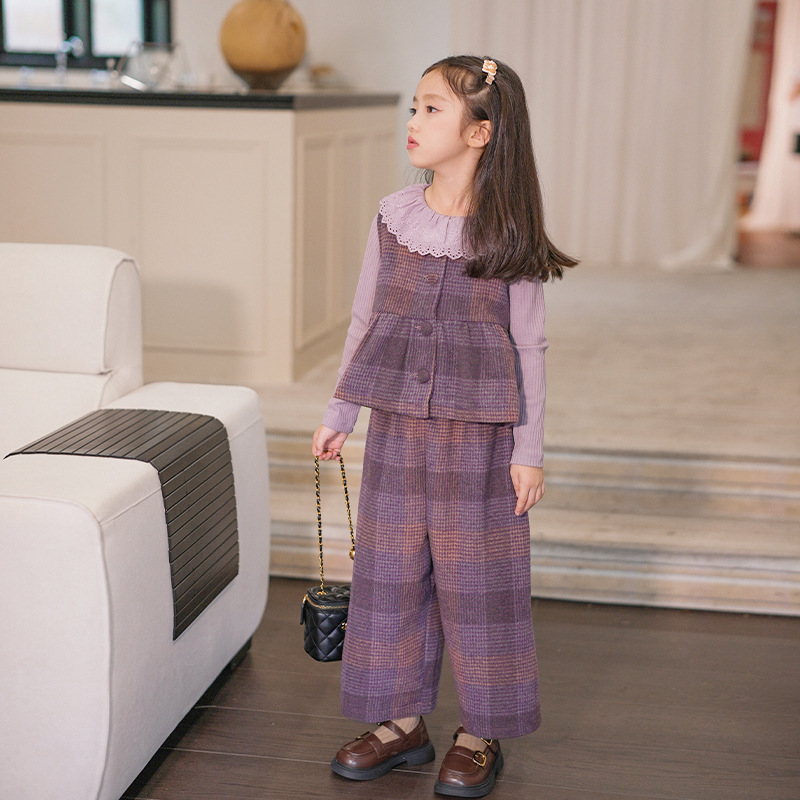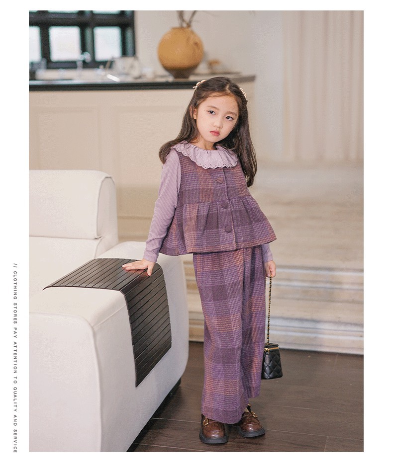 소녀의 가을 세트 보라색 격자 무늬 조끼 탑 넓은 다리 바지 투피스 서양식 빈티지 아동복스토어 가기