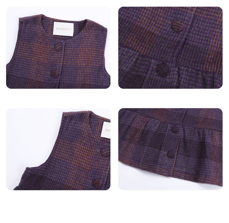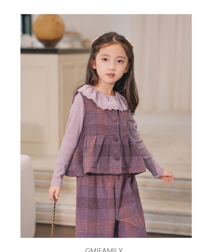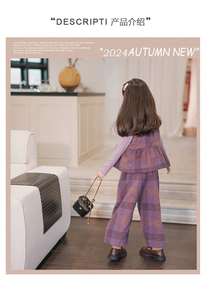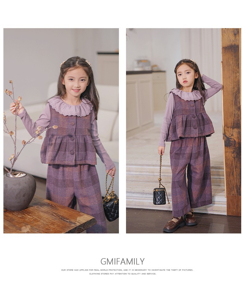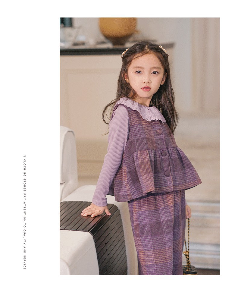 소녀의 가을 세트 보라색 격자 무늬 조끼 탑 넓은 다리 바지 투피스 서양식 빈티지 아동복스토어 가기