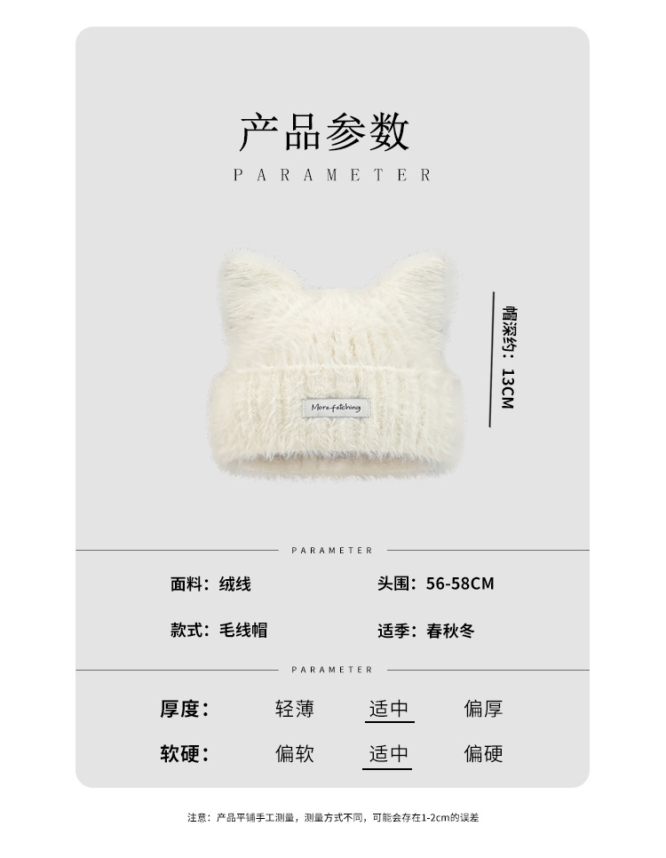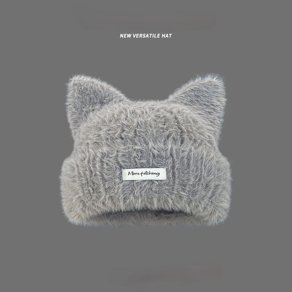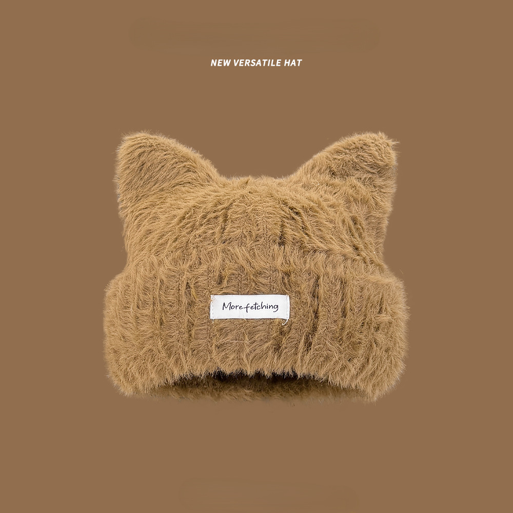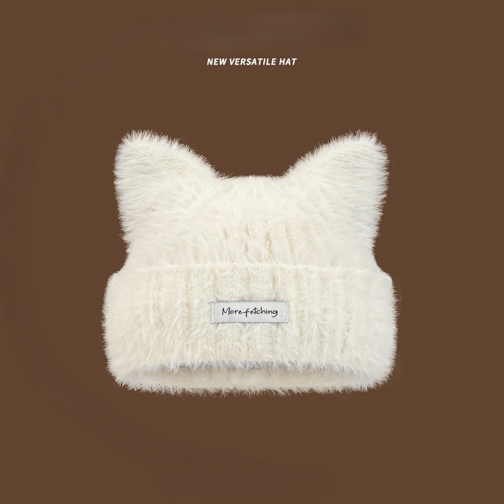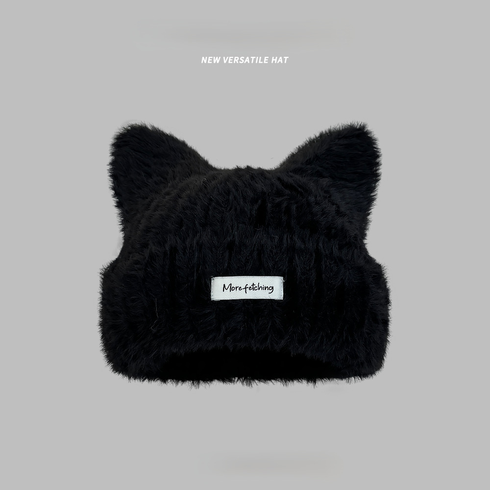 귀여운 고양이 귀 봉제 니트 울 모자 여성의 새로운 가을과 겨울 달콤한 따뜻한 올 매치 작은 라벨 니트 모자