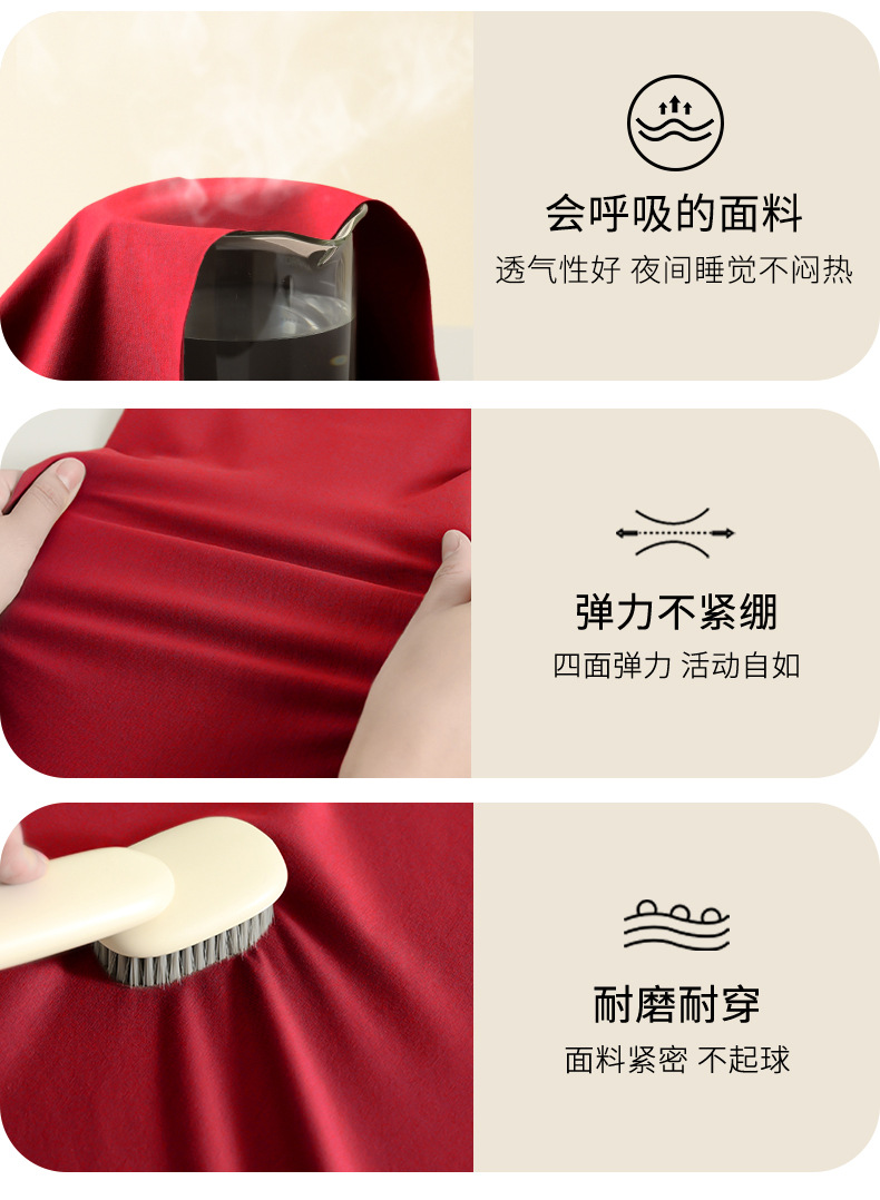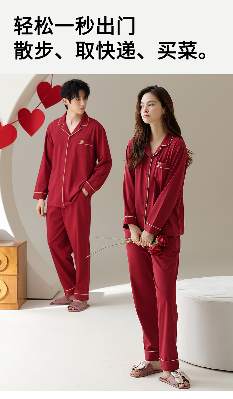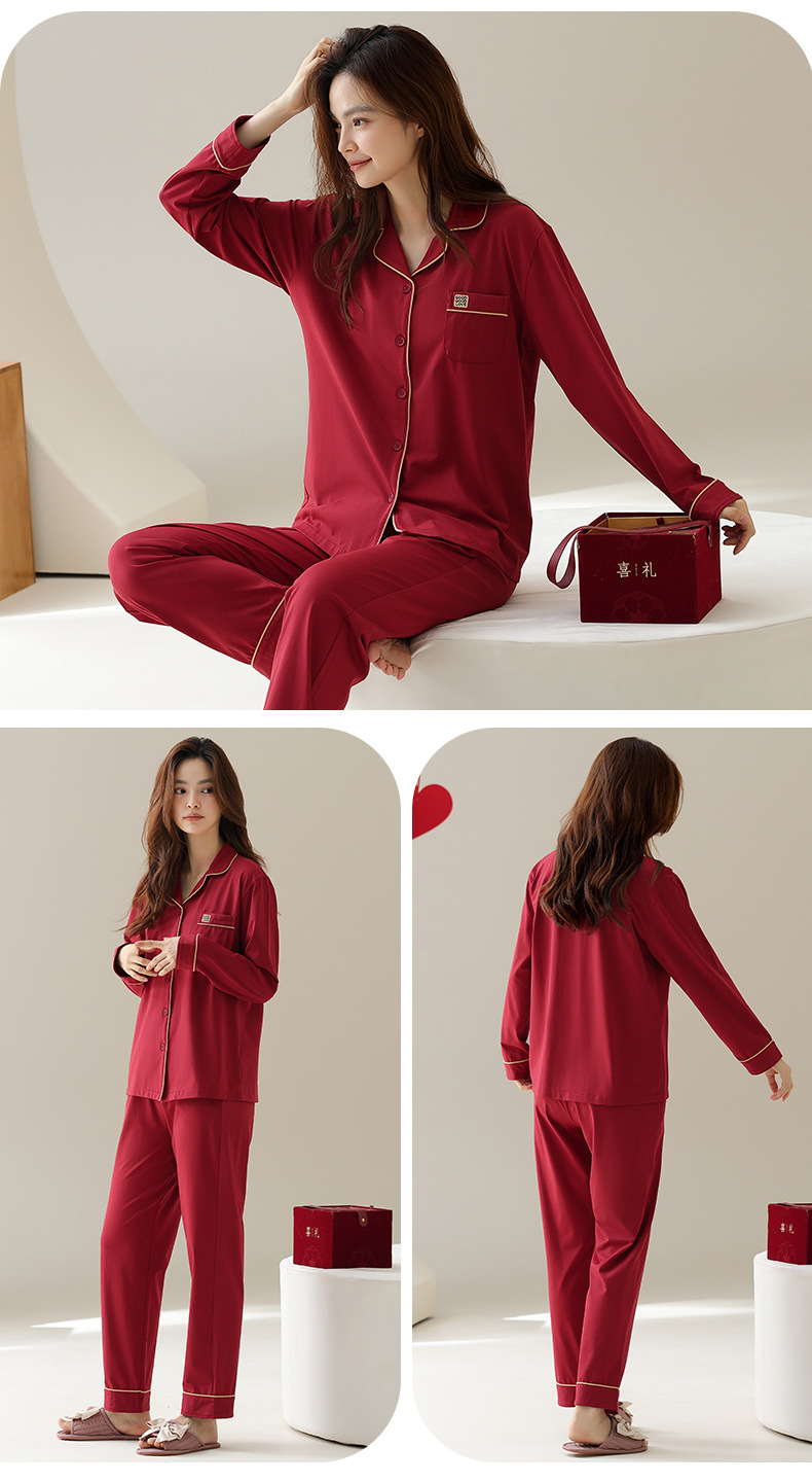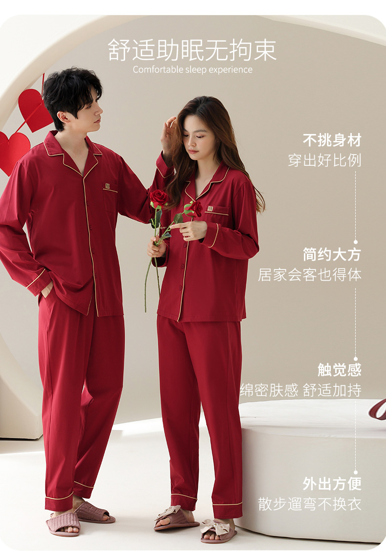 봄과 가을 버건디 남성과 여성을위한 긴 귀족 가족 커플 잠옷 라이크라면 긴 소매 축제 결혼식 세트