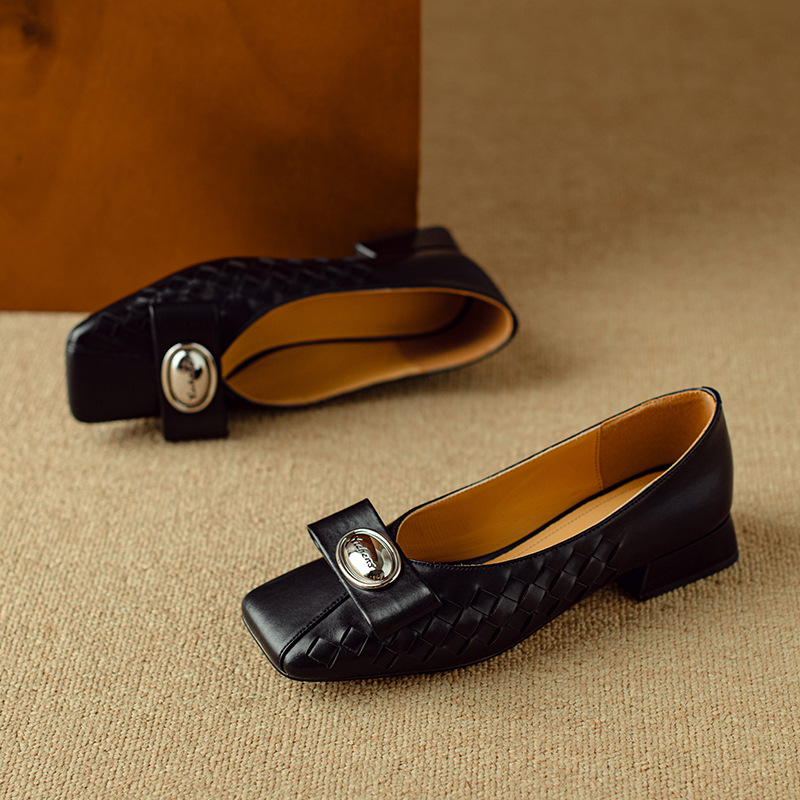 2024 가을 새로운 스퀘어 헤드 신발 여성의 얕은 두꺼운 힐 신발 짠 가죽 스퀘어 버클 아이보리 여성 신발 도매