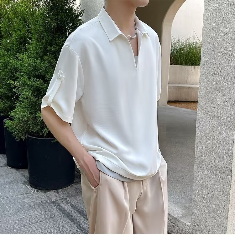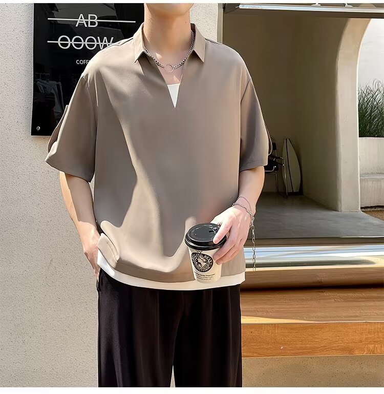 여름 트렌디 브랜드 하이 엔드 아이스 실크 티셔츠 남성 디자인 센스 페이크 투피스 V 넥 반팔 폴로 셔츠 남성 옷깃 라이트 성숙한 스타일스토어 가기